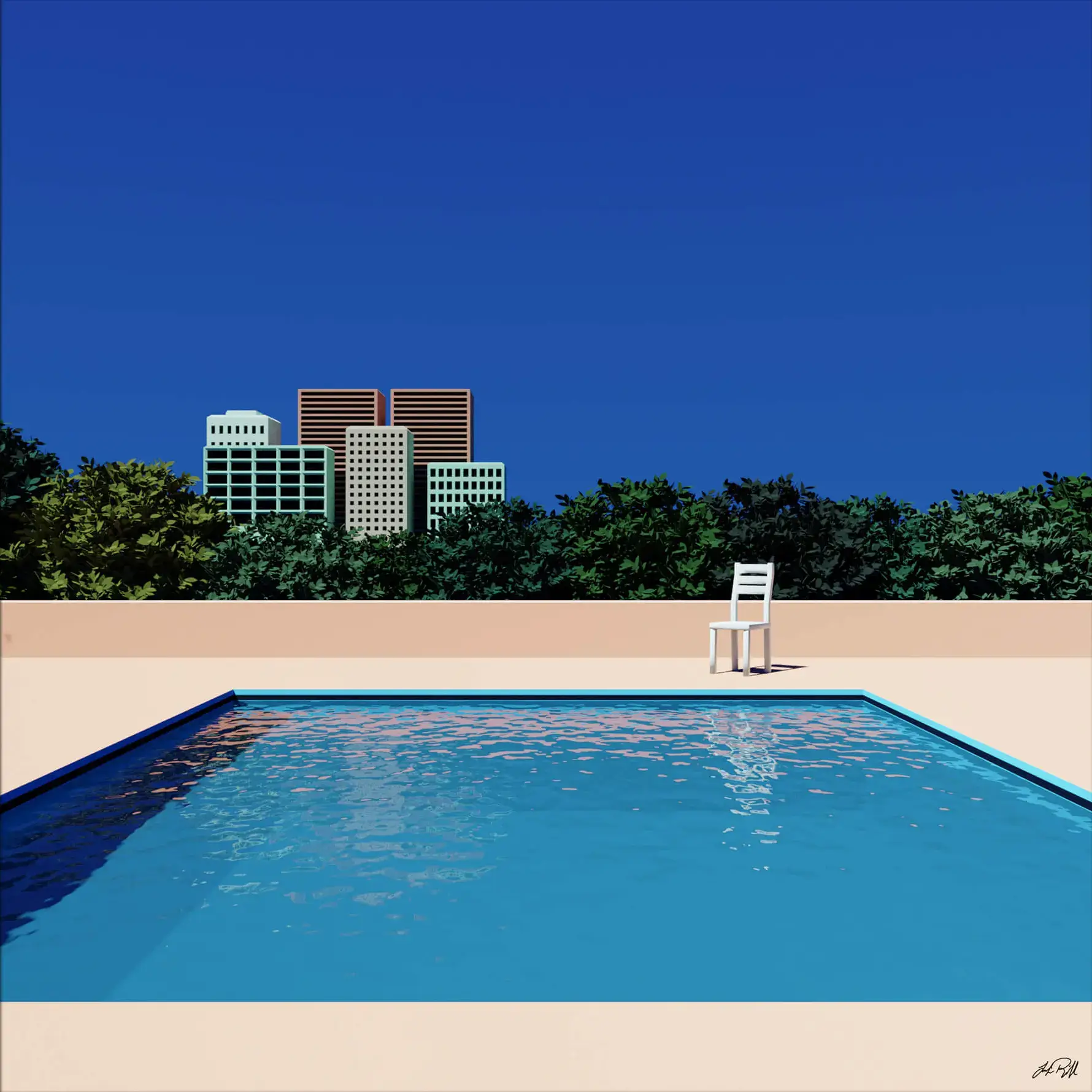 A single white lifeguard chair stands beside a rooftop pool, reflecting the clear blue sky above. In the distance, a row of stylized buildings emerges above lush green treetops, suggesting an urban oasis. The scene is quiet and still, evoking a sense of secluded relaxation high above the city.