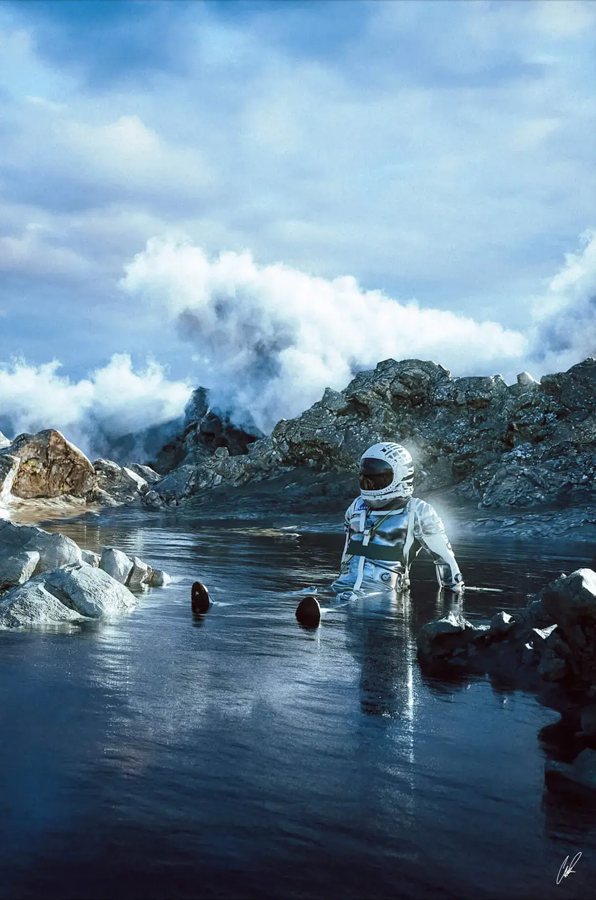 An astronaut sits midstream, surrounded by the rugged beauty of a mountainous landscape. In this CGI surreal artwork by CaptvArt, the spaceman’s reflection ripples through the water, marrying the depths of the cosmos with the serenity of nature.