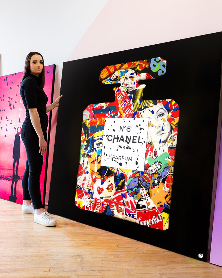Bold and eclectic, this artwork melds pop art sensibilities with the timeless elegance of Chanel No. 5, creating a statement piece that is as much a celebration of fashion as it is a striking visual feast. It’s an homage to iconic style and culture, perfect for adding a touch of glamour and artistic flair to any space seeking a fusion of classic and contemporary influences.