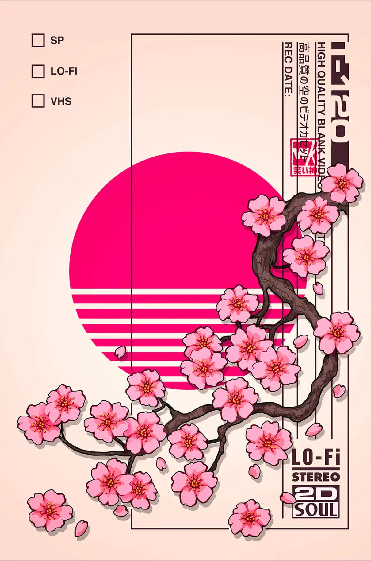 Sakura blossoms are gracefully arranged on dark, winding branches, set against a minimalist background. A bold, magenta sun with horizontal stripes, adds a modern, vaporwave element to the traditional floral motif, while Japanese text and graphic symbols are incorporated into the design, giving it a retro feel, reminiscent of vintage cassette tape covers.