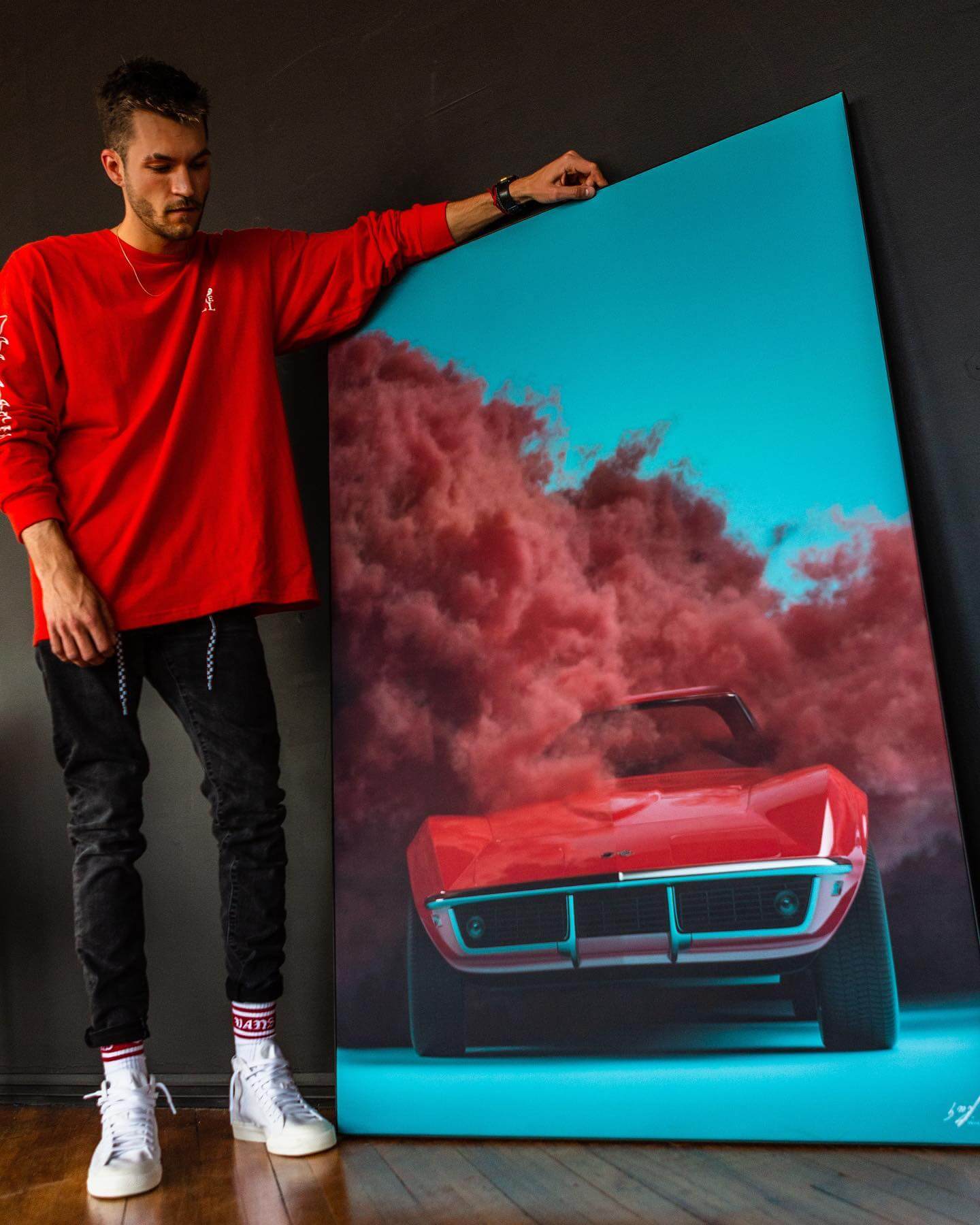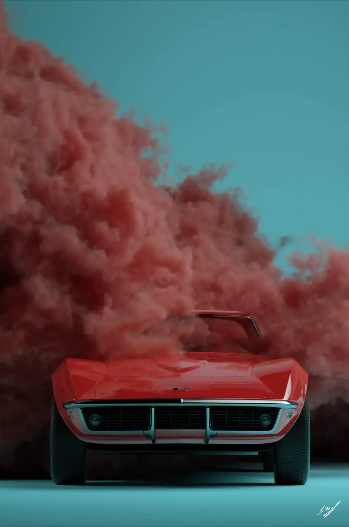 A cherry-red Corvette sits confidently, a contrast to the soft billows of red smoke that surround it. Its sharp front lines and pop-up headlights give it a predatory stance on the cool blue background, while the smoke adds a dreamy quality to the scene, softening the edges of reality.
