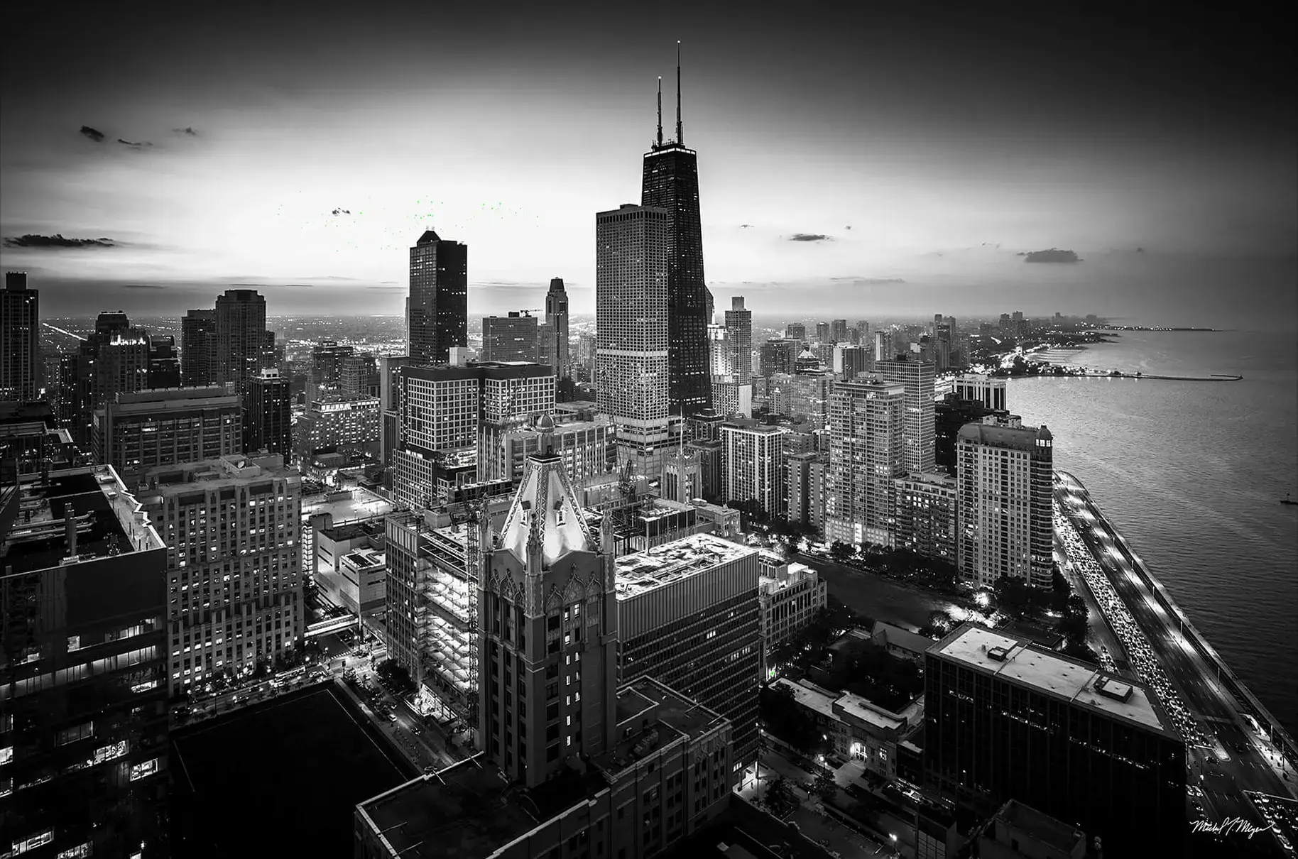 This stunning aerial view of Chicago’s downtown loop is captured in striking black and white, highlighting the city’s iconic skyline against a backdrop of a fading twilight sky. The photograph showcases notable structures, including the Willis Tower and the historic buildings of the loop, all meticulously detailed in monochrome. The intricate patterns of the streets and the reflections of the city lights in the water add depth to the composition, evoking a sense of urban sophistication. This artwork beautifully encapsulates the vibrant energy of Chicago, making it a captivating addition to any space.