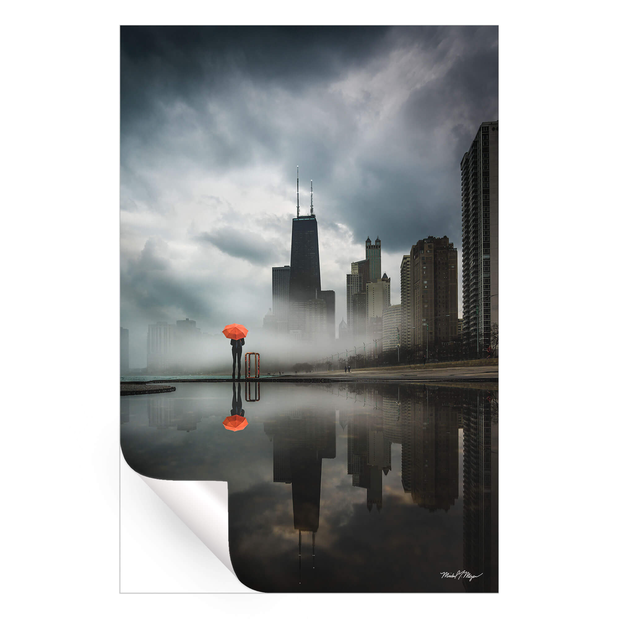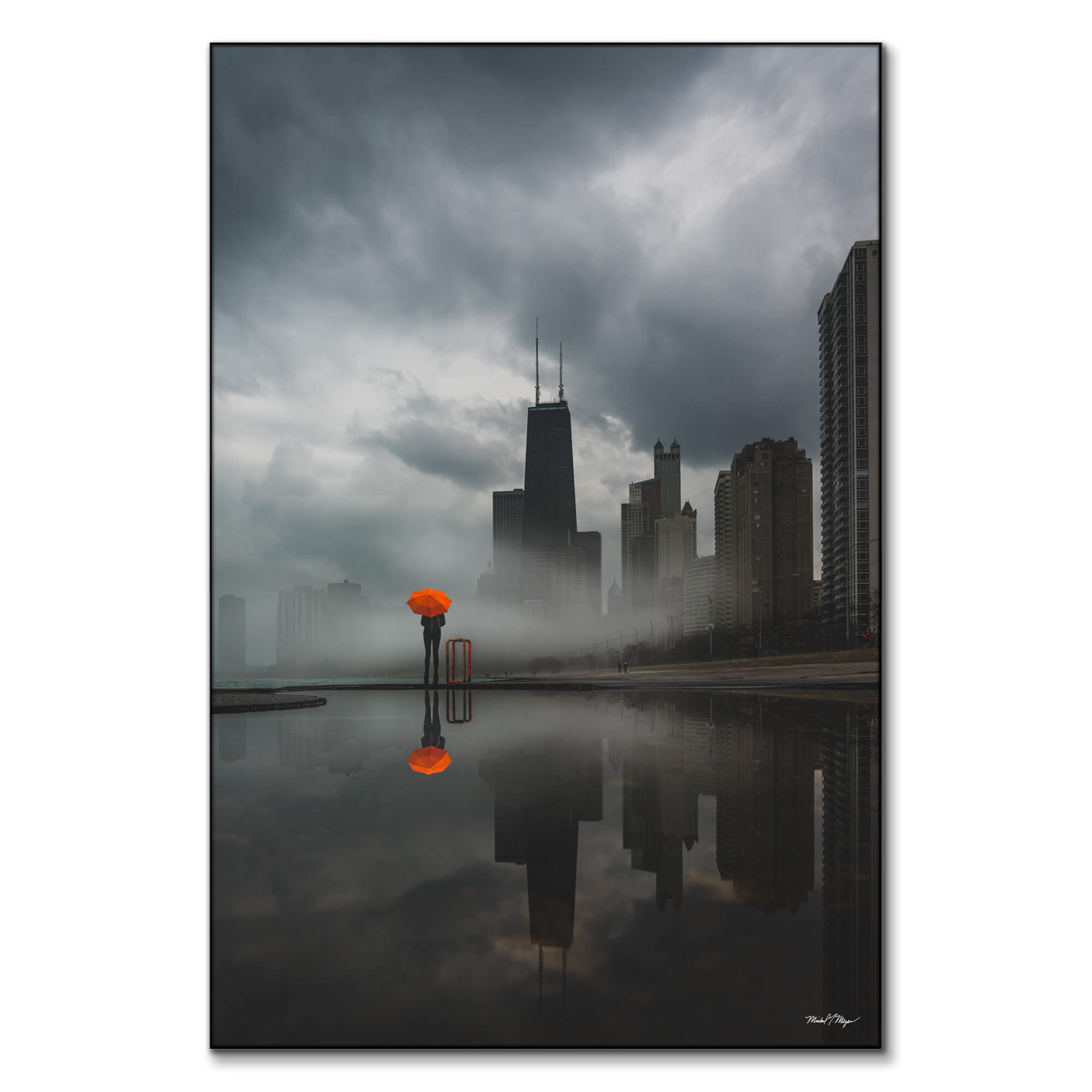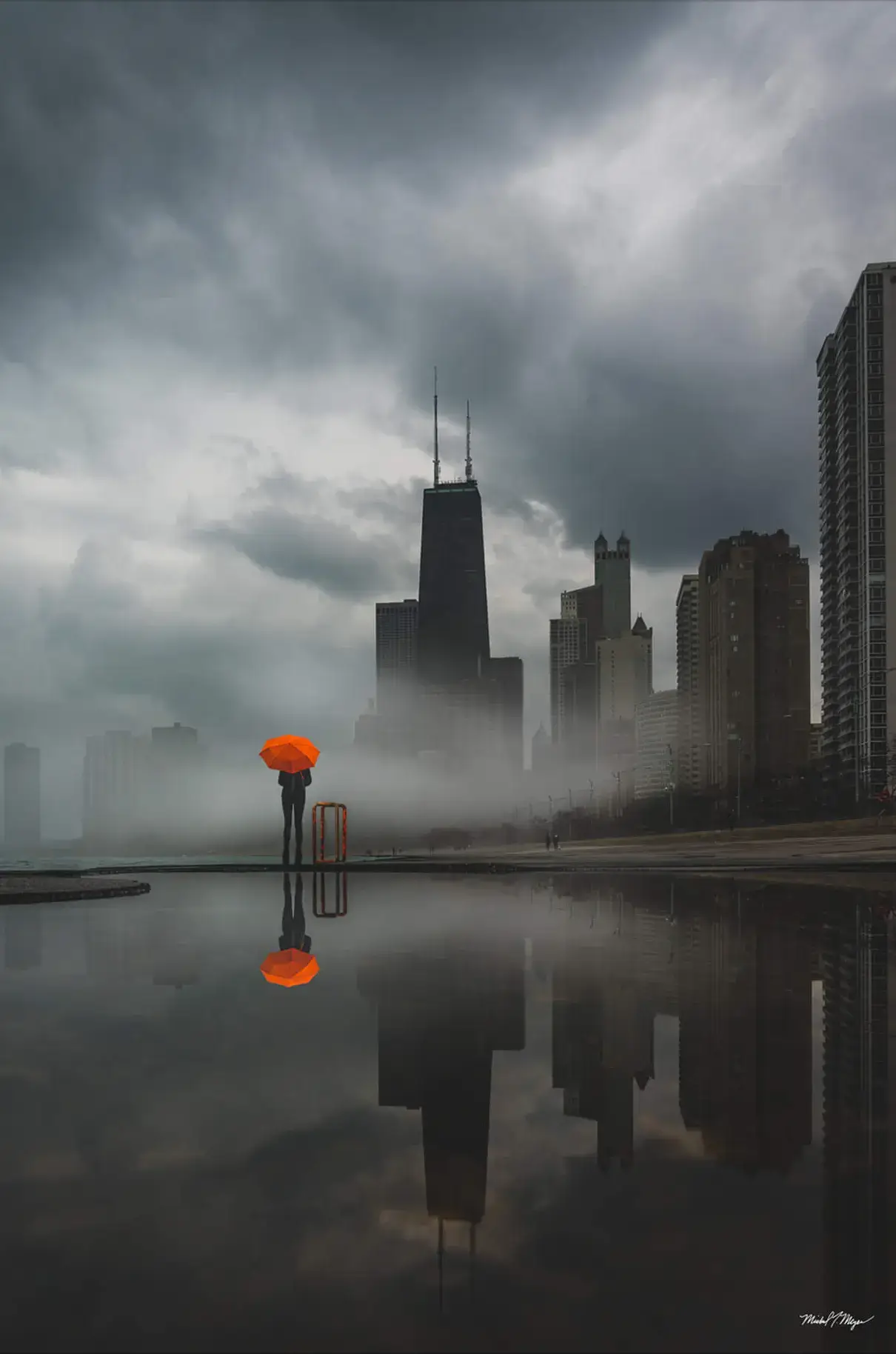 A solitary figure stands under a vibrant orange umbrella amidst a moody and misty Chicago backdrop. The city’s towering skyscrapers are half-veiled by the fog, lending an air of mystery to the scene.