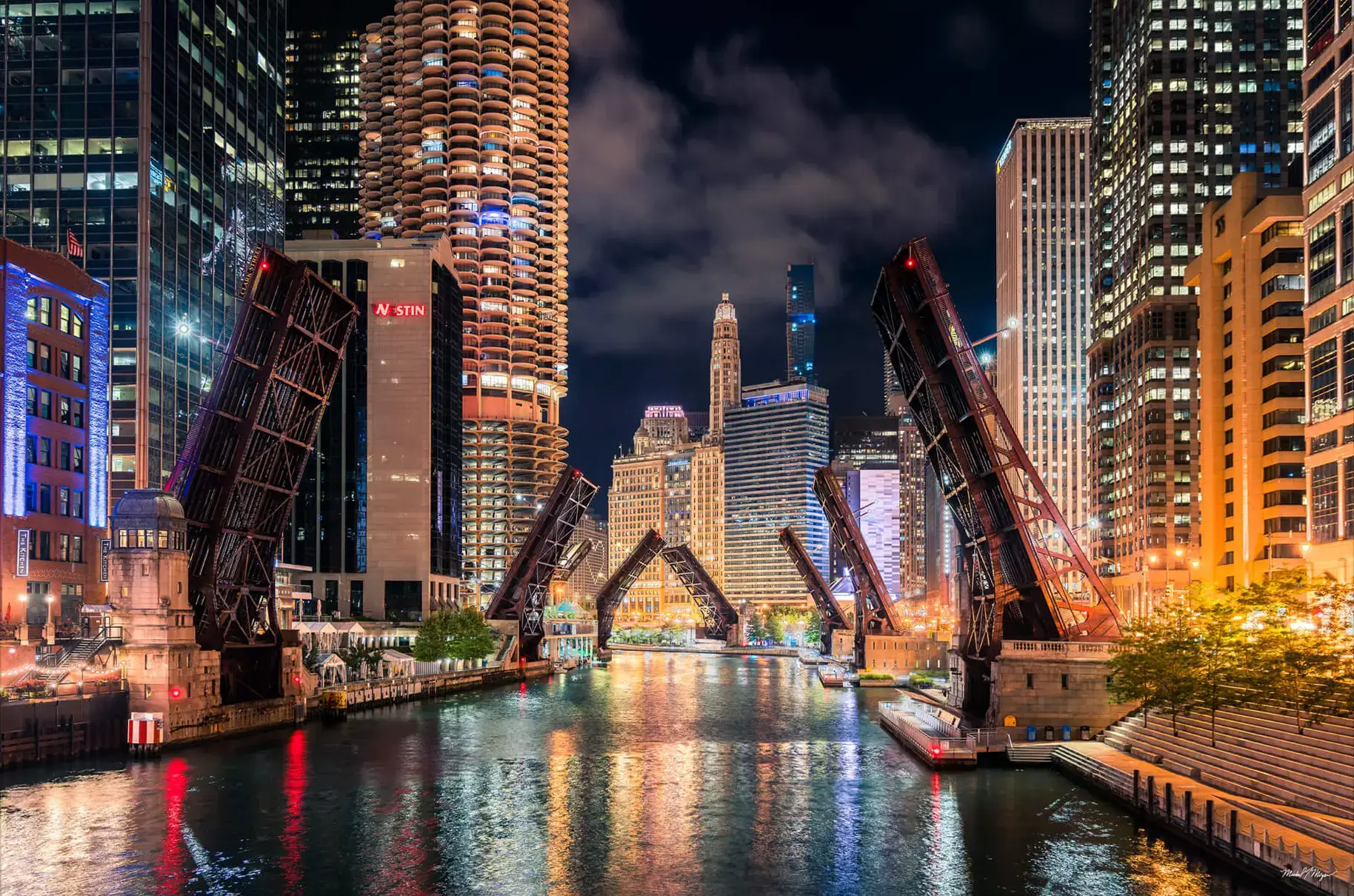 The Chicago River glows in the evening light, flanked by the city’s iconic architecture and the raised arms of its famous drawbridges.