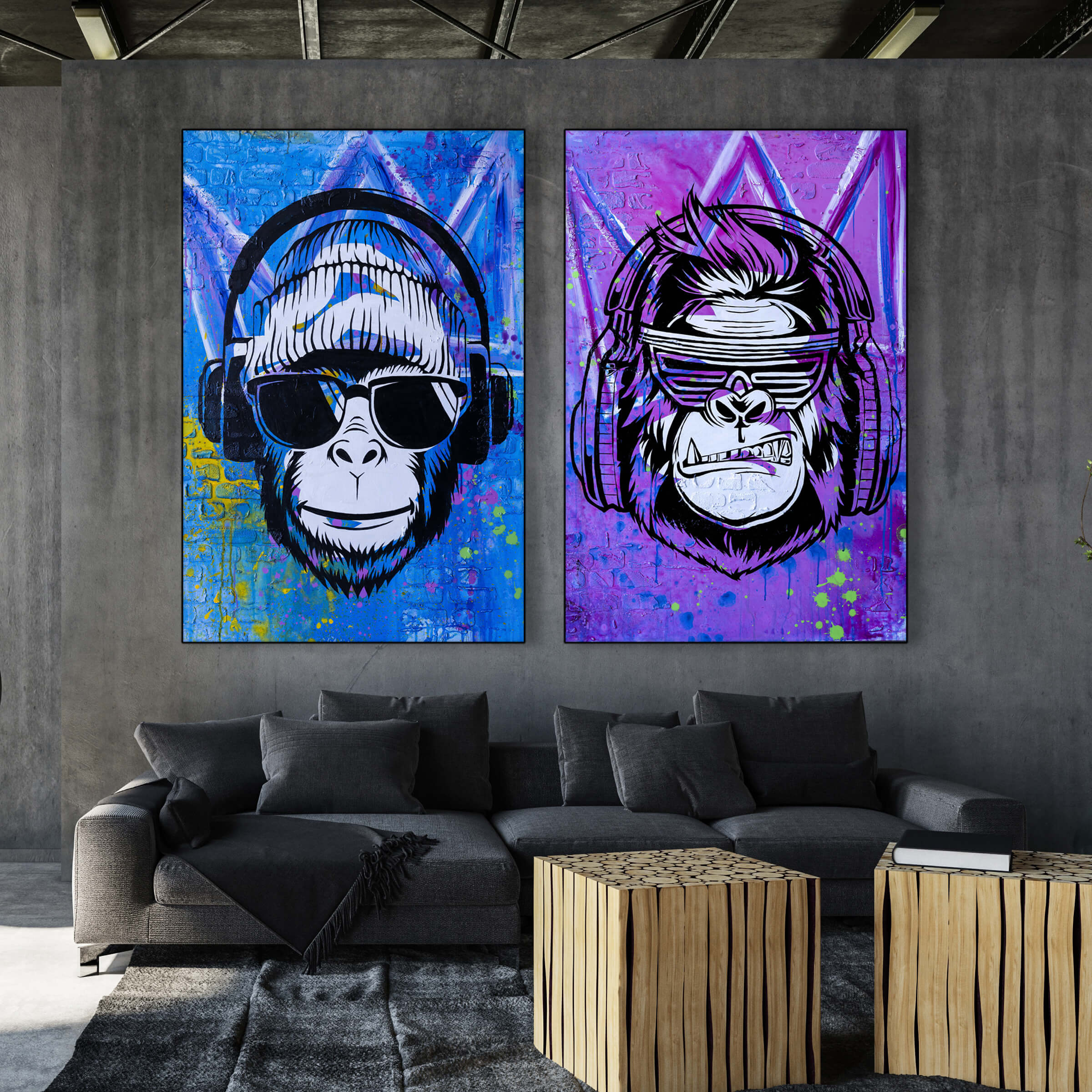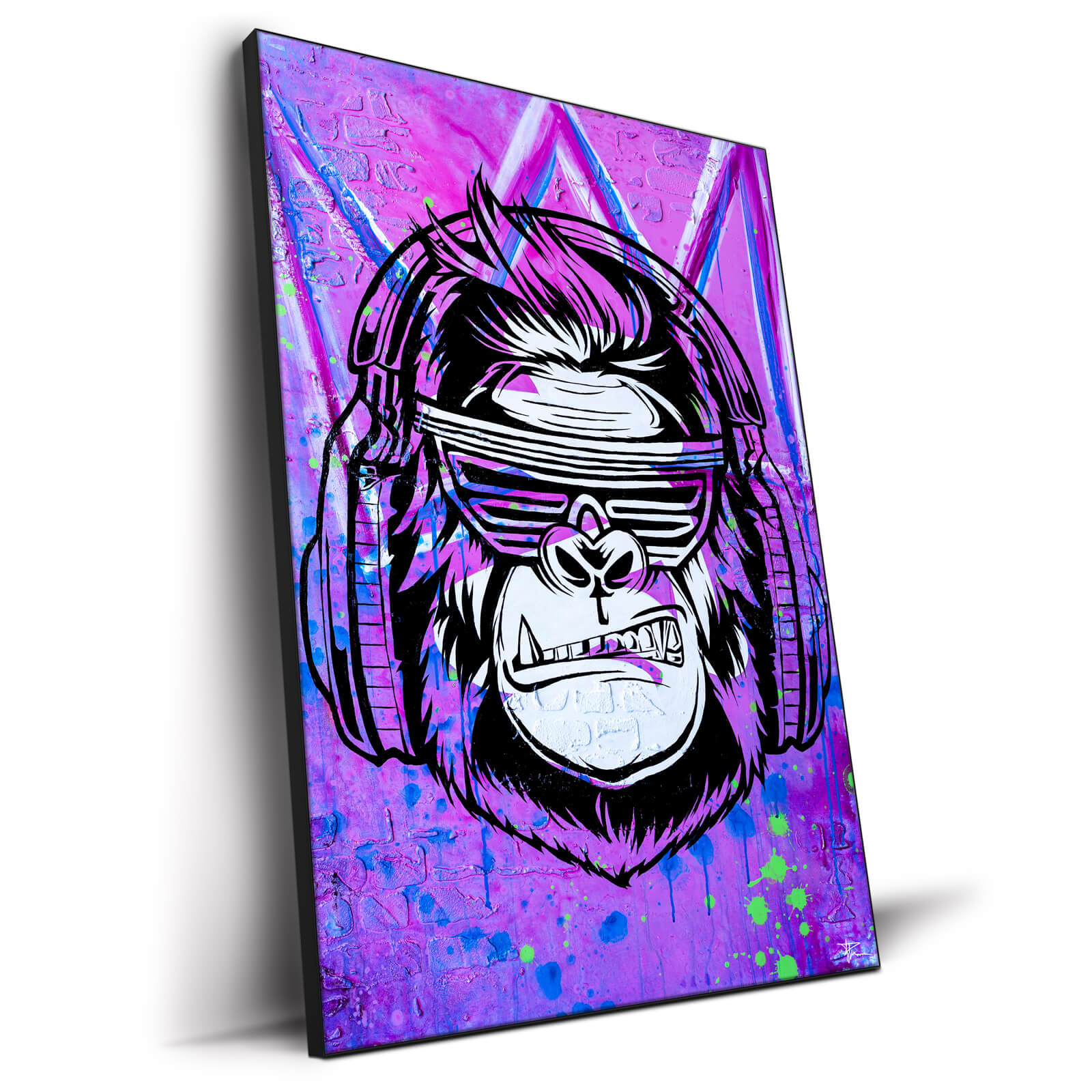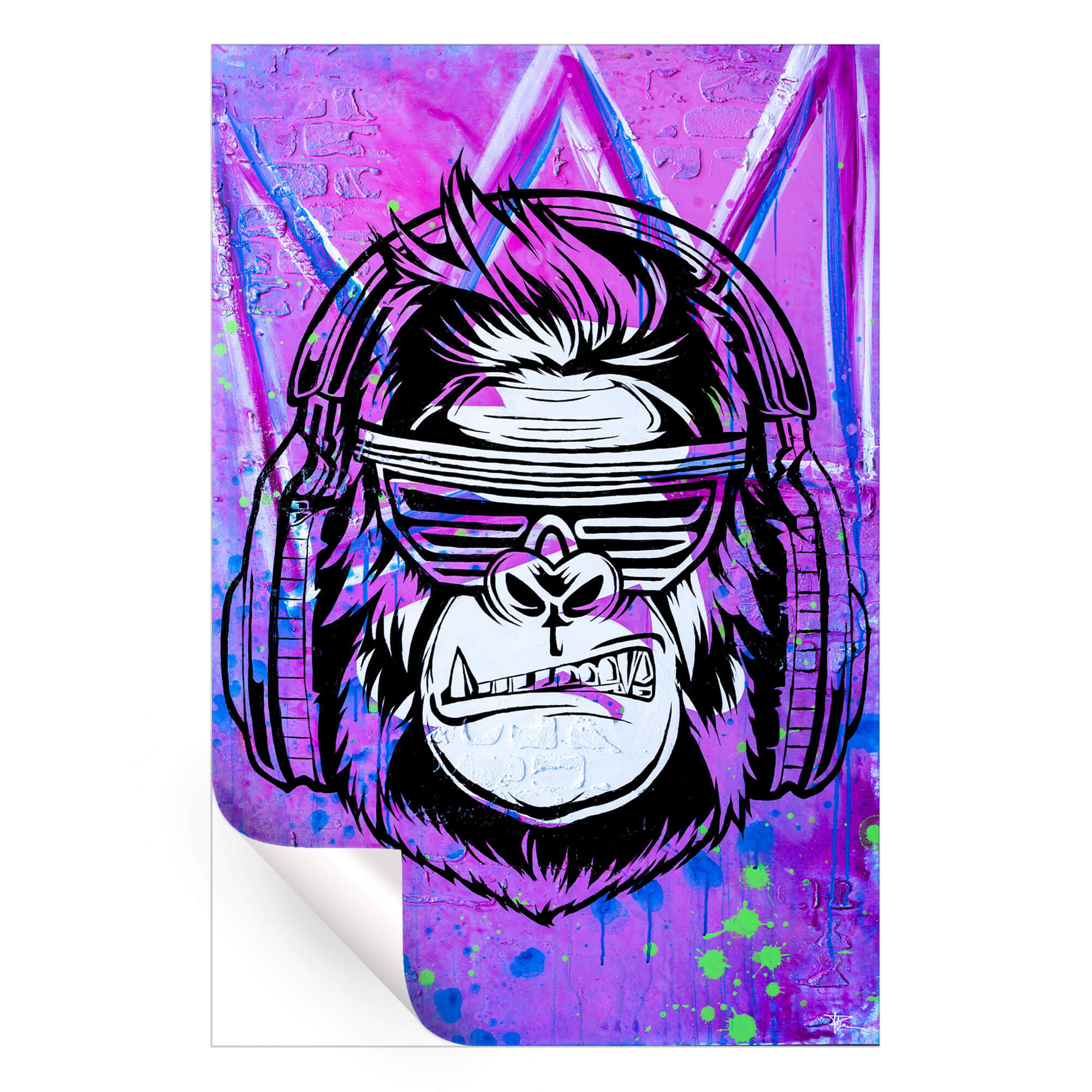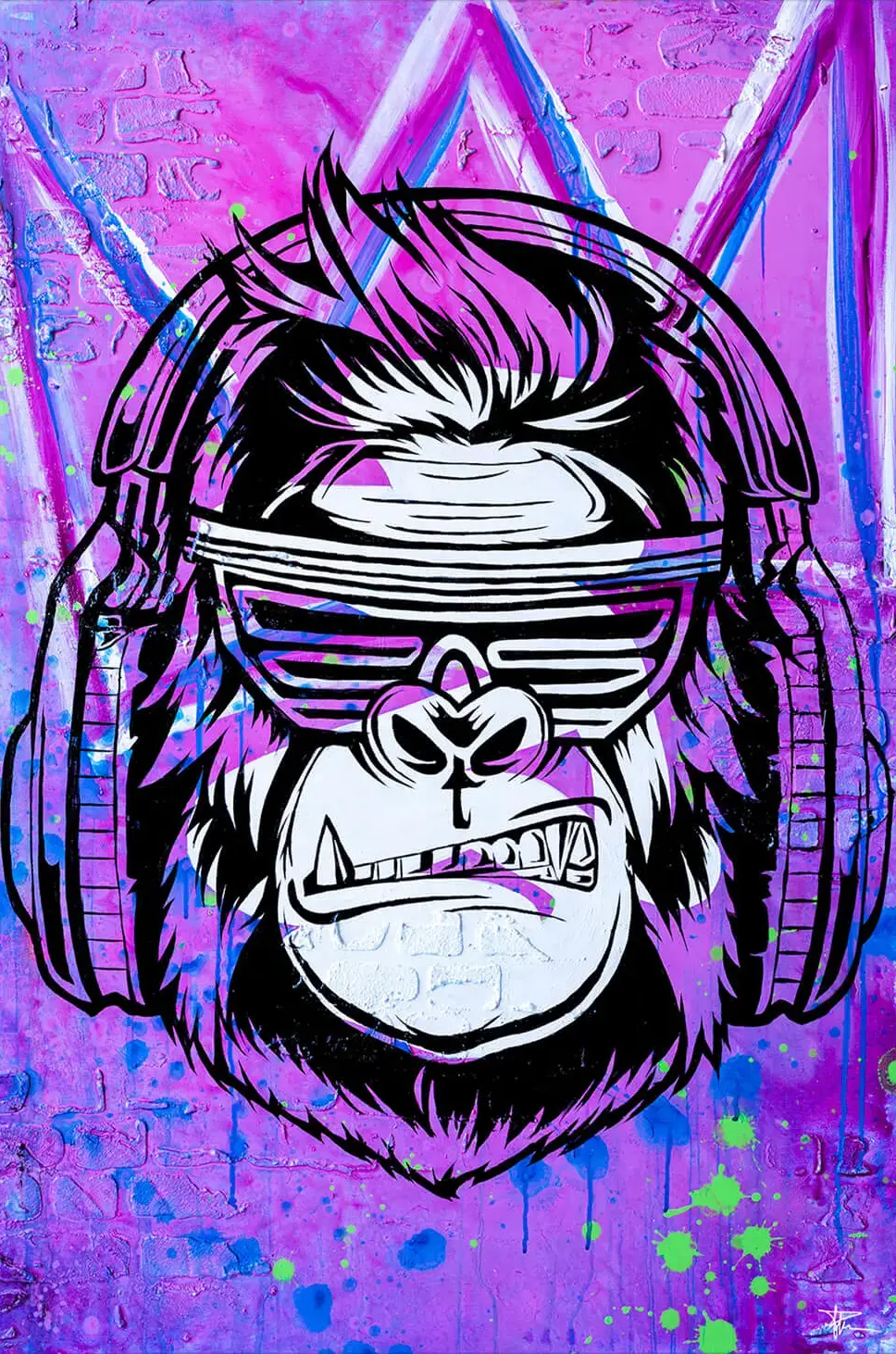 In a splash of pink and purple, P Muir’s artwork captures a chimp with headphones, a symbol of the gaming culture’s heart beating in the city’s street art scene. His sunglasses hint at endless digital worlds, while bright paint drips add a playful edge.