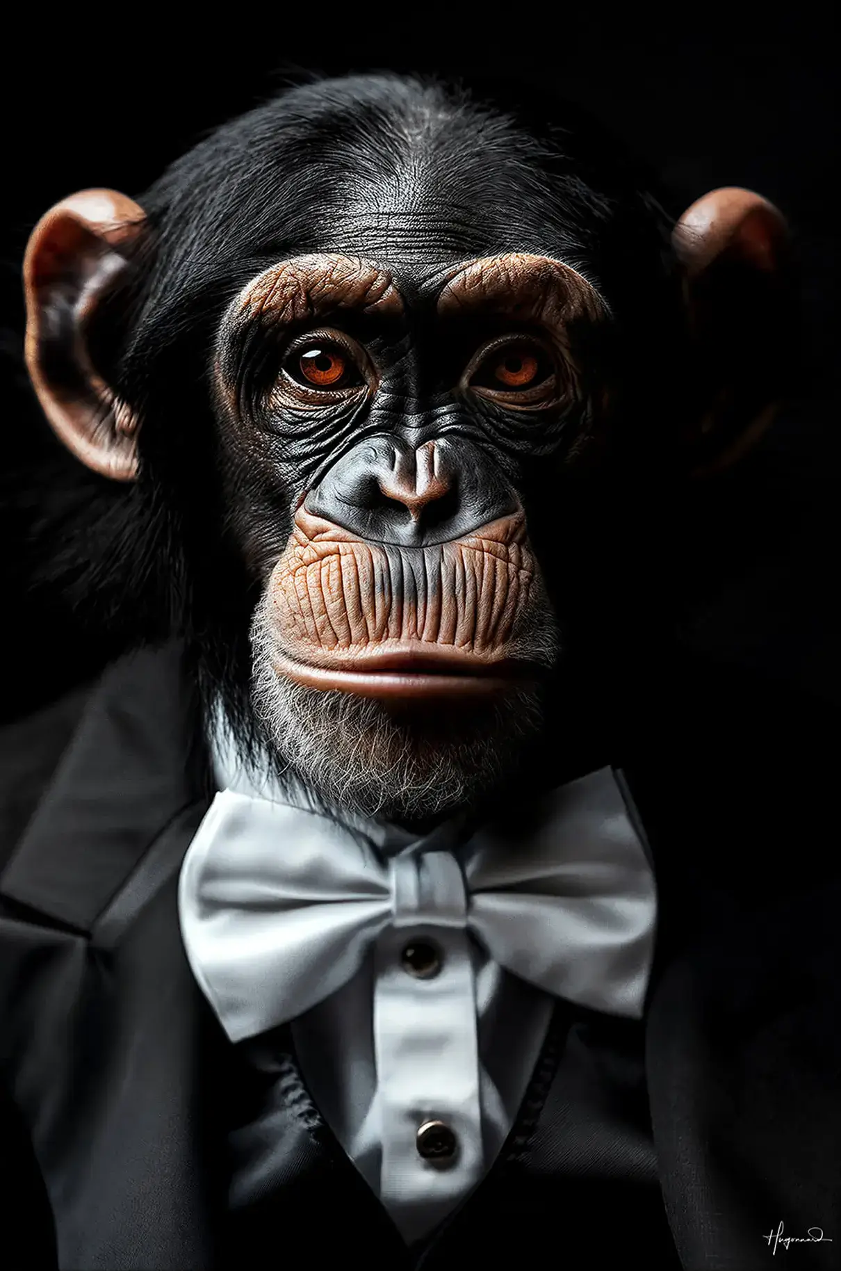 A chimpanzee in a classic tuxedo exudes sophistication and charm. The expressive features and polished outfit make this piece a striking addition to any décor.