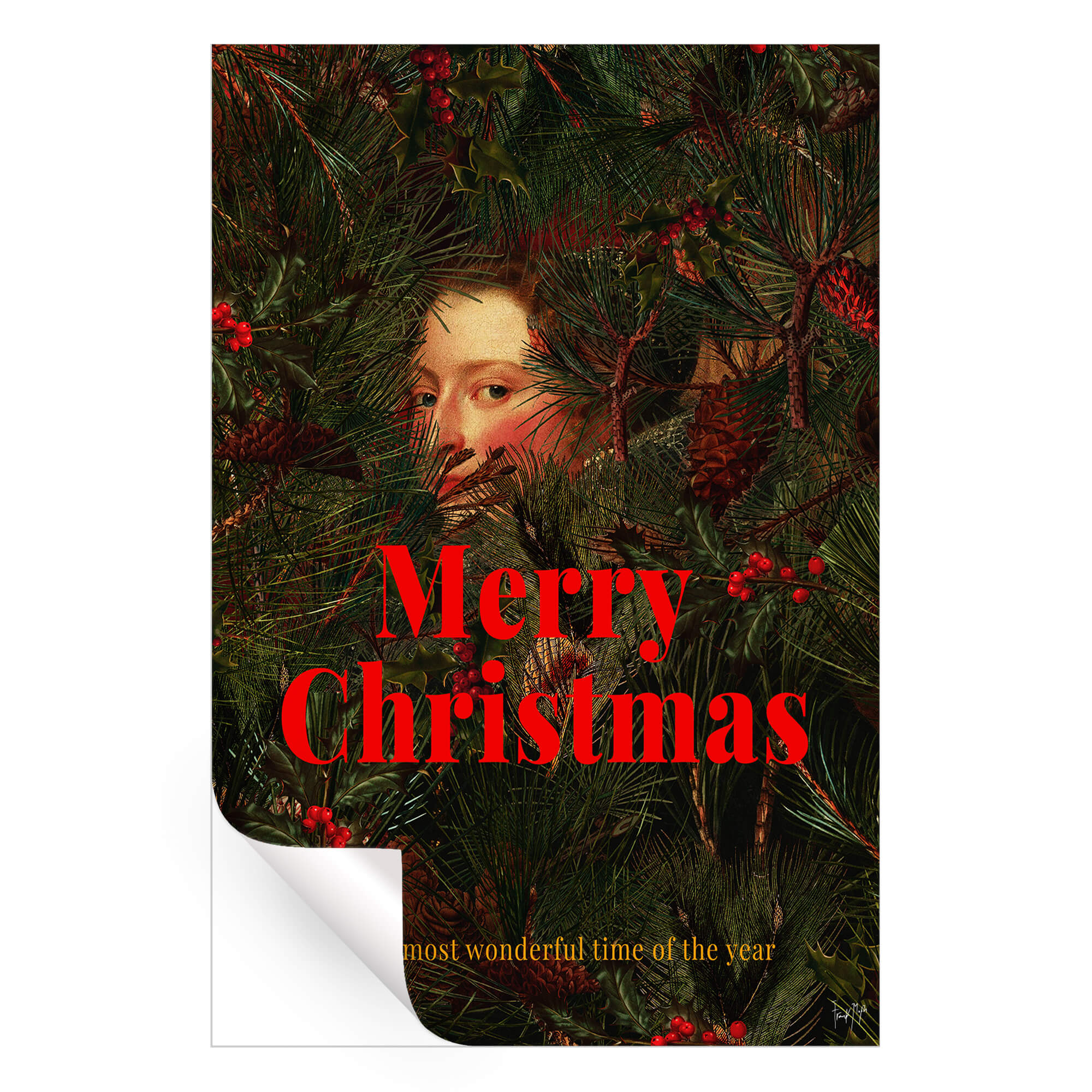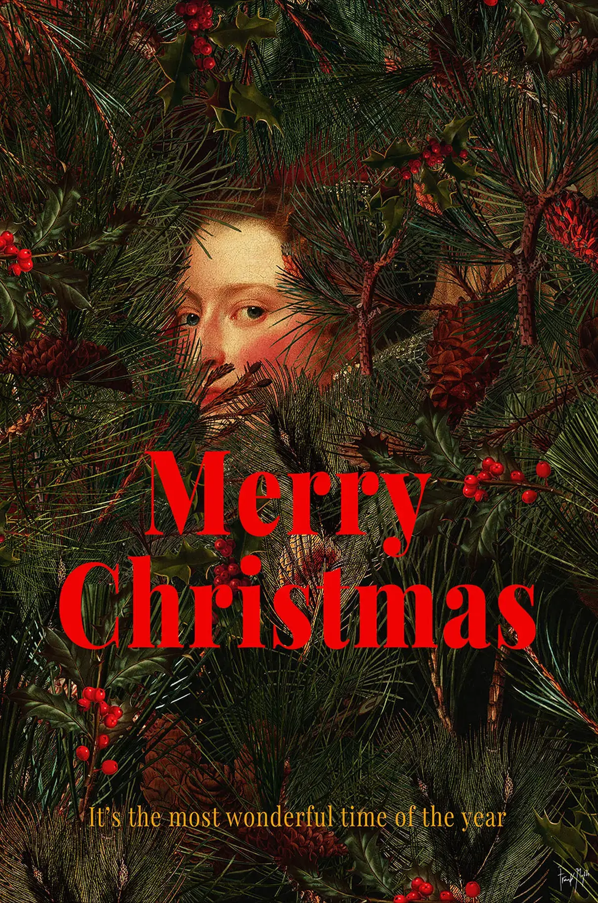 A creative twist on holiday art, this piece combines classical portraiture with festive design. A traditional painting of a serene face peeks out from a lush arrangement of pine branches, holly, and berries, layered with bold red typography reading “Merry Christmas.” The deep greens and reds create a rich, timeless palette that feels both vintage and contemporary.