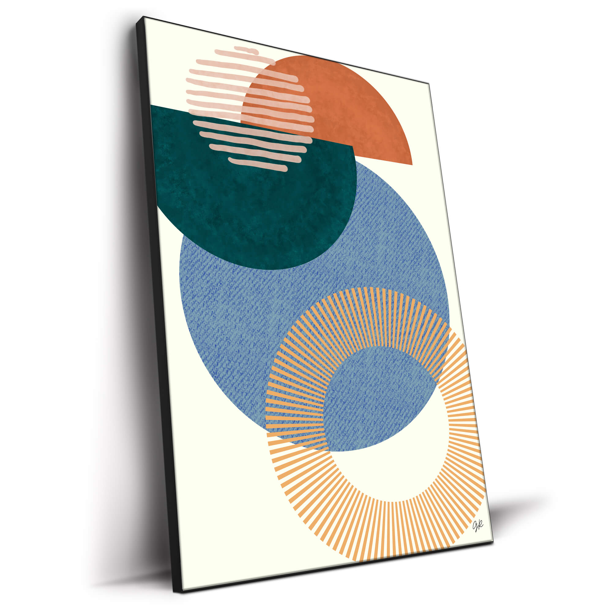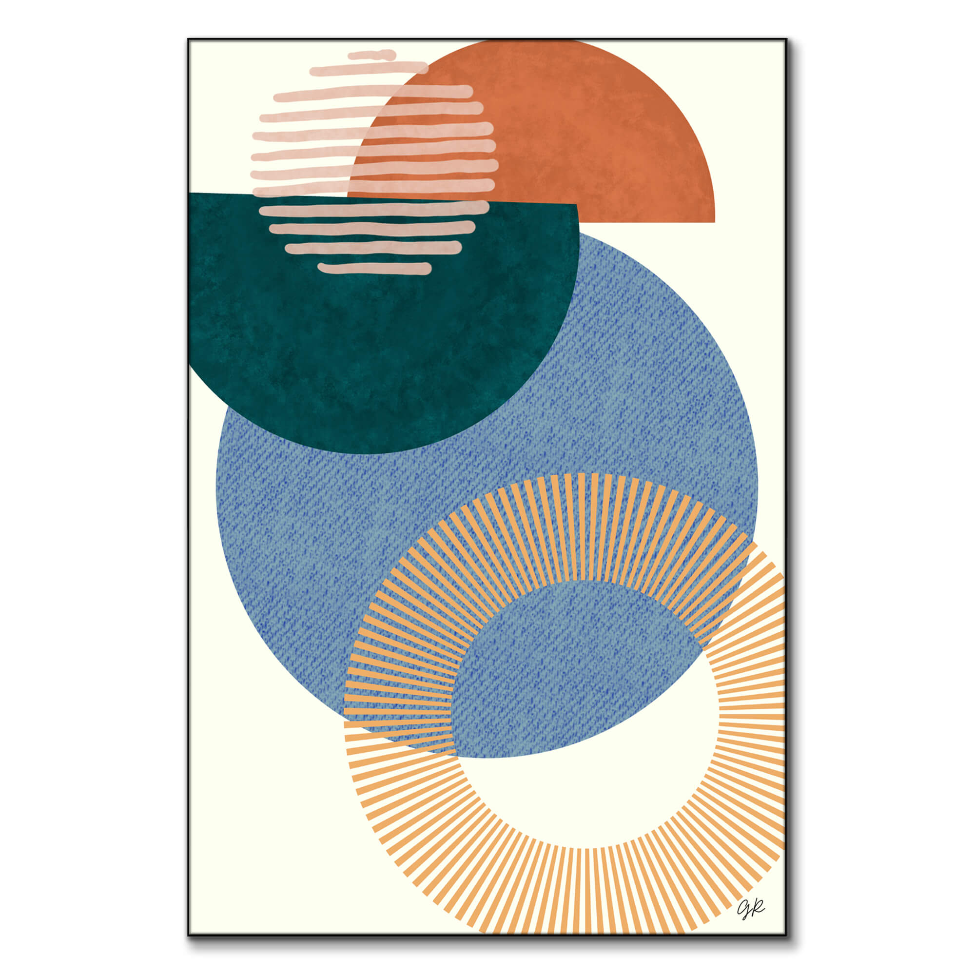 In the foreground, a ring of orange lines fans out, giving the illusion of a sun’s rays. The interplay of shapes and lines offers a harmony of form and color.