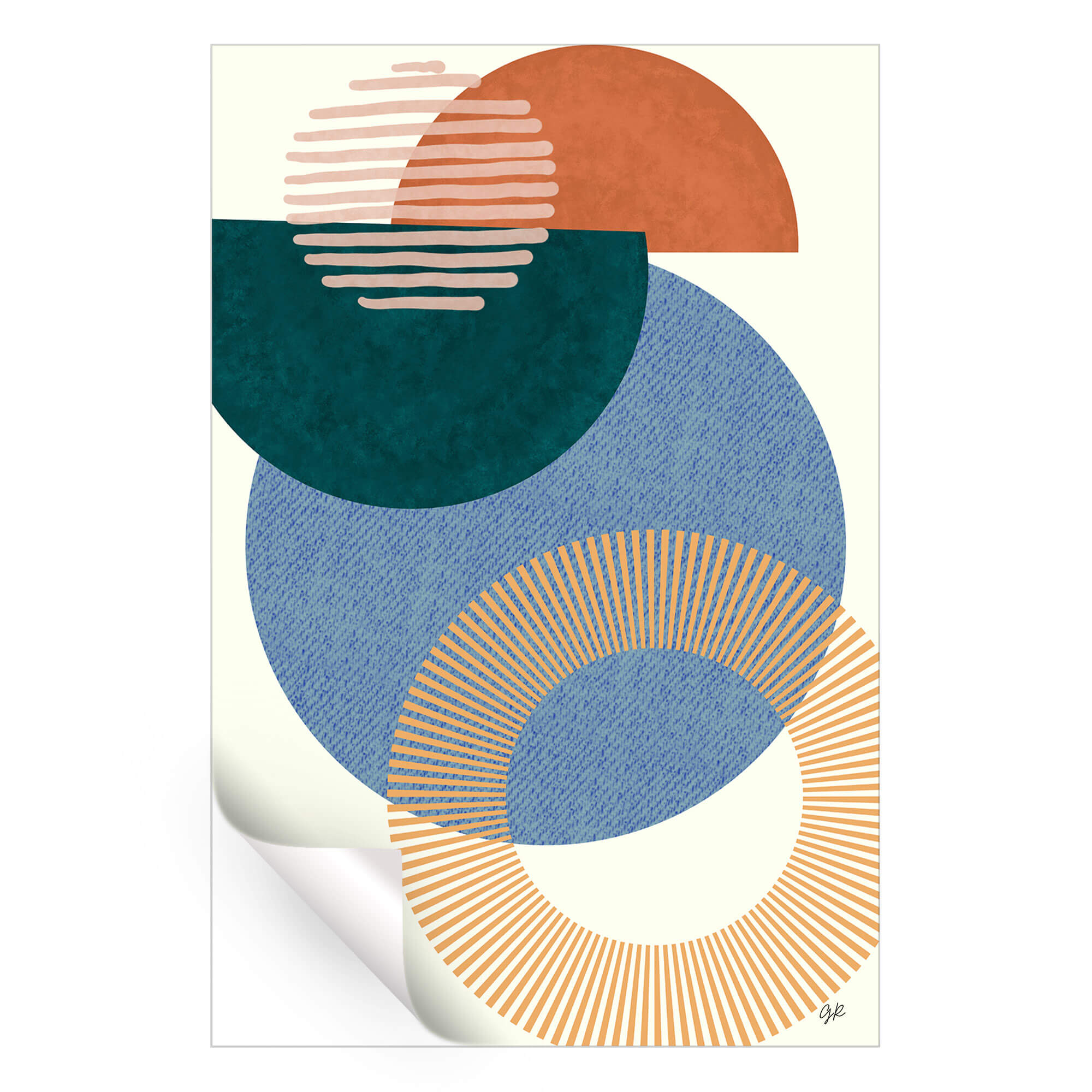Overlapping circles in muted earth tones create a sense of depth and dimension. The largest circle, a textured denim blue, serves as a foundation, overlaid with a half-circle in dark green. A series of parallel lines in a lighter shade sit atop, partially obscured by a smaller rust-colored semicircle.