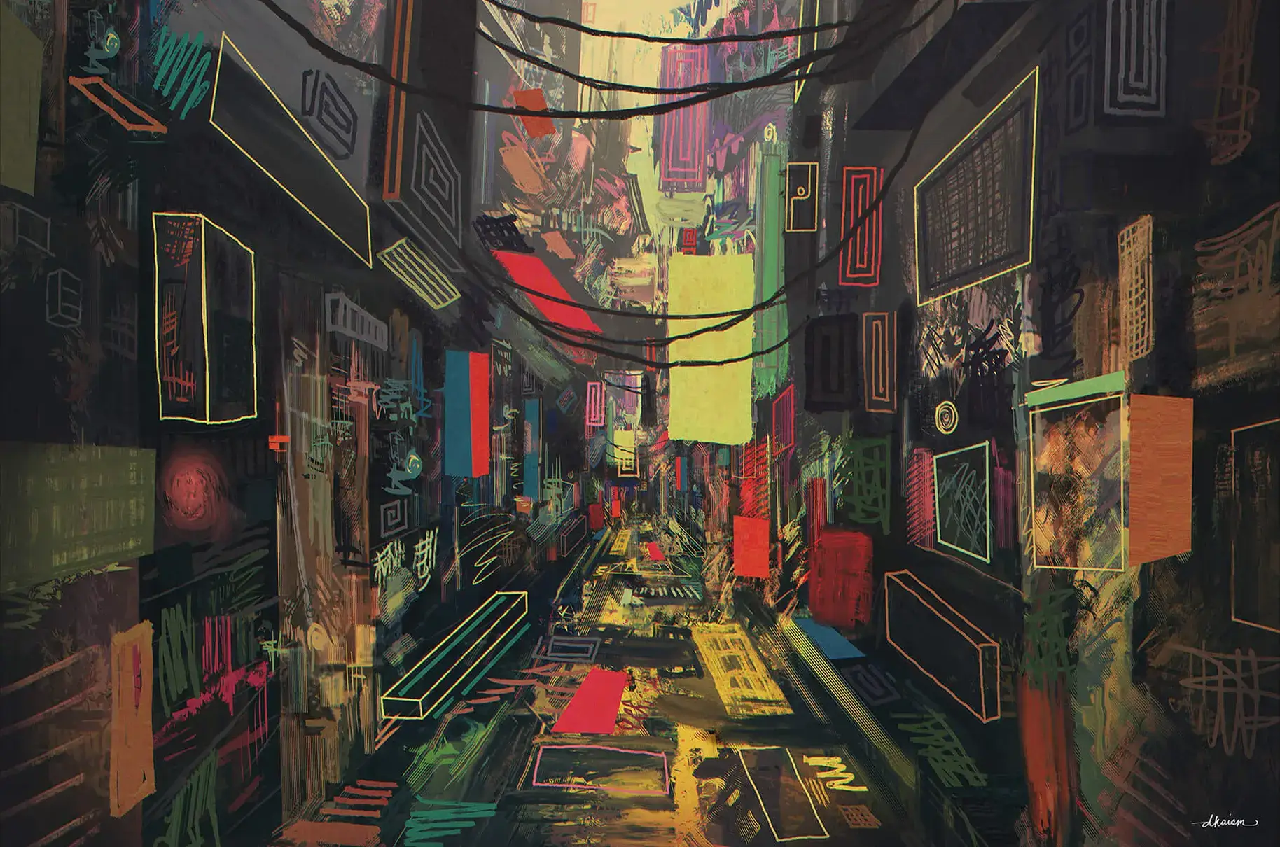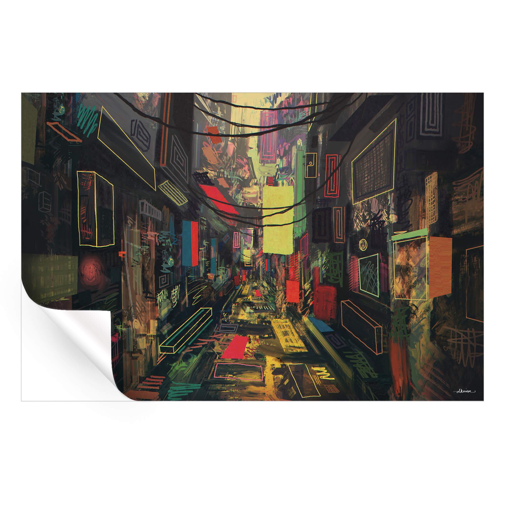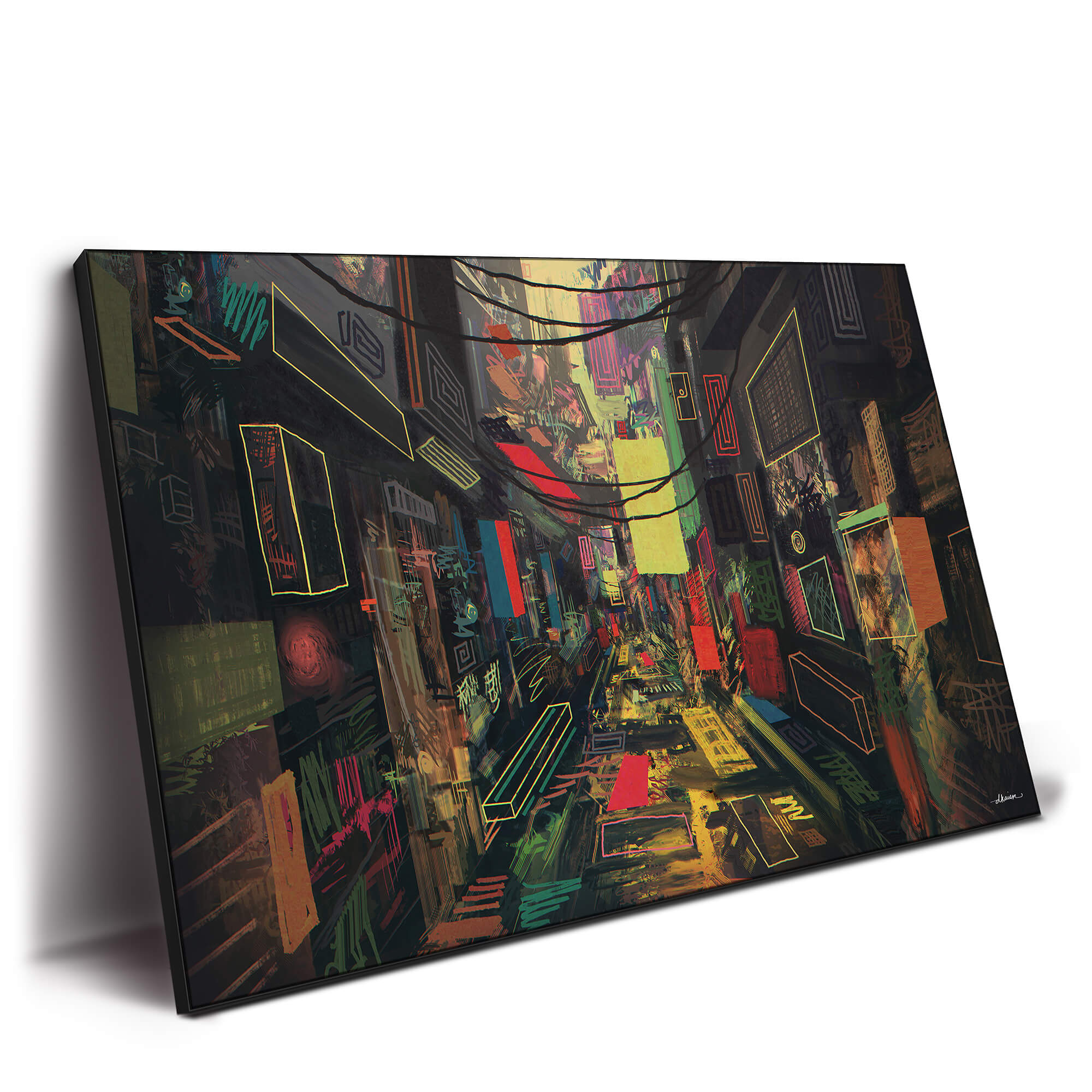 This captivating abstract artwork depicts a vibrant city street scene using bold colors and geometric shapes. The dynamic interplay of light and shadow creates depth, drawing viewers into the bustling atmosphere of city life. With a palette dominated by bright yellows, blues, and reds, the piece radiates energy and excitement, making it a striking focal point for any contemporary space.