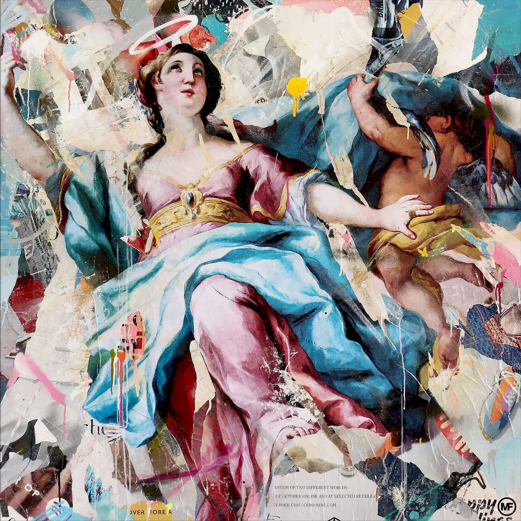 A reimagined classical painting featuring an angelic figure brings a sense of grace and serenity. The vibrant colors and layered textures create a captivating focal point for any art lover.