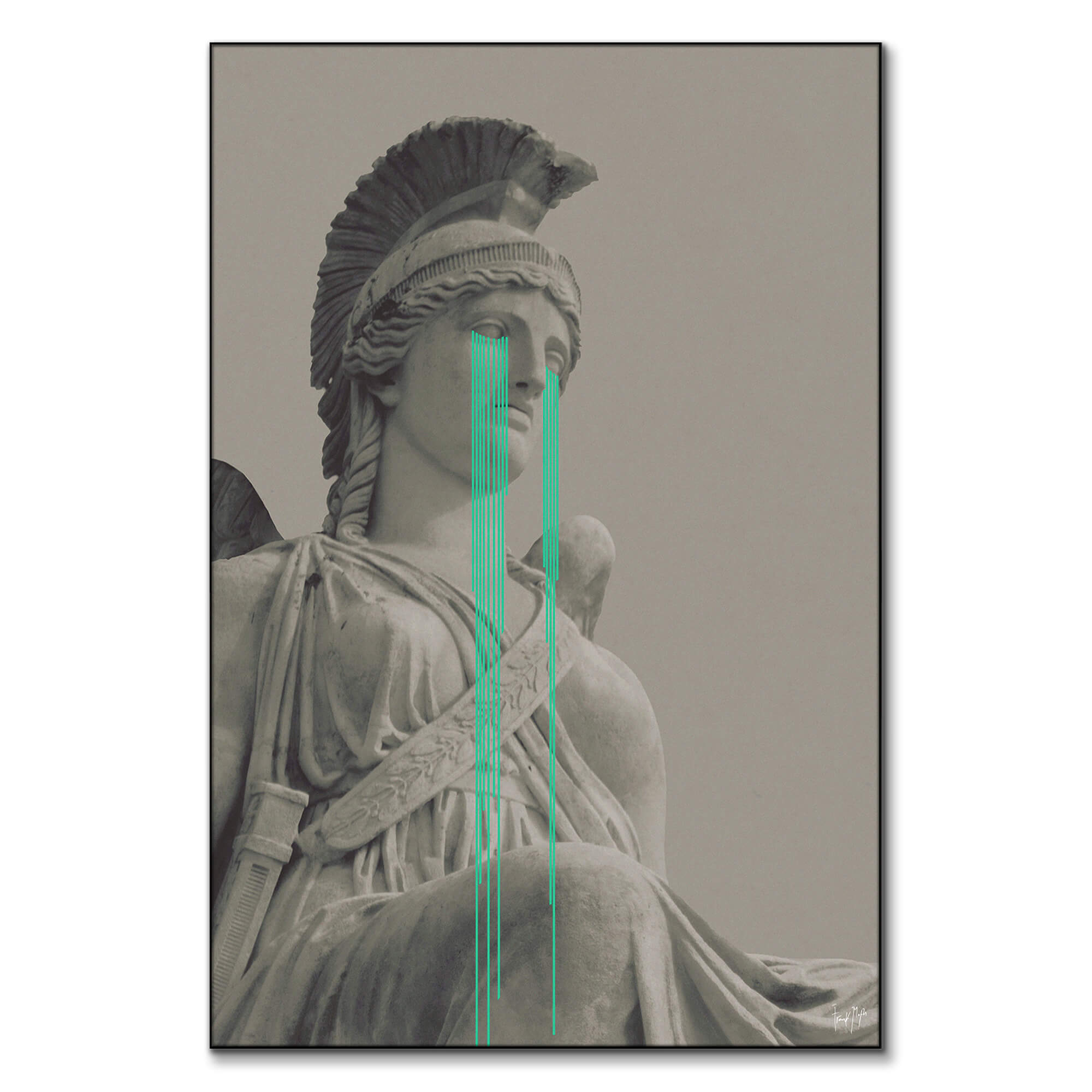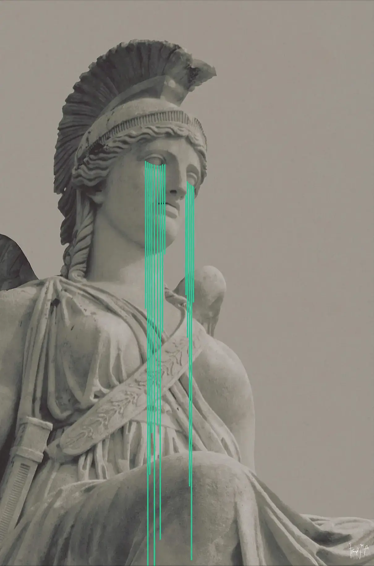 A timeless statue of a goddess is transformed through modern surrealism. Soft gray tones highlight the stone texture, while glowing turquoise lines cascade from the figure’s eyes in perfect symmetry. The blend of ancient form and digital light creates an arresting visual—minimal yet emotionally charged.