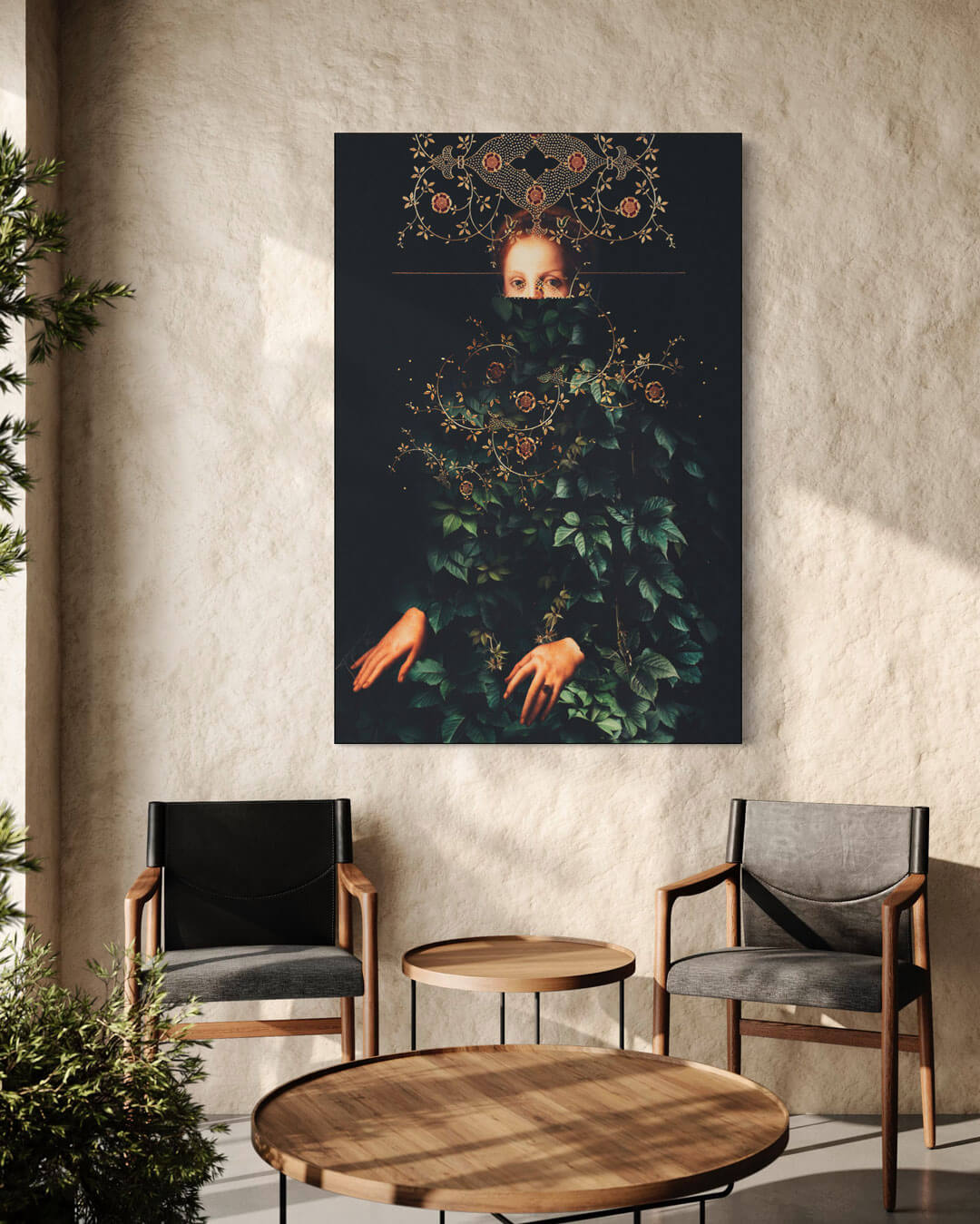 The interplay of deep greens, golds, and soft skin tones gives the piece a regal, ethereal quality. It feels both ancient and avant-garde—a meditation on nature, art, and identity.