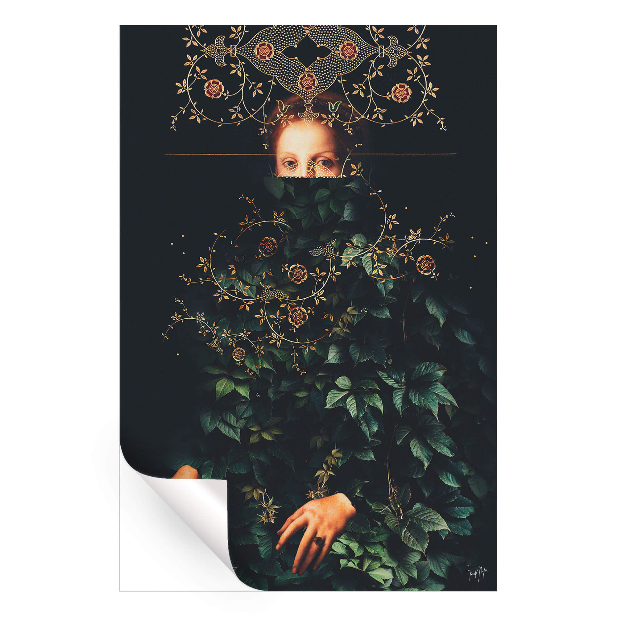 This artwork fuses classical portraiture with surreal natural beauty. A figure emerges from a dark forest of green leaves, adorned with intricate gold filigree and floral patterns that resemble royal embroidery. Only the face and hands remain visible, creating a sense of mystery and elegance rooted in Renaissance refinement.