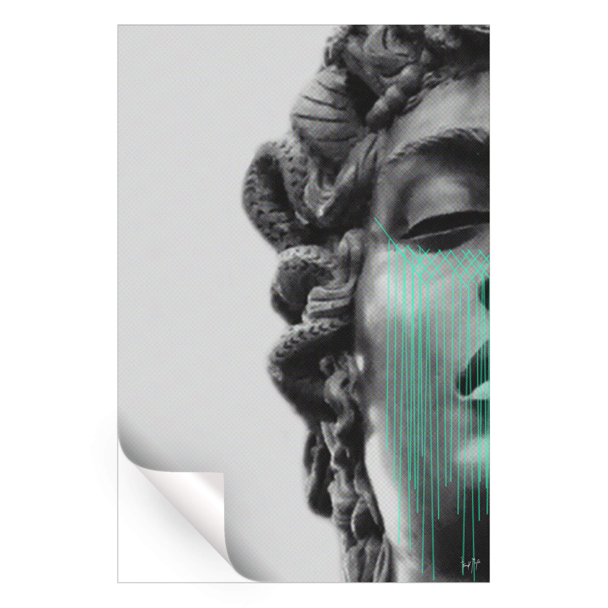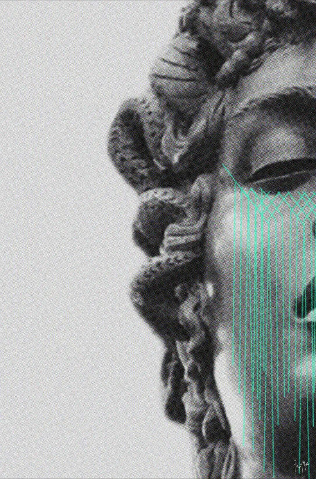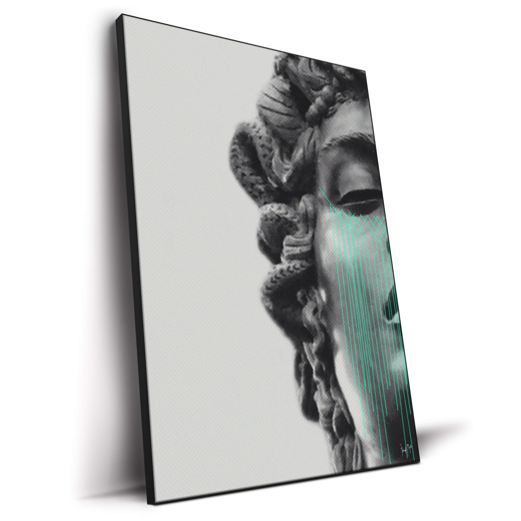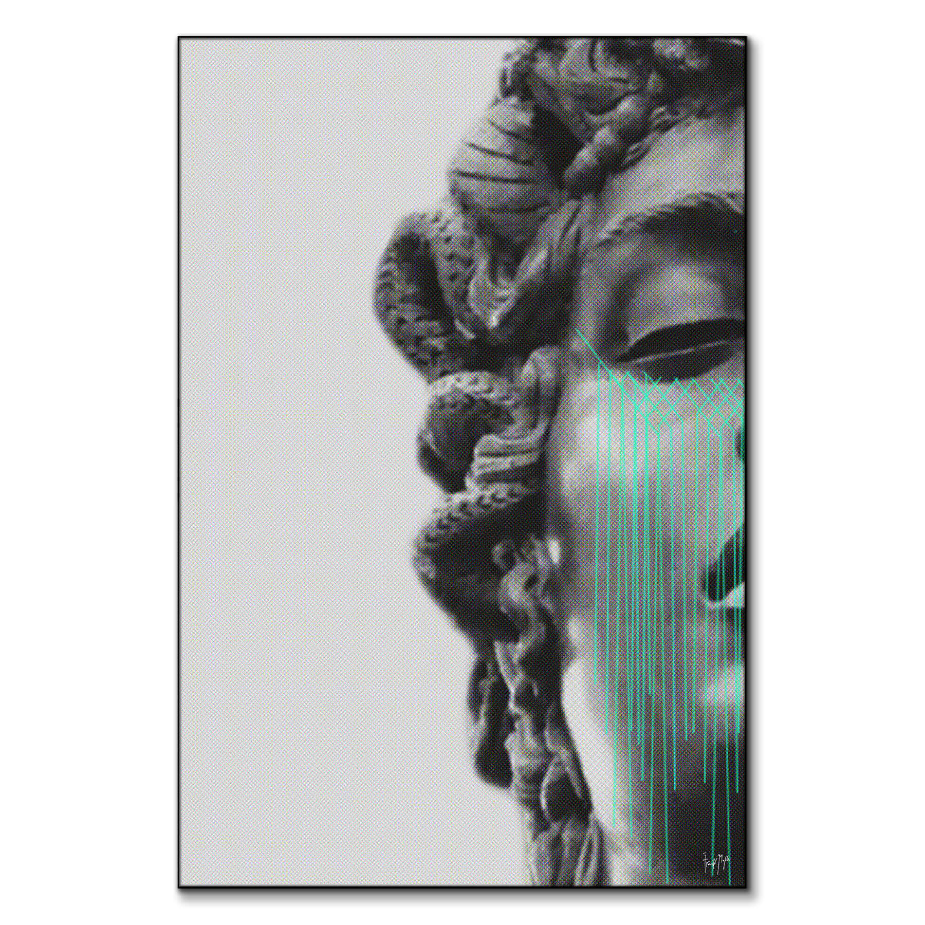 This modern surreal artwork reimagines classical sculpture with a digital edge. The fragmented statue’s serene expression contrasts against a cascade of teal lines streaming like tears—a fusion of ancient beauty and futuristic melancholy. The grayscale texture and minimal composition create a feeling of quiet strength and emotional resonance.