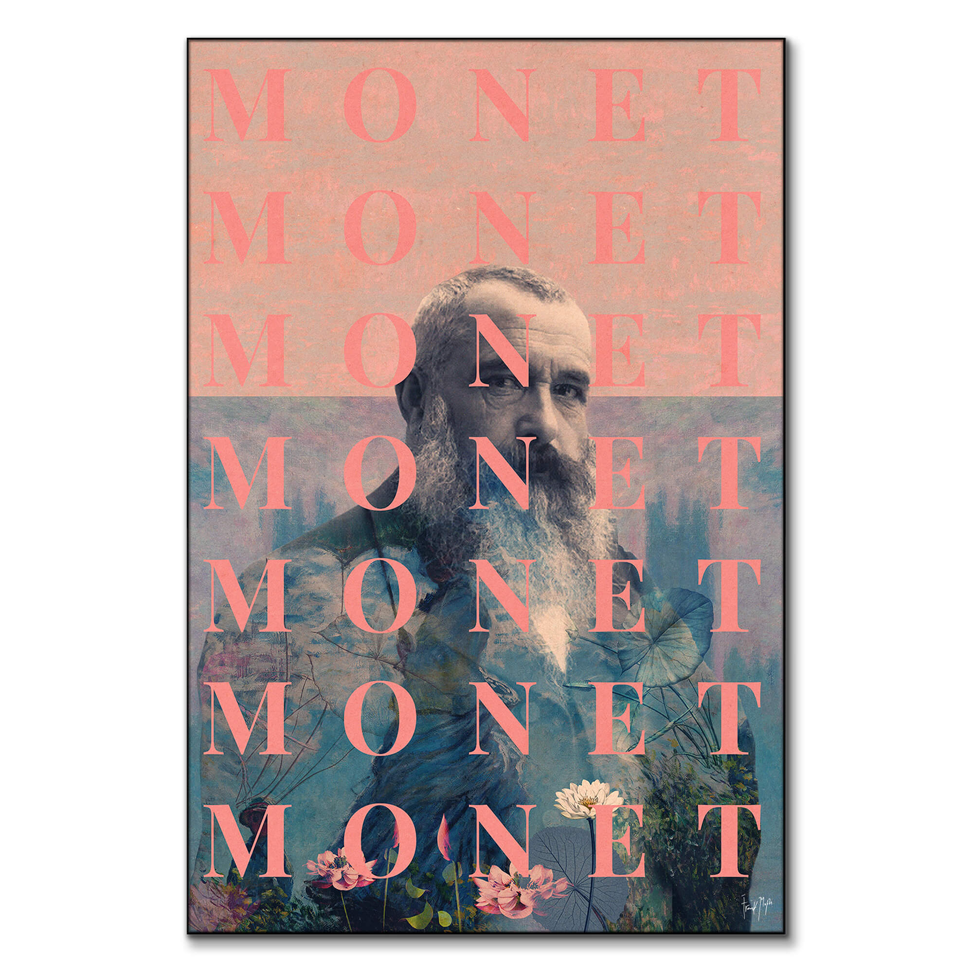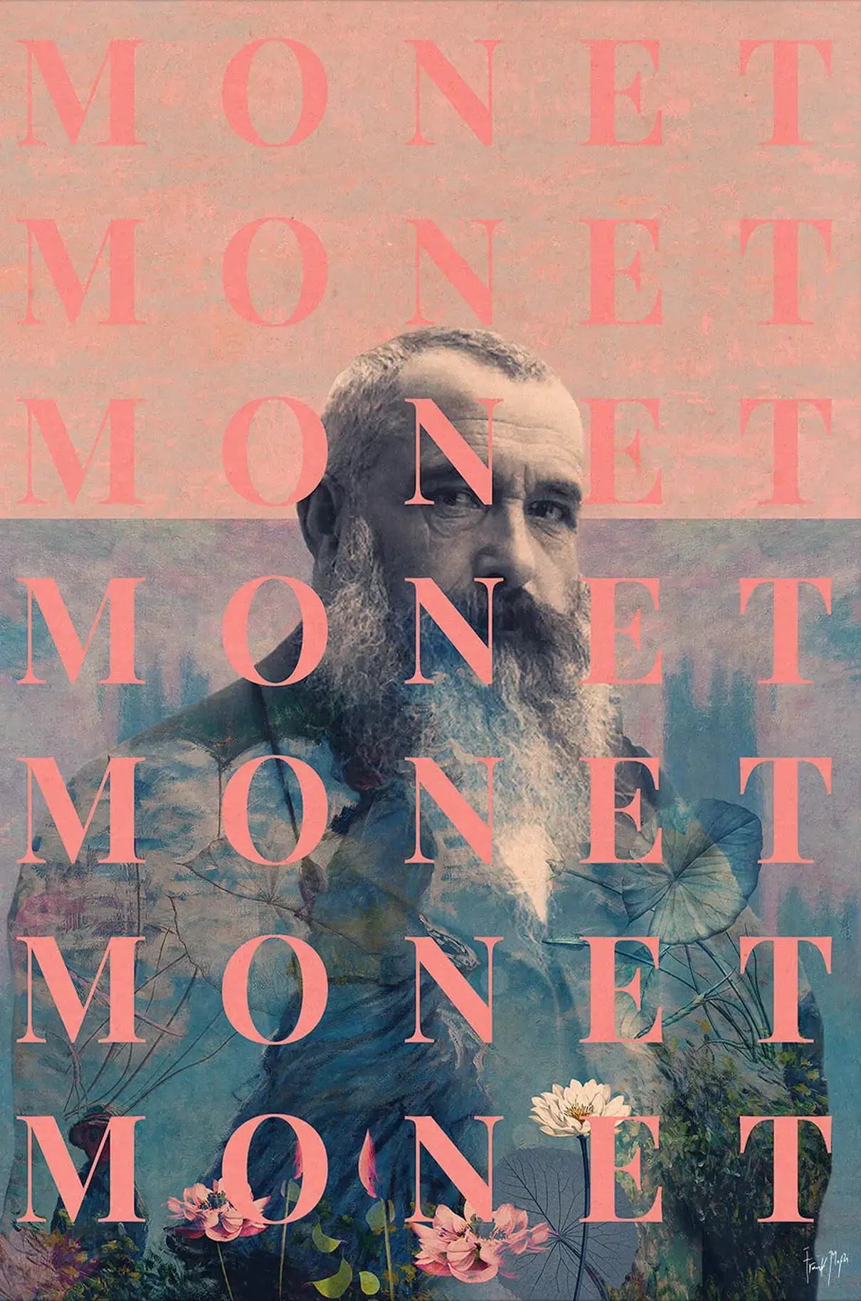 This portrait reimagines a historical figure through a modern, artistic lens. The repeated typography overlays a serene, painterly background, combining soft pinks and cool blues for a balanced, refined composition. The integration of florals and text transforms the classic image into something new—elevating timeless creativity with a fresh, contemporary twist.