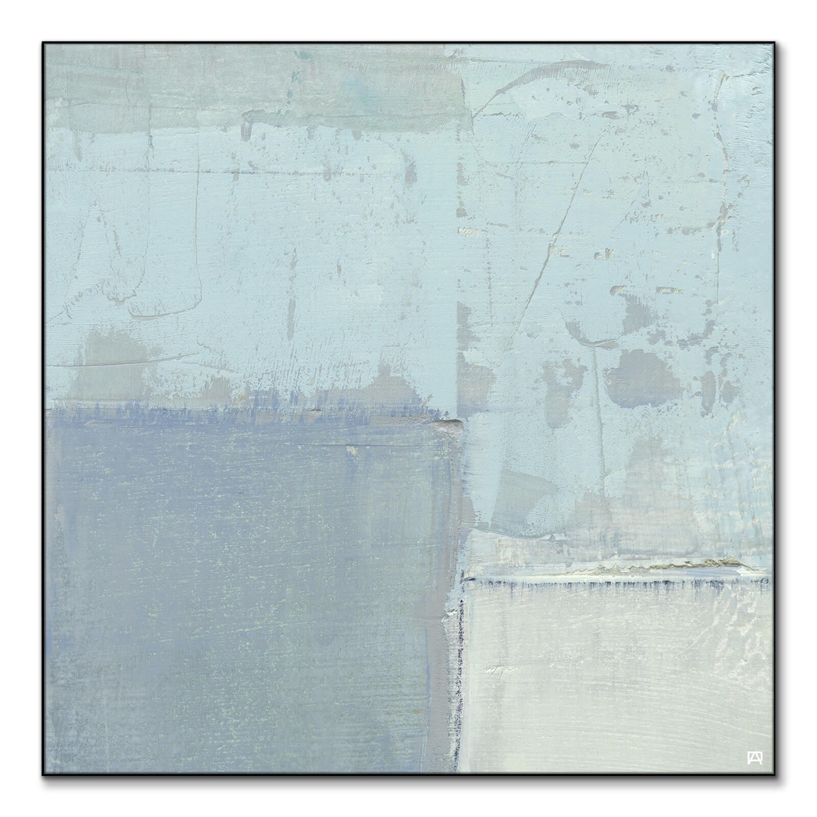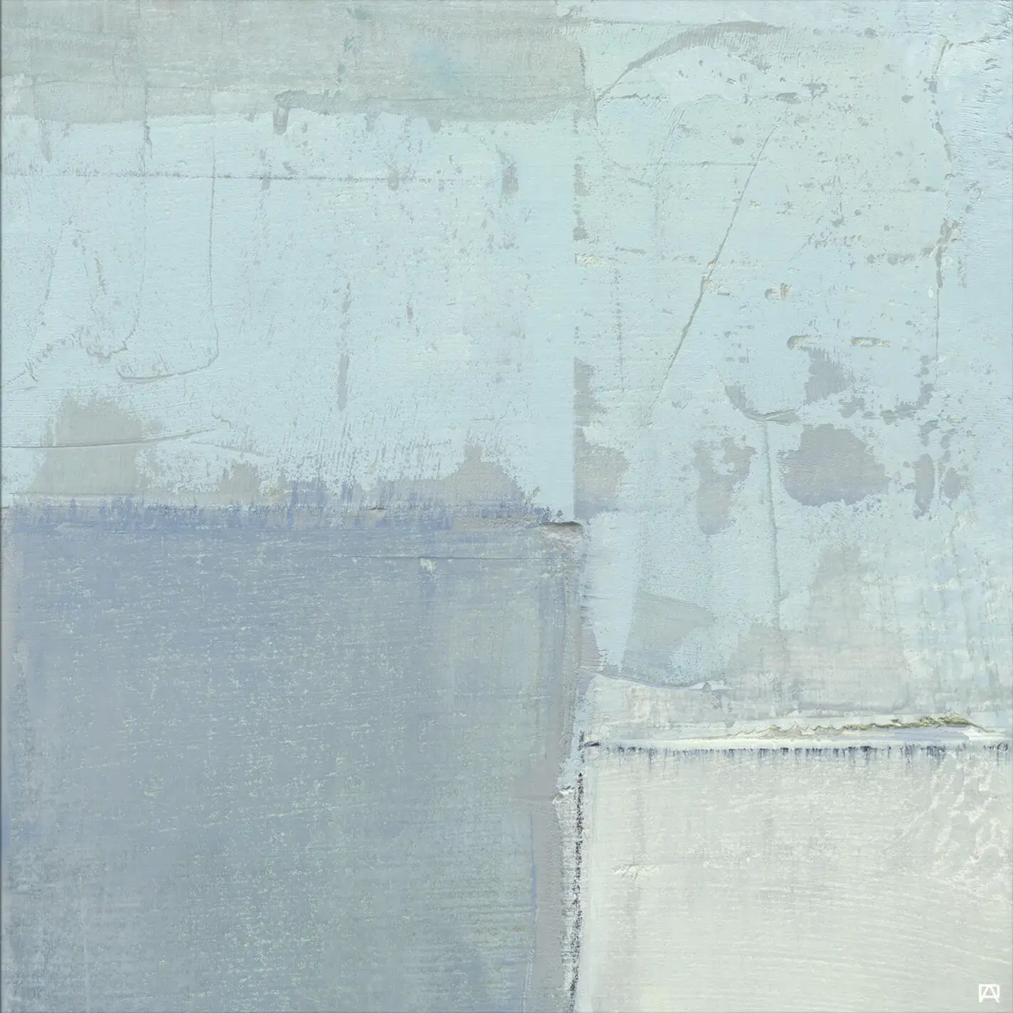 Lighter shades of blue and grey create a backdrop that looks washed, with hints of underlying marks that convey layering.