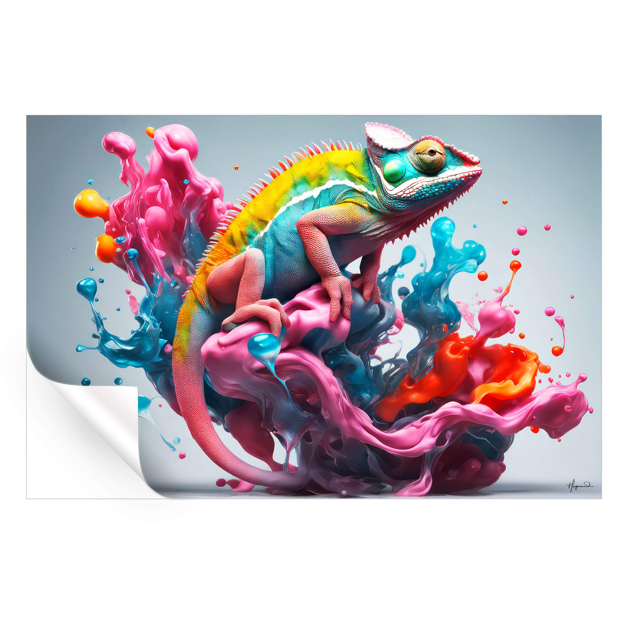 The natural elegance of a chameleon is combined with a surreal explosion of vibrant, liquid colors. The chameleon sits at the center of the image, meticulously detailed, showcasing its characteristic textured skin, ridged back, and curled tail.