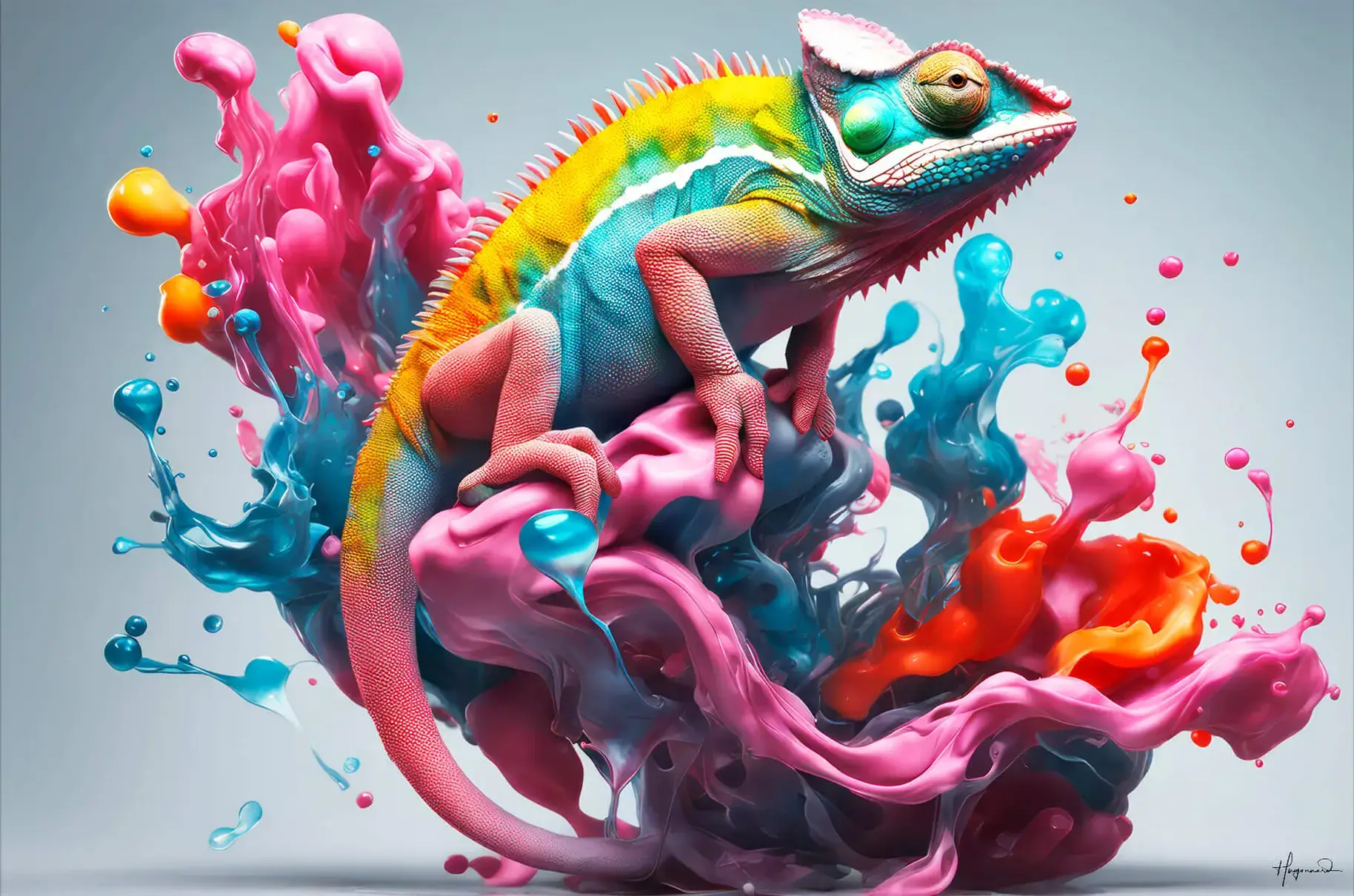 The background provides a stark contrast to the creature, with a muted gradient backdrop that helps the swirling colors pop. From beneath the chameleon erupts a tumultuous splash of viscous, liquid colors – deep blues, vivid pinks, fiery oranges, and cerulean.