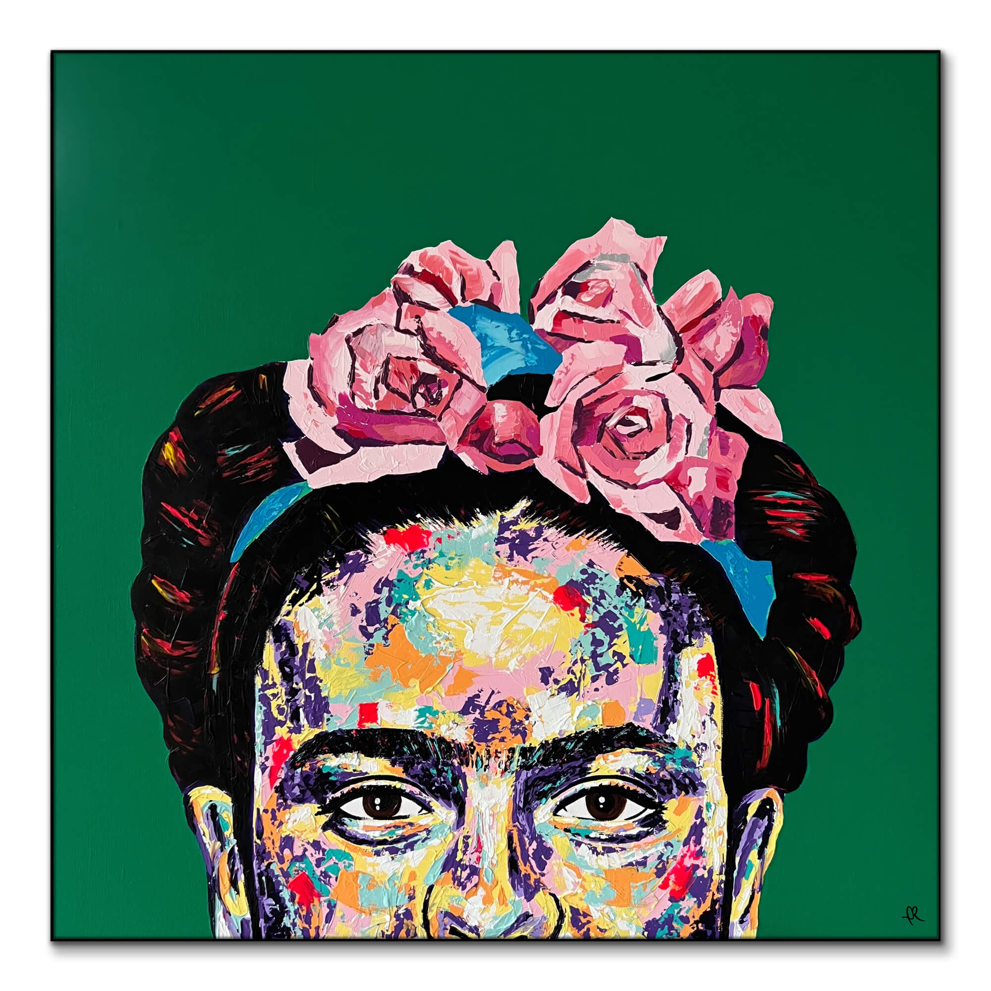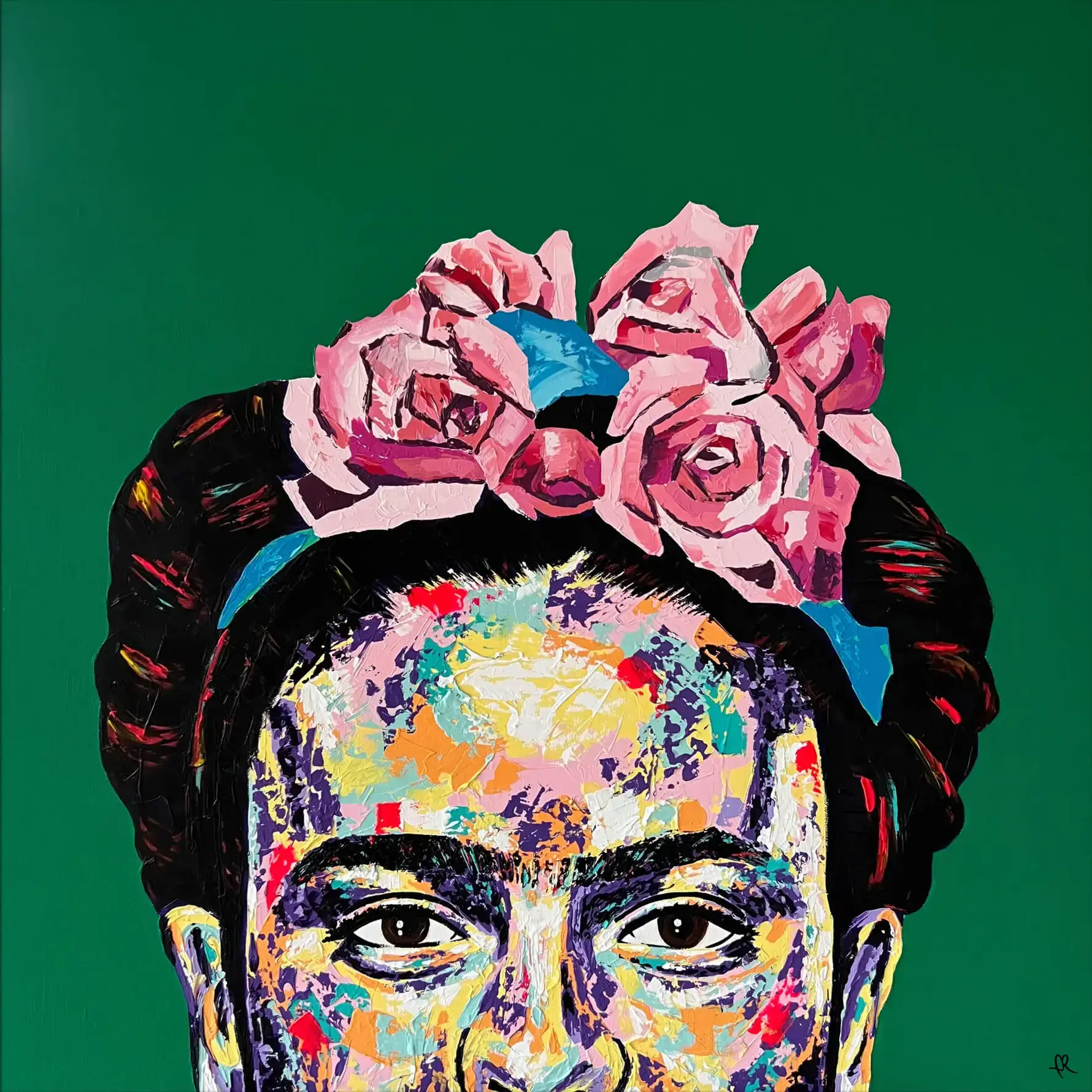 Vibrant and colorful, this homage to artist Frida Kahlo is striking, with her eyes directly gazing at the viewer.