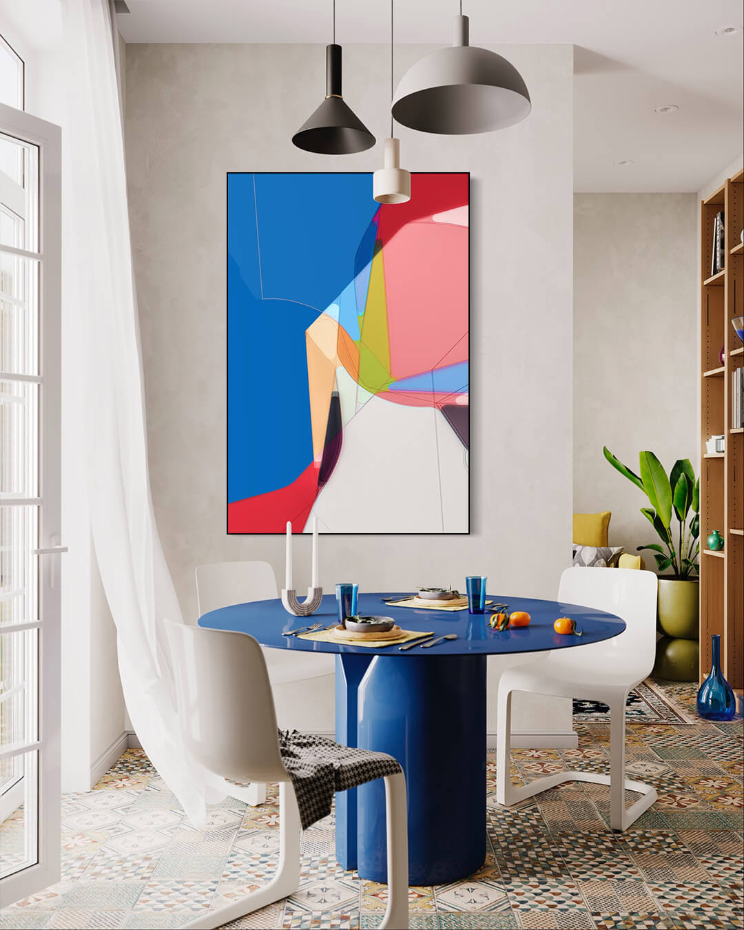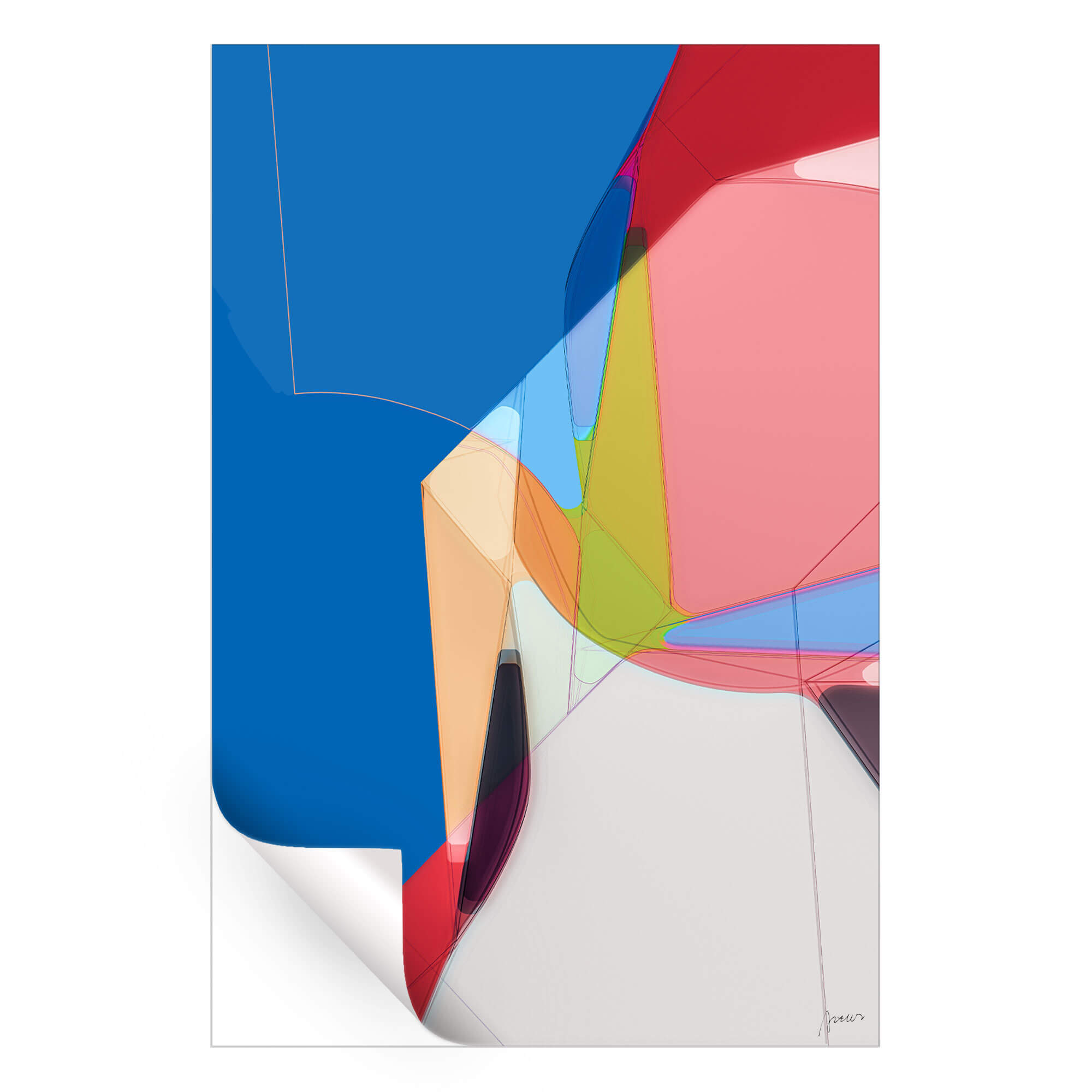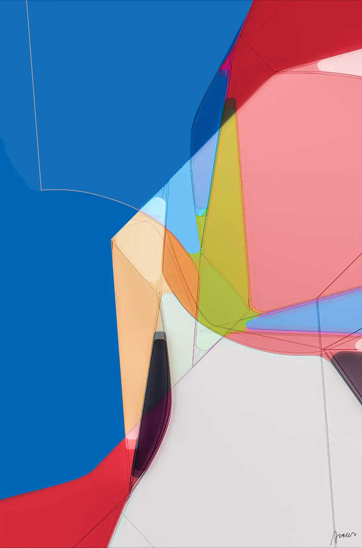 Vibrant geometric shapes layer and intersect, creating a lively mosaic of translucent colors. Bold blue and rich red form the base while overlays of amber, green, and blush impart a playful depth. The lines where these shapes meet are softened by the translucency. This work is a celebration of color and form, a visual symphony that pulses with the rhythm of modern life.