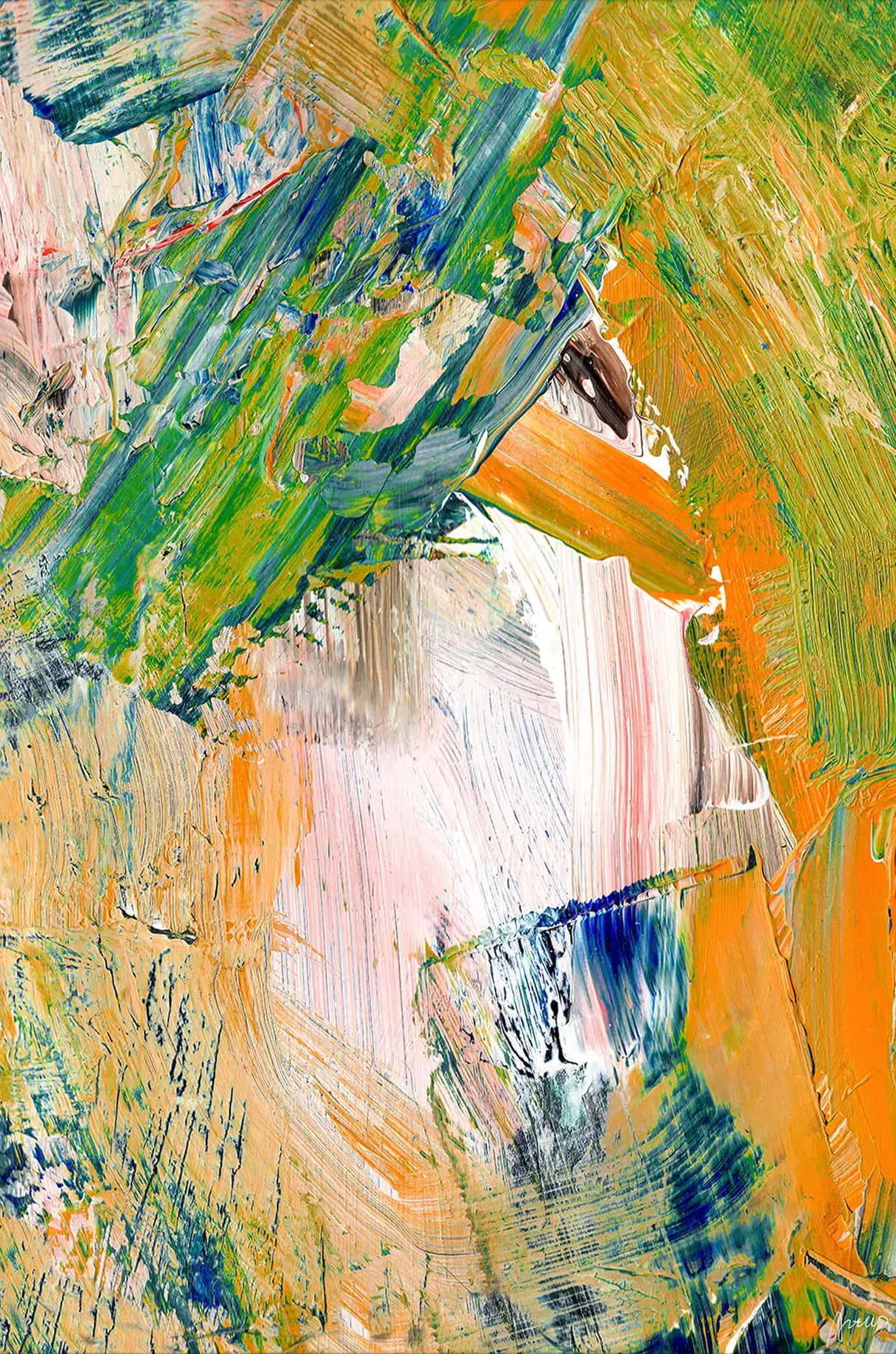 This abstract composition bursts with movement and texture. Sweeping strokes of orange, green, and cream blend across the surface, creating a sense of motion and depth. The color palette feels fresh and spontaneous, balanced by soft neutrals that keep the energy grounded.