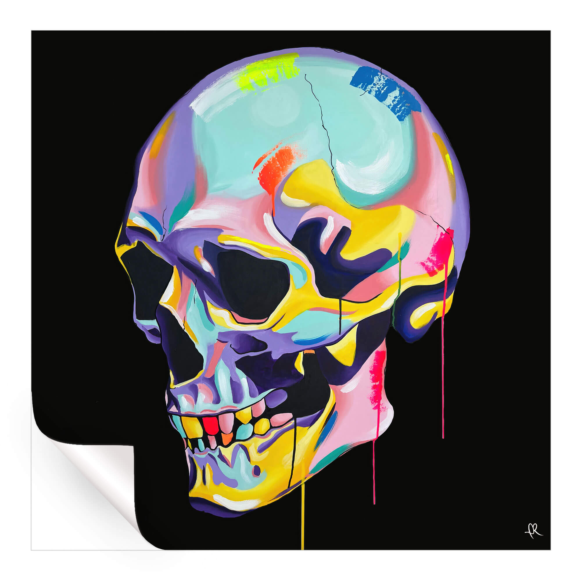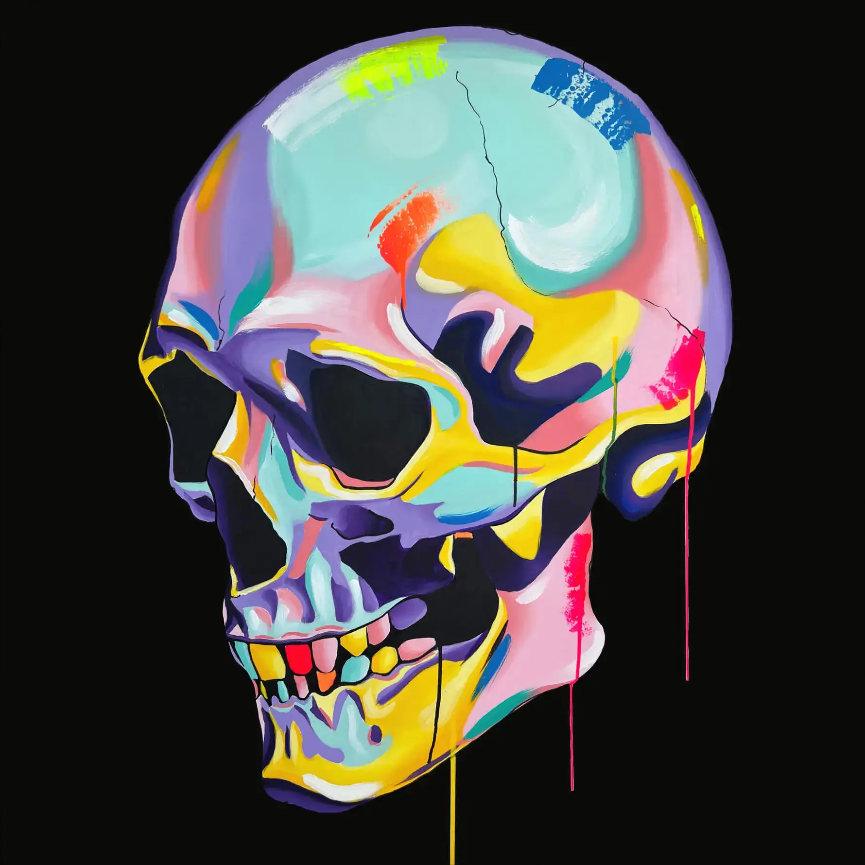 Streaks of color drip down from the skull, adding to the artwork’s avant-garde aesthetic.