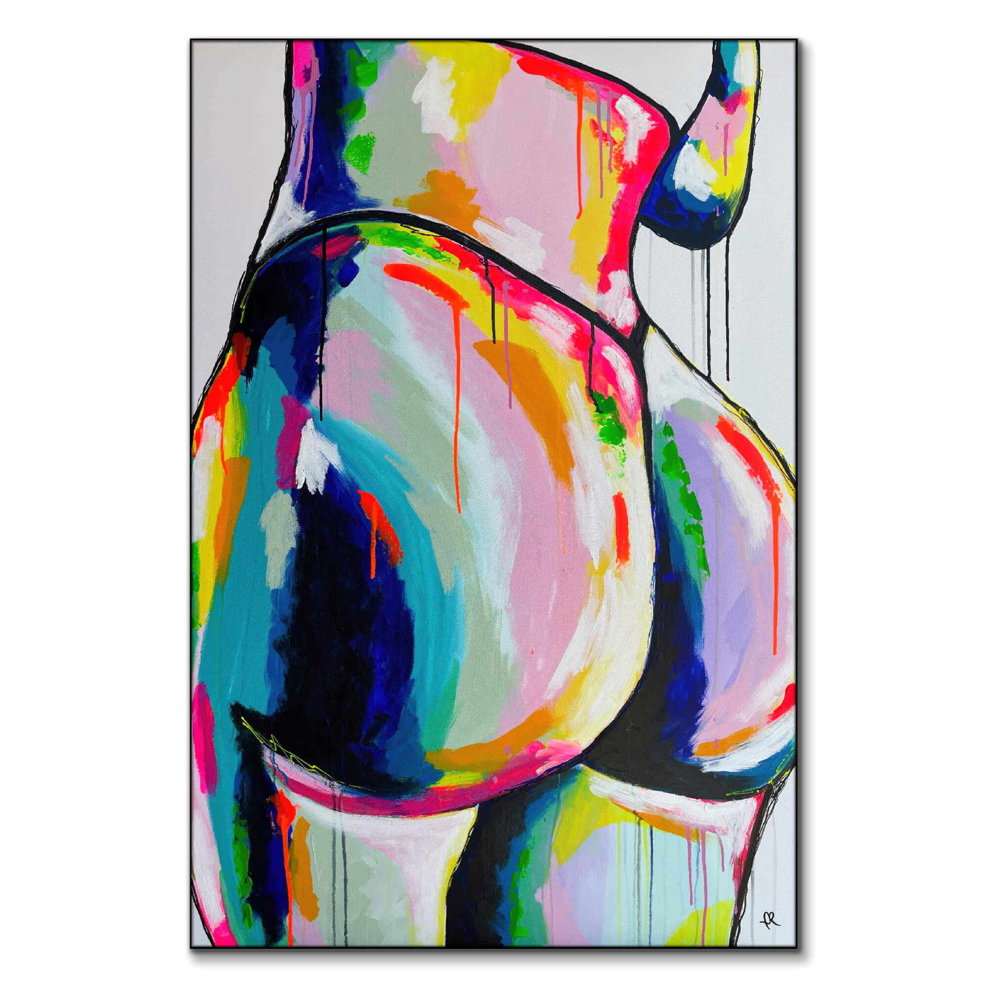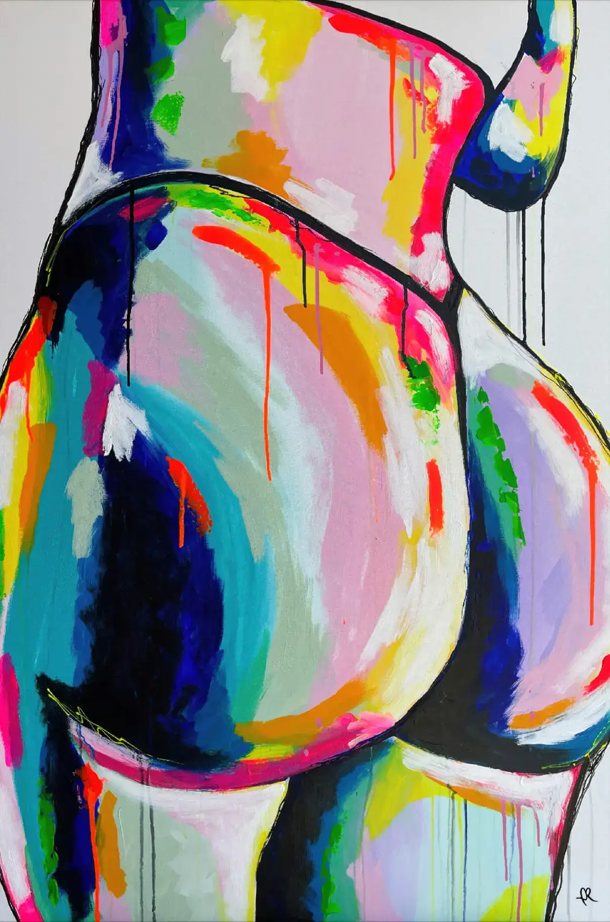 The curves of the figure are outlined in black against vibrant colors. The colors are applied in way that suggests fluidity and movement.