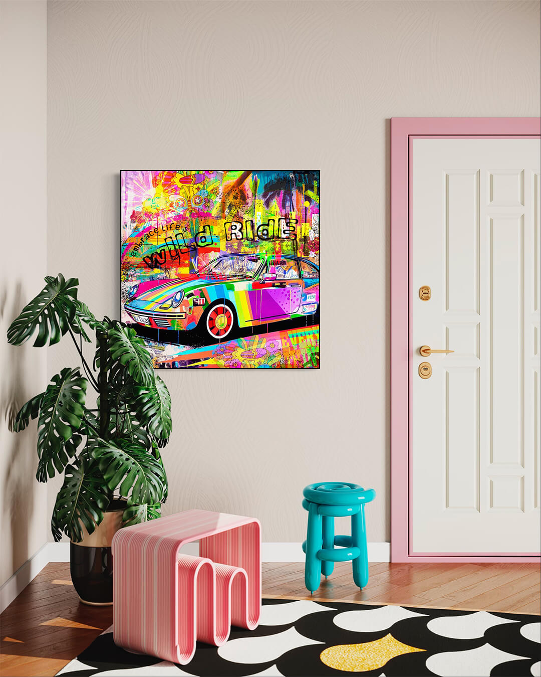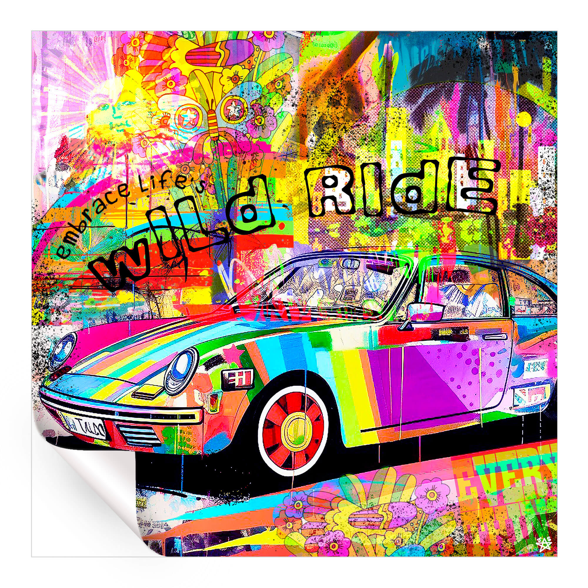A porsche with a multicolored paint job is featured in front of a psychedelic background. The words “Wild Ride” are prominently displayed across the image in stylized lettering. The background is a vivid collage of floral patterns, bright splashes, and various graphic elements. The scene suggests motion and a sense of adventure.