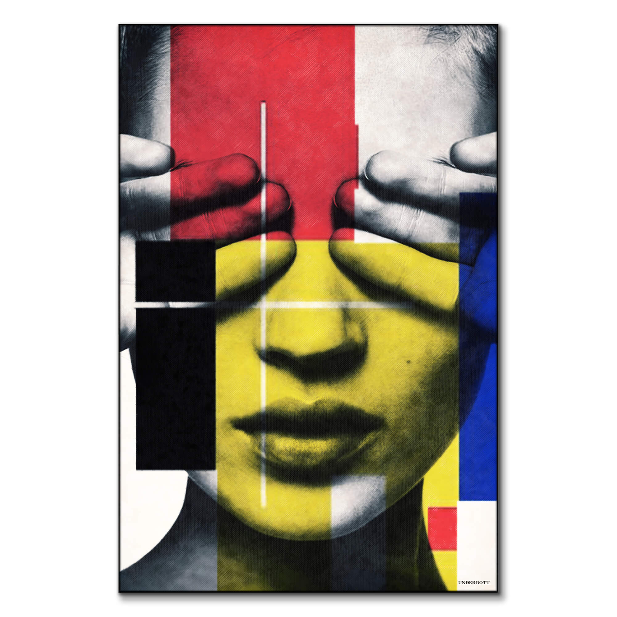 Red, yellow, blue, and deep black blocks stack like modernist tiles over softly lit skin. Slim white lines intersect the shapes, hinting at Mondrian yet bending gently to the contours of the hidden face. Fingers press over the model’s eyes, inviting quiet reflection while allowing bold color to speak louder than words. A muted cheek emerges beside a cobalt band, and the lips rest in subtle grayscale that contrasts the radiant primary palette.