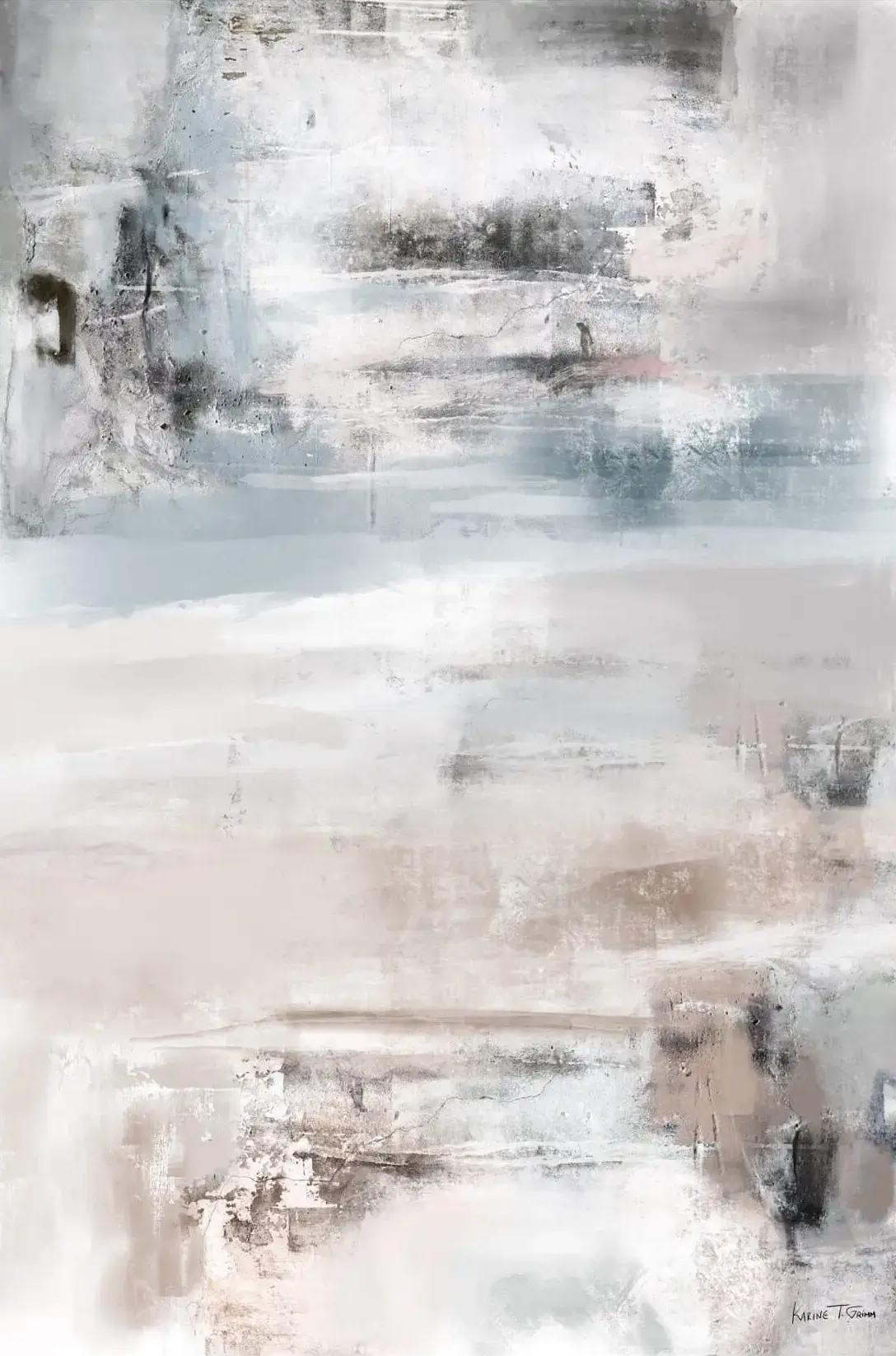Soft brushstrokes of white, light gray, and beige come together to create a serene atmosphere, evoking the quiet beauty of snow-covered land. The fluidity of the strokes suggests the gentle descent of snowflakes, while the light tones reflect the softness of winter’s touch.