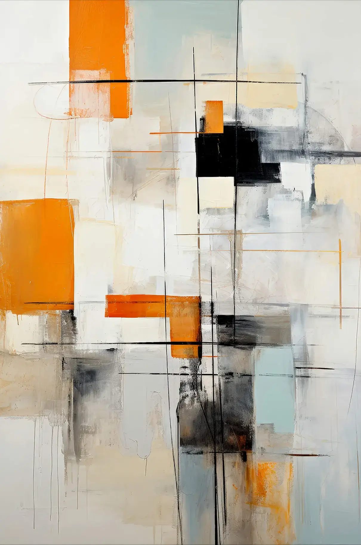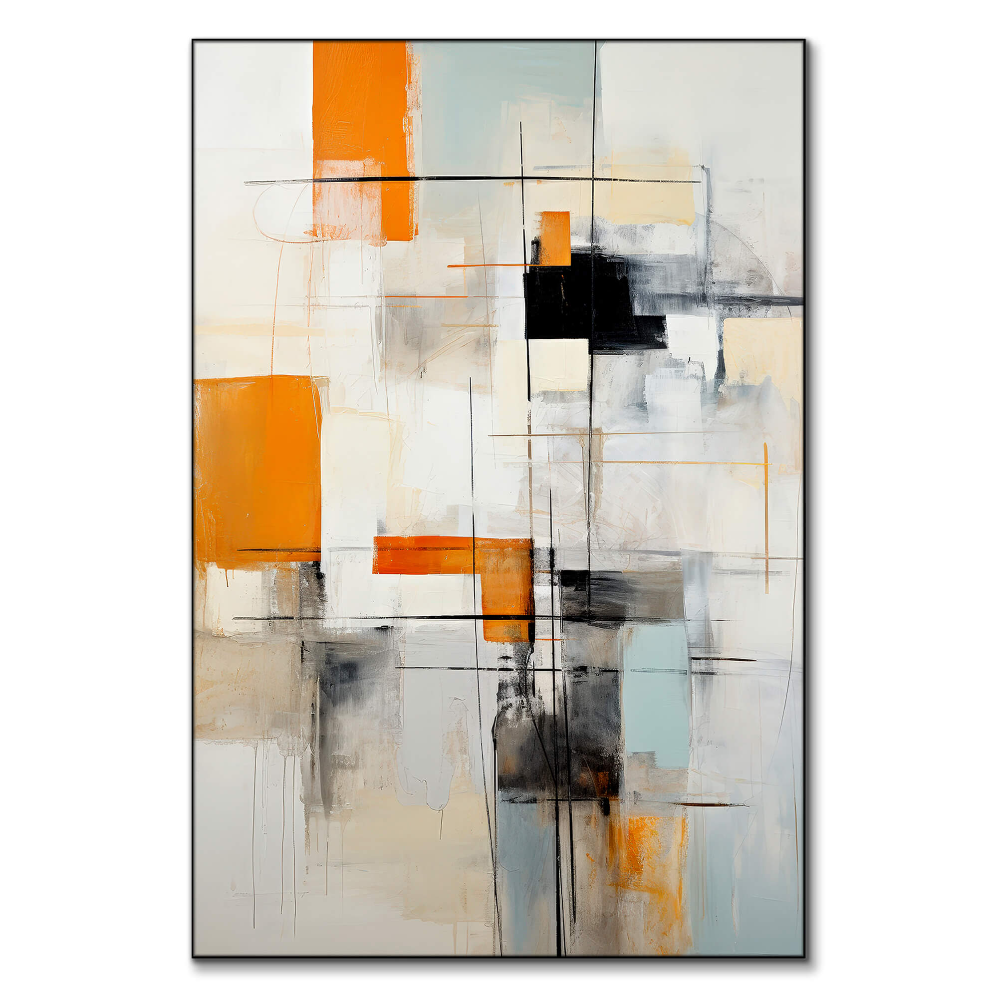 A striking abstract composition blends neutral tones with bold accents of orange and black, creating a visually engaging balance of structure and spontaneity. Expressive brushstrokes and fine lines intersect across the canvas, evoking an urban, architectural feel. The interplay of soft beige, cool gray, and warm amber adds depth and movement, making this piece a versatile addition to modern interiors. The textured elements and layered details invite closer inspection, offering something new with each glance. Whether in a home or office setting, this artwork brings an air of contemporary sophistication and creative energy.