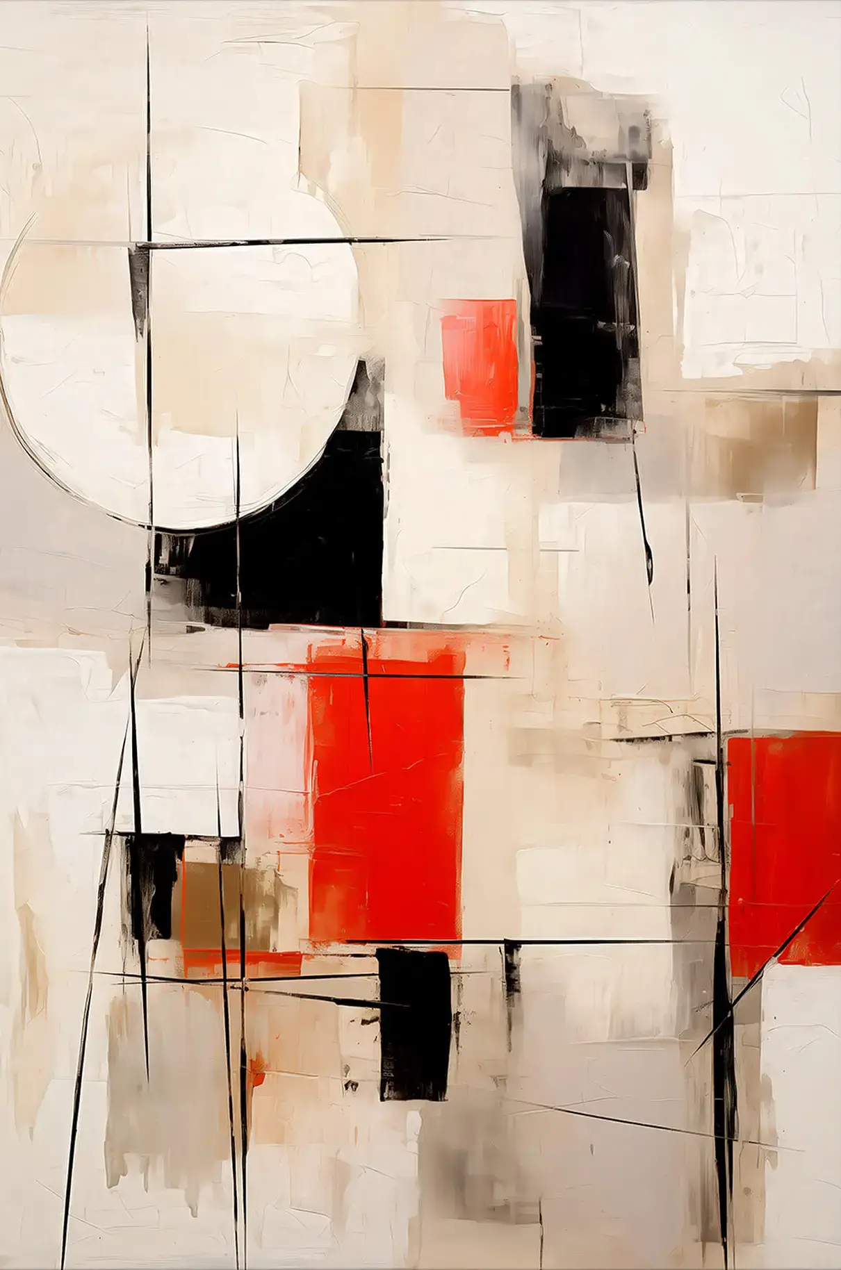 A captivating composition blends geometric precision with expressive brushwork, creating a dynamic interplay of structure and spontaneity. Bold strokes of red and black contrast against a muted, textured background, giving the piece a striking yet balanced aesthetic. The interplay of sharp lines and soft gradients adds depth and movement, making it a thought-provoking visual experience.