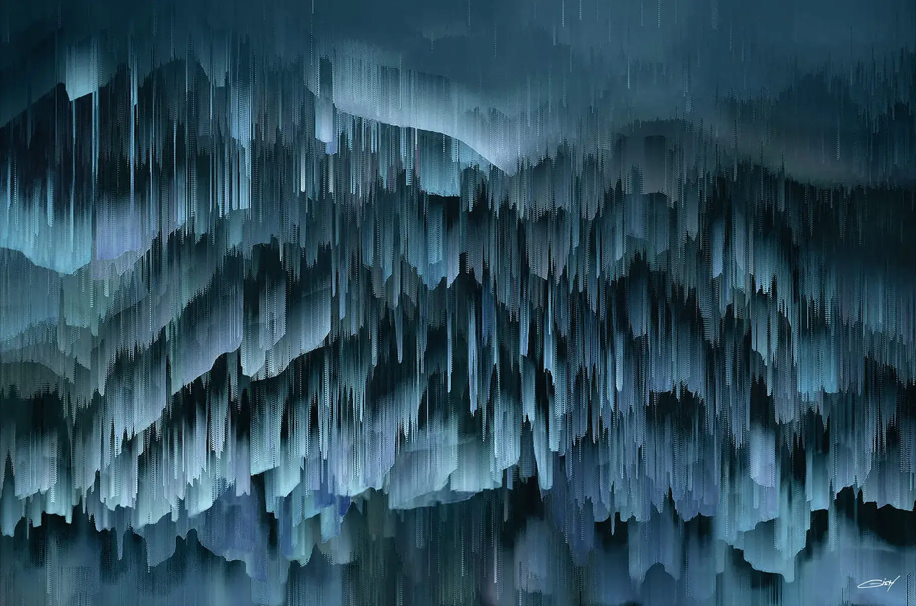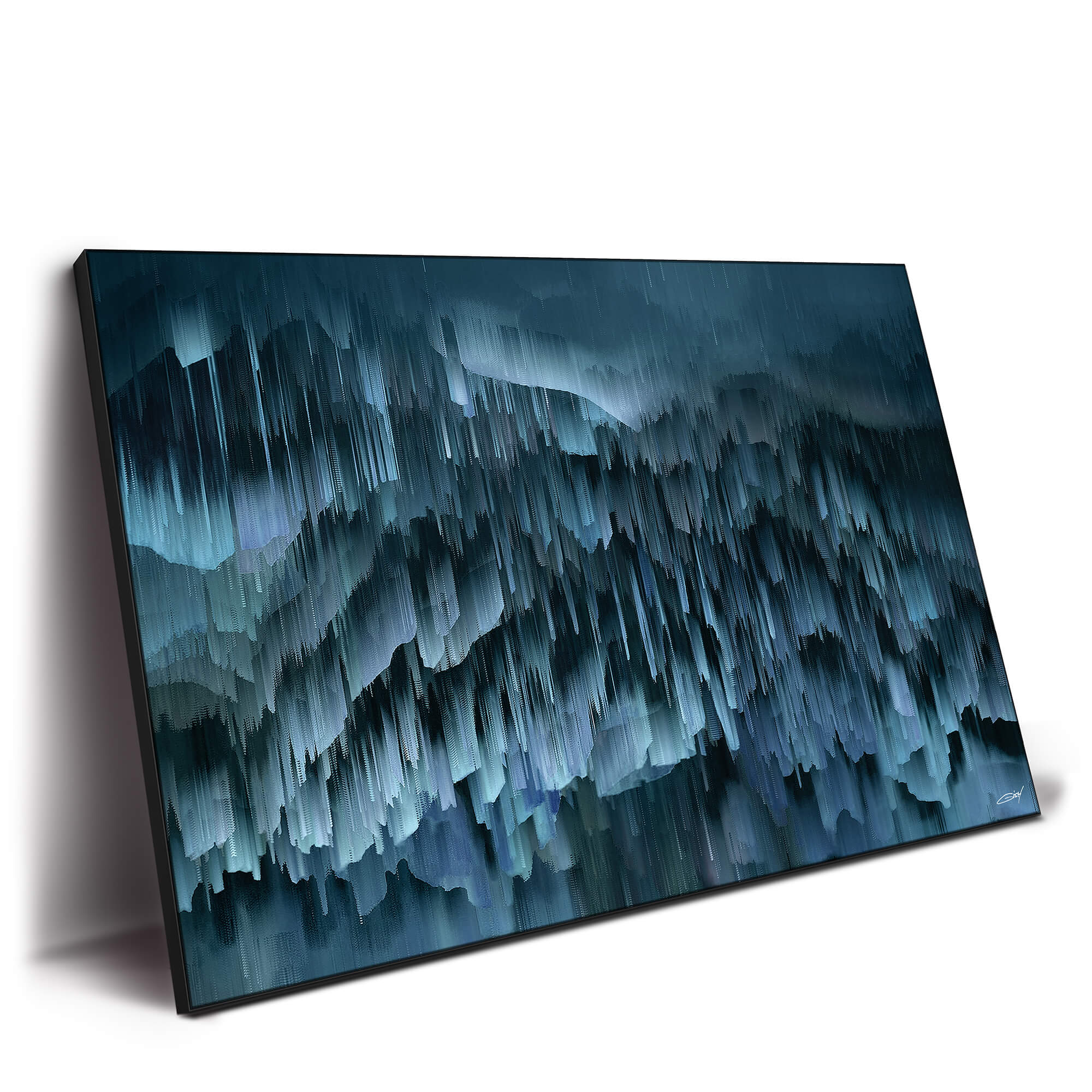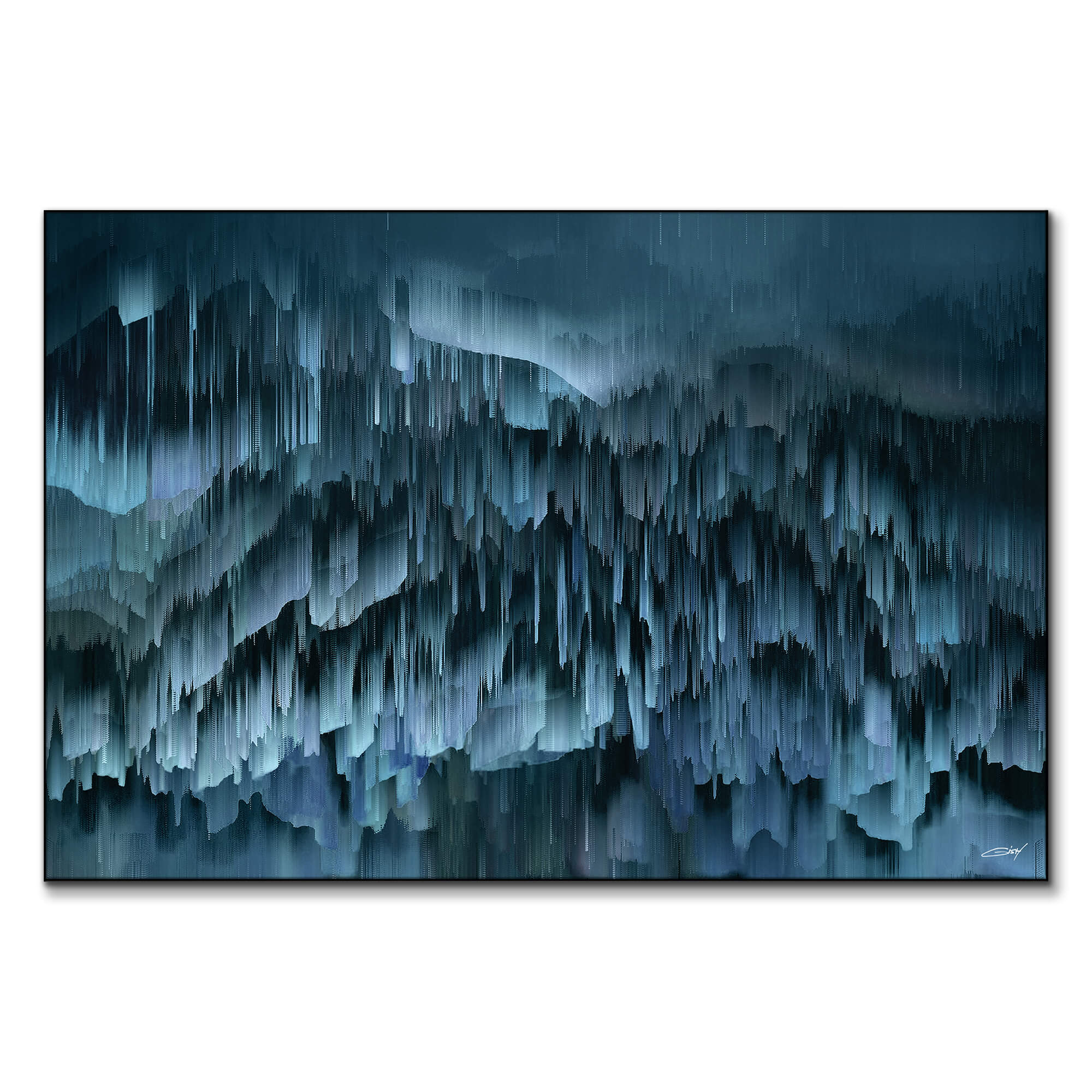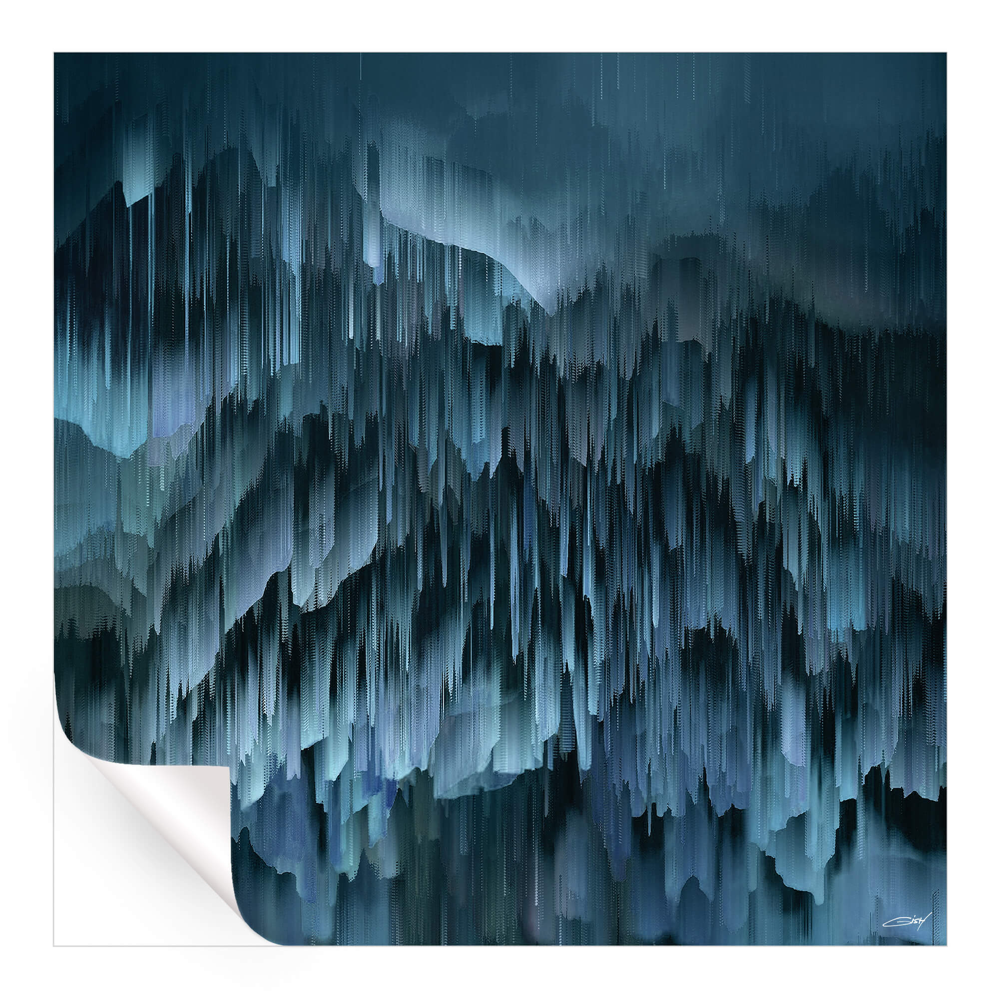 This digital abstract artwork is composed of slate blue tones that form a deep, calming texture. The sharp contrast between light and dark blues, blended in smooth waves, adds dimensionality and evokes a tranquil, contemplative feeling. The piece is perfect for adding a touch of serene abstraction to any space.