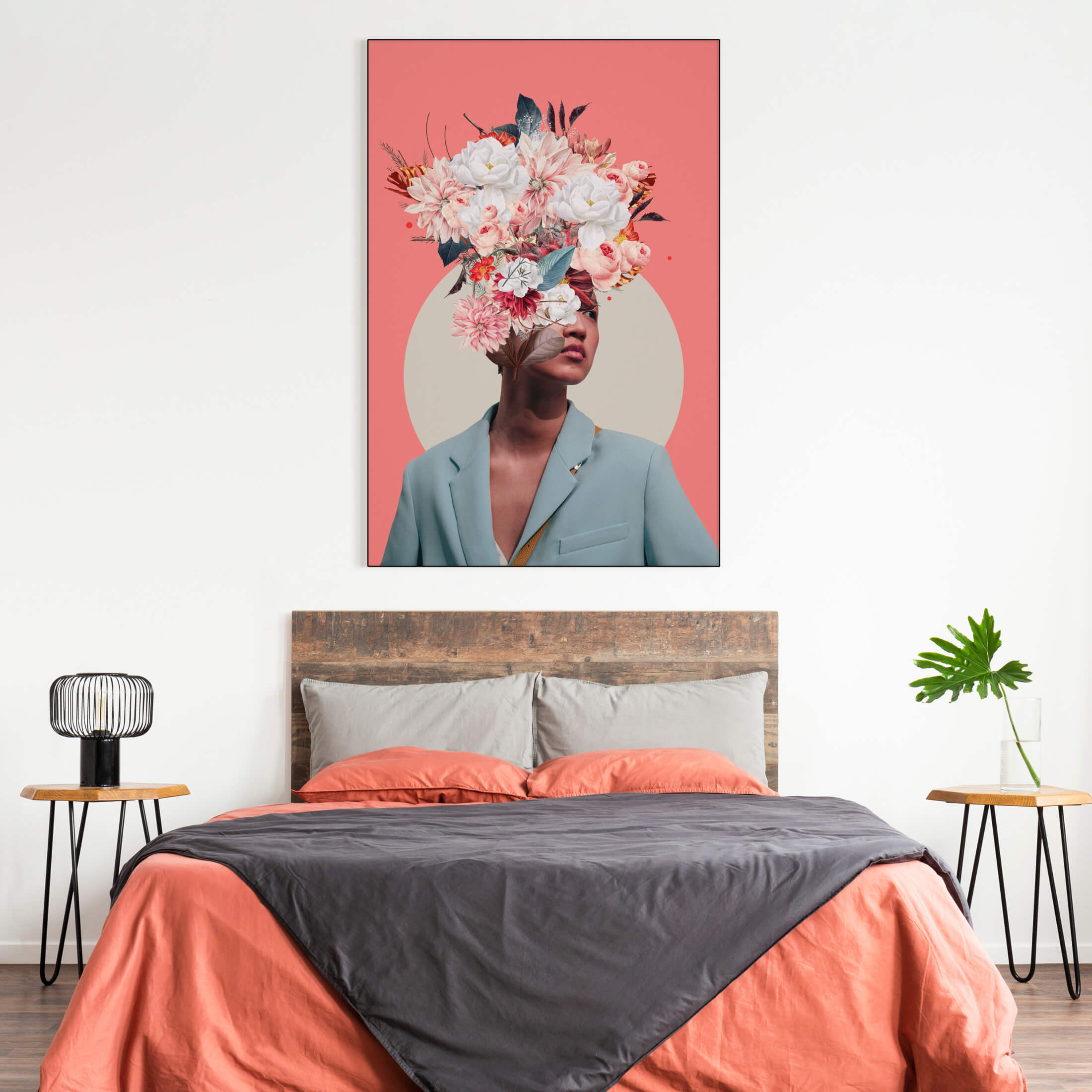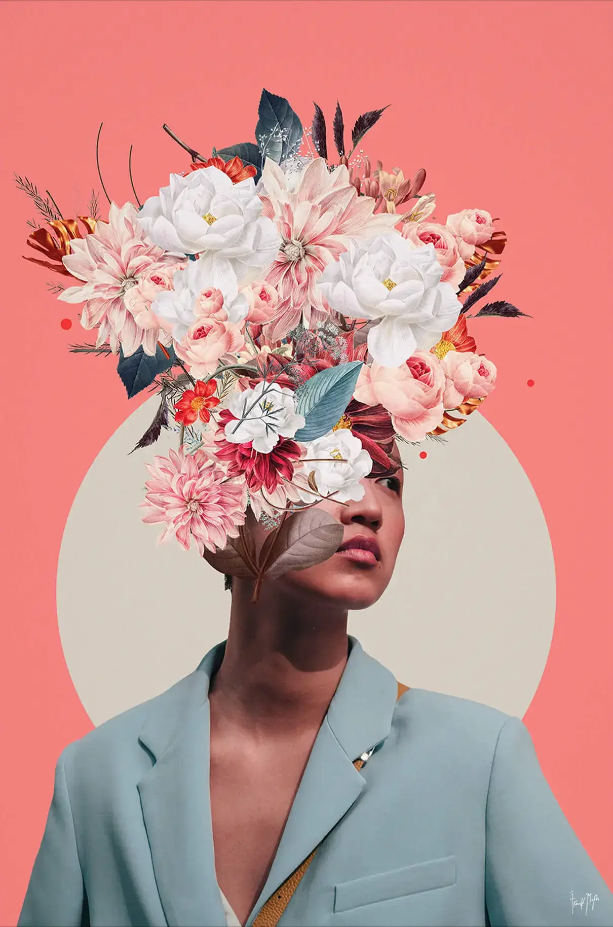 This contemporary floral portrait blends confidence and softness through color and form. A woman gazes upward beneath an explosion of white and pink blossoms, framed by a coral background and soft geometric shapes. The modern pastel palette creates balance—bold yet calming, striking yet serene.