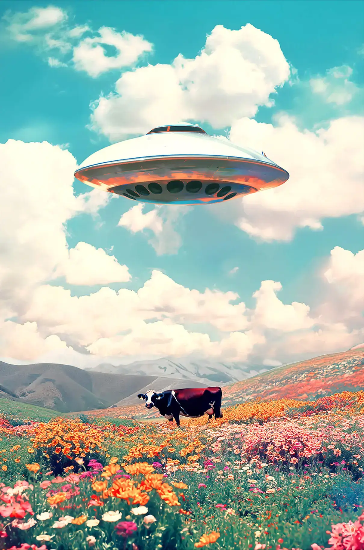 The cow’s calm expression contrasts with the strange presence of the UFO, blending everyday life with fantastical elements. The soft colors and tranquil setting draw the viewer into a surreal world where nature and extraterrestrial life collide, making this artwork a playful yet intriguing exploration of the unknown.