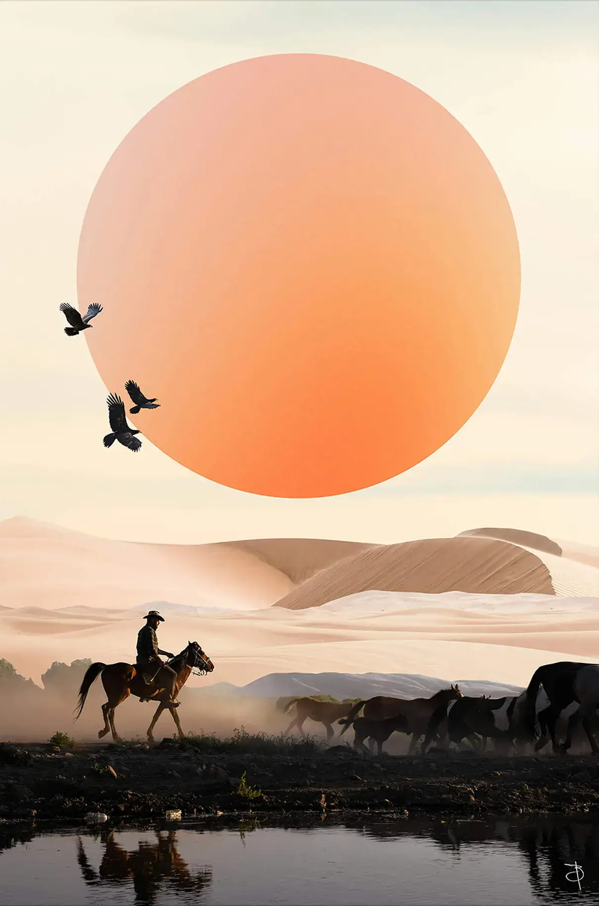 This stunning artwork captures a serene desert landscape at sunset, showcasing a cowboy on horseback guiding a herd of cattle. The large, soft orange sun looms over the horizon, casting a warm glow on the scene. Silhouetted against the vibrant sky, birds take flight, adding a sense of movement to the tranquil atmosphere. The rich colors of the sandy terrain and the reflections in the water create a peaceful, nostalgic vibe, reminiscent of classic Western themes.