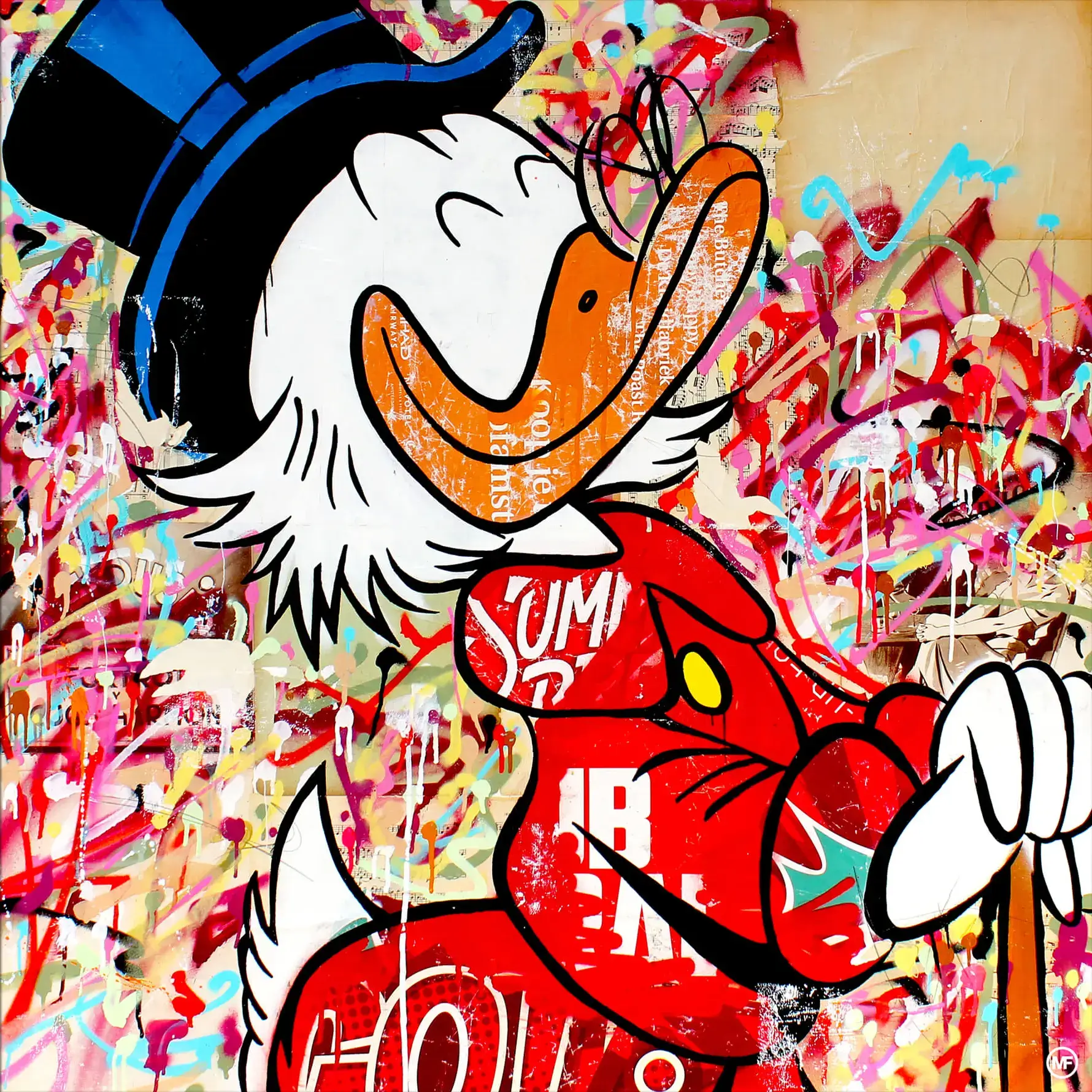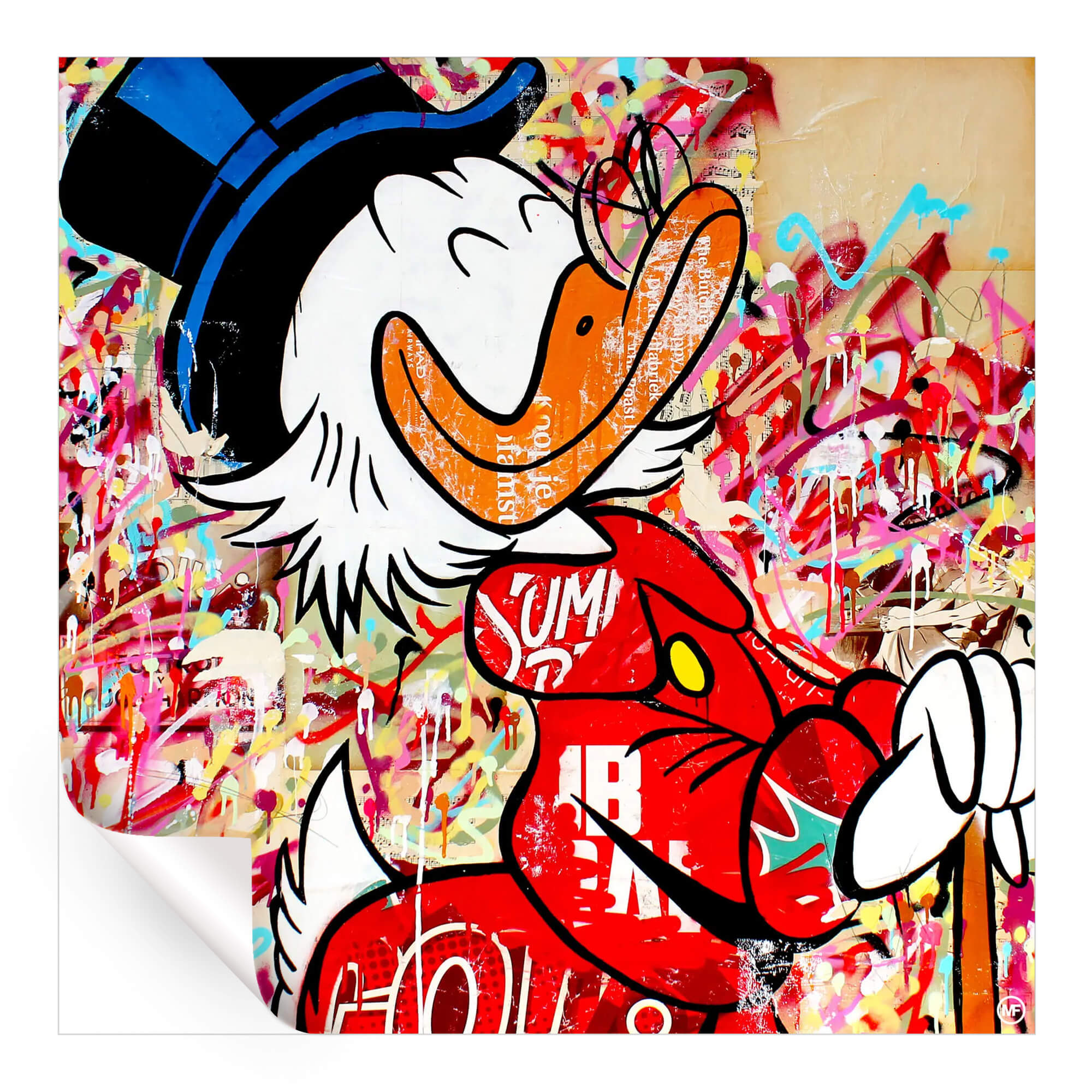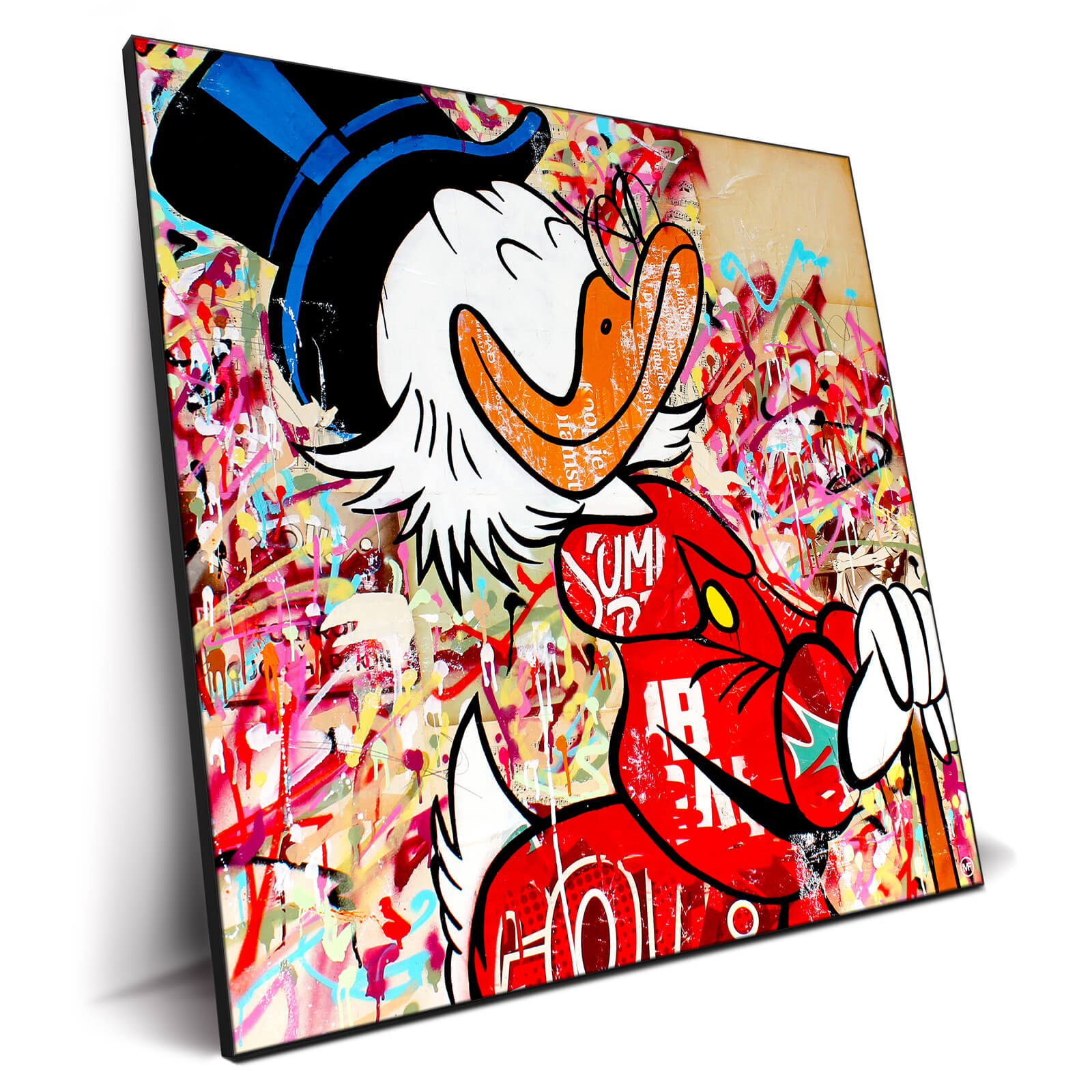 Embark on an adventure of wealth with this striking pop art tribute to the one and only, Scrooge McDuck. A fusion of classic character charm and contemporary chaos, the artwork is a riot of color, with Scrooge’s iconic top hat and spectacles framing his beak that seems to burst from the print. Set against a backdrop of splattered and layered graffiti, the piece evokes the hustle and excitement of Duckburg’s adventures.