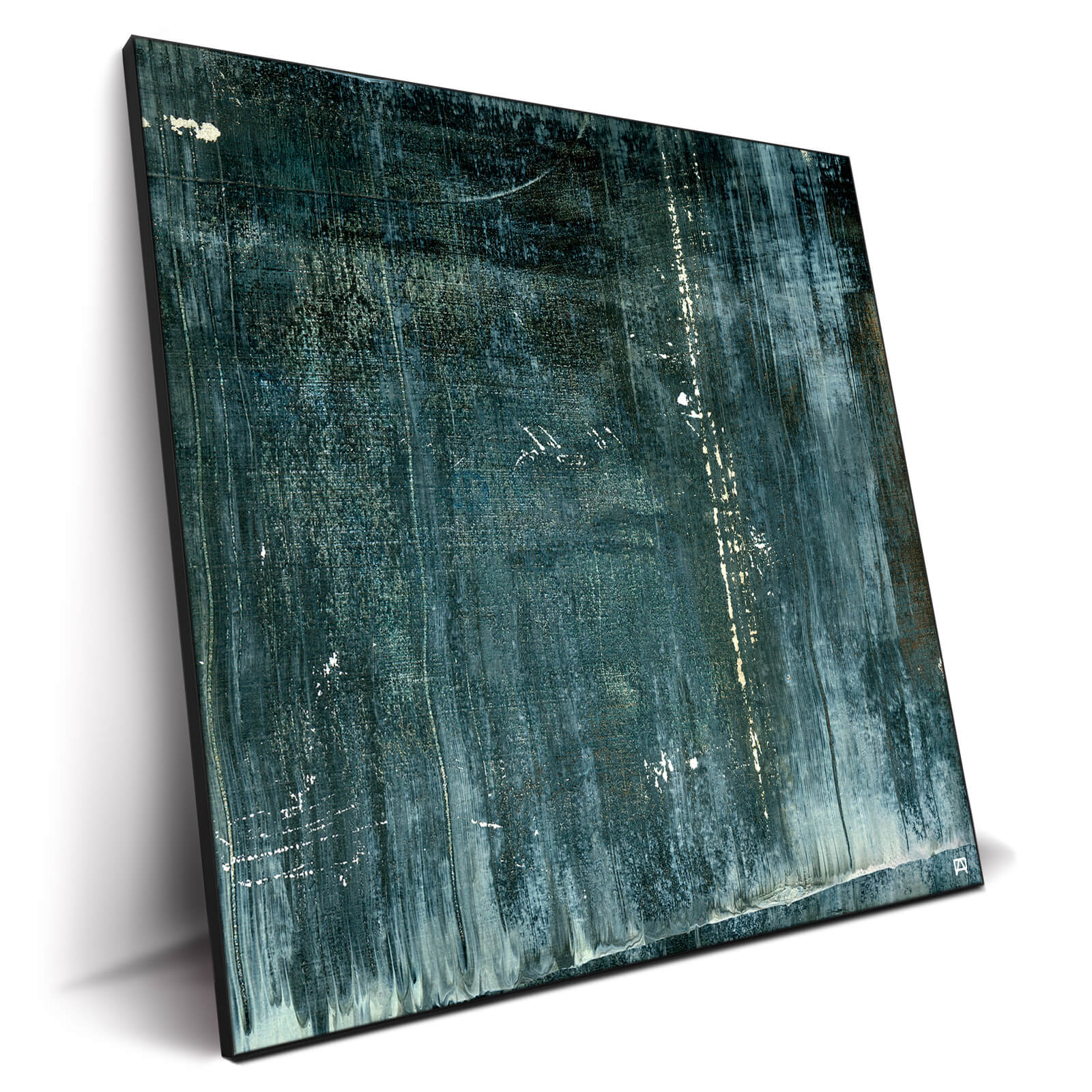 Bewitched by dark, moody colors, this dark green abstract art features an overlay of scuff marks that suggest aging.