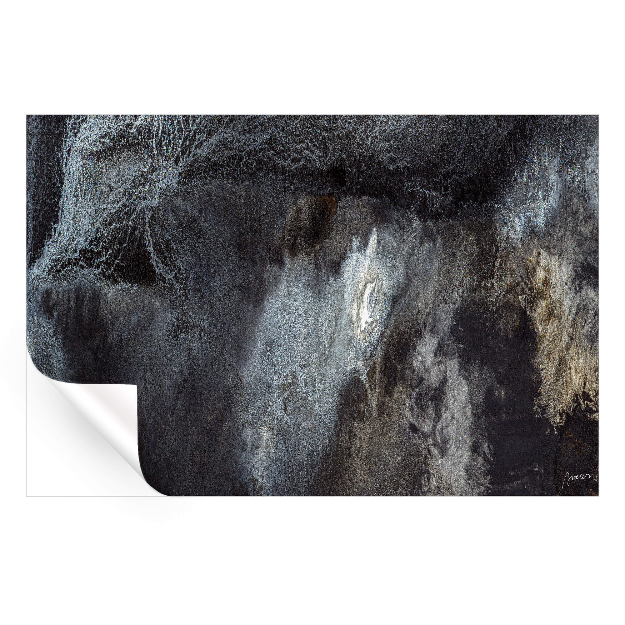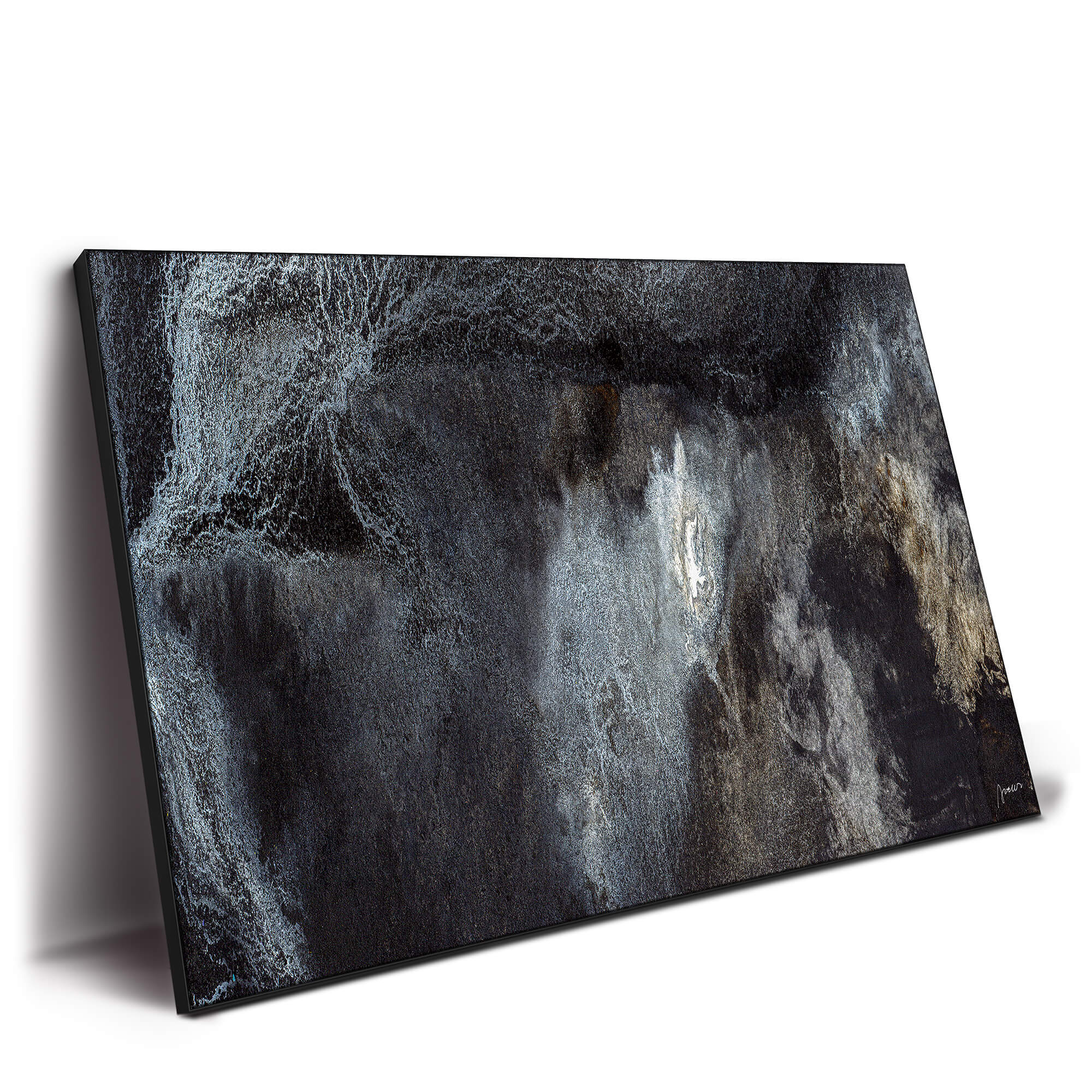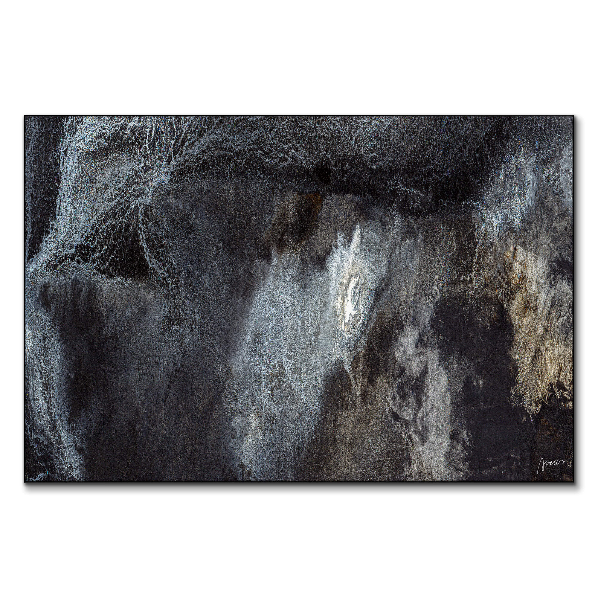 Layers of deep charcoal, black, and subtle neutral tones create a dramatic yet refined composition. Textural elements emerge from the dark background, providing a sense of depth and mystery. This abstract piece brings an industrial, moody vibe to any room.