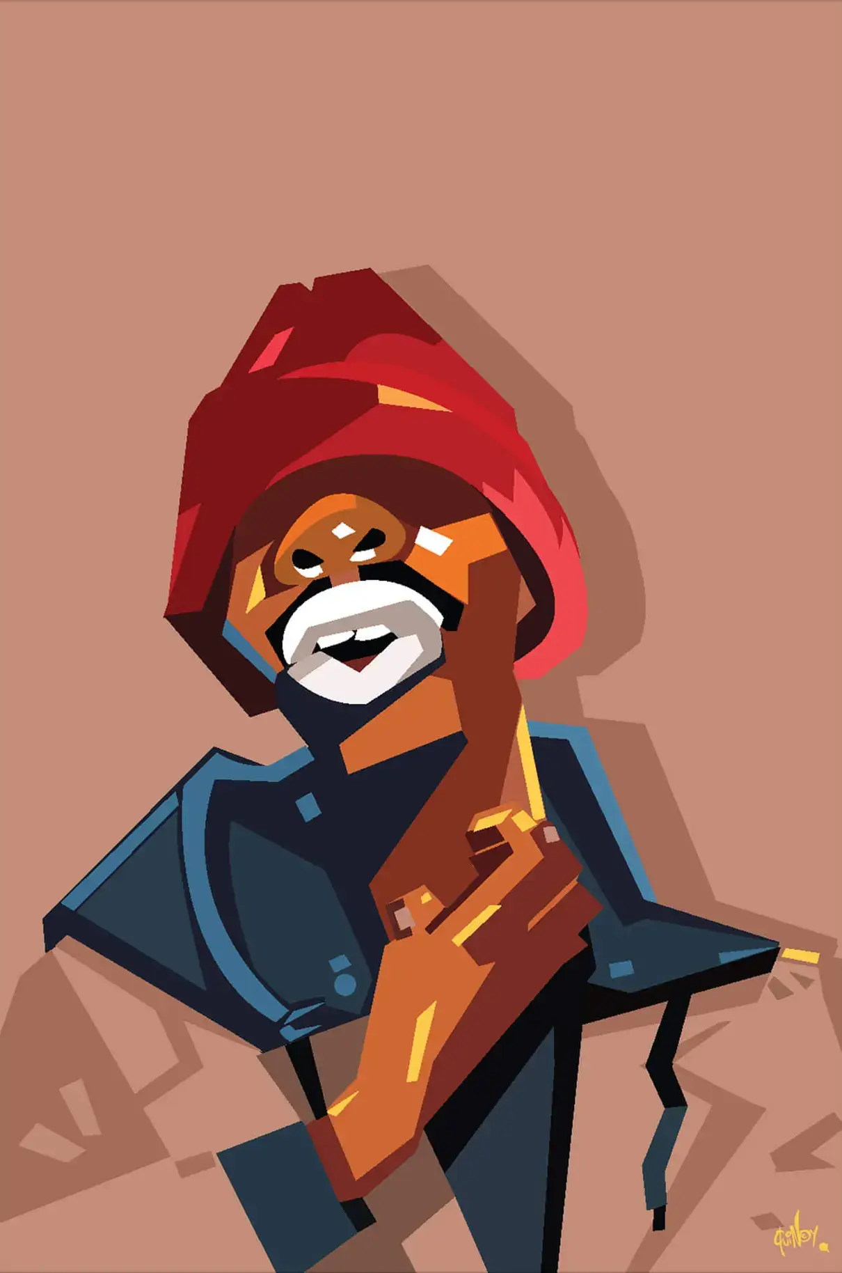 Famed comedian Dave Chappelle is dressed as one of his iconic characters, wearing his signature red hat. Wearing a blue jacket, his hand placed on his neck and his white lips are referencing the character’s famous bit. The art is humorous and has lots of colorful shapes that make it look fun and modern.