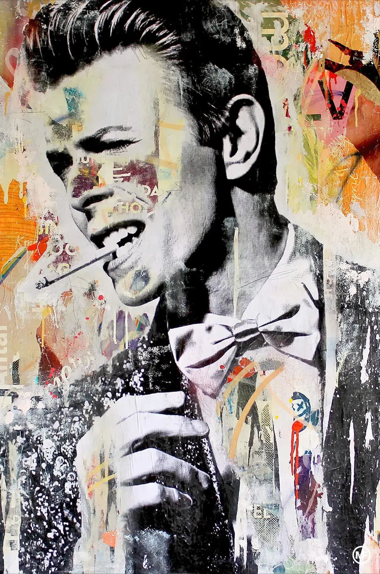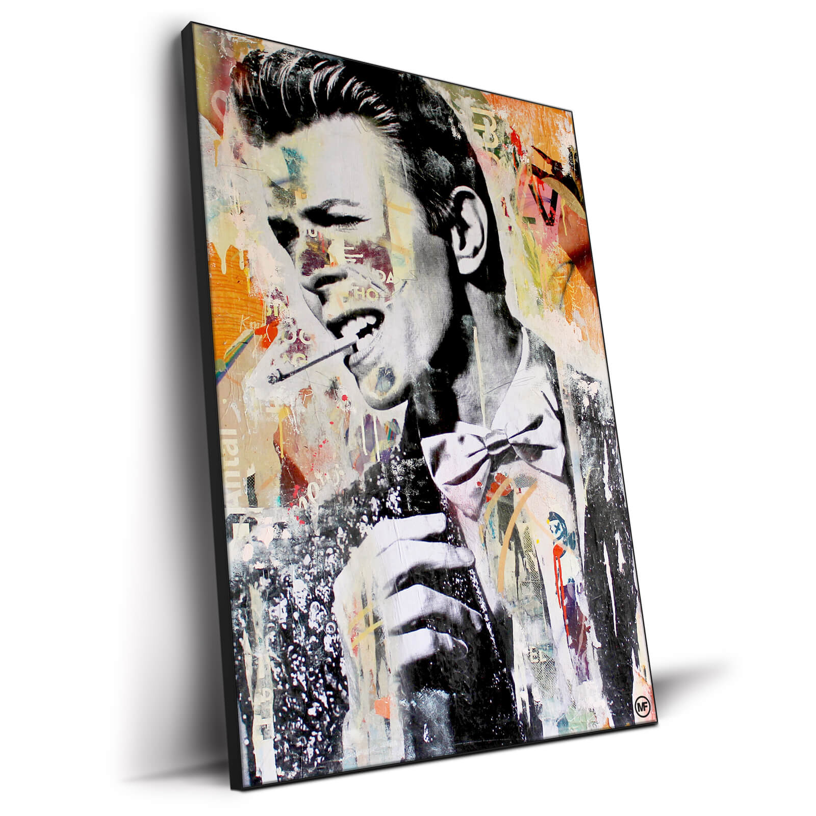 The piece highlights Bowie’s signature allure, with his contemplative gaze and iconic style brought to the forefront amidst a riot of abstract expression. Swathes of bold colors and erratic brush strokes reflect the restless creativity and reinvention he was famed for. Perfect for aficionados of music and modern art alike, this piece is a tribute to an artist who defied genres and generations with his innovative work.