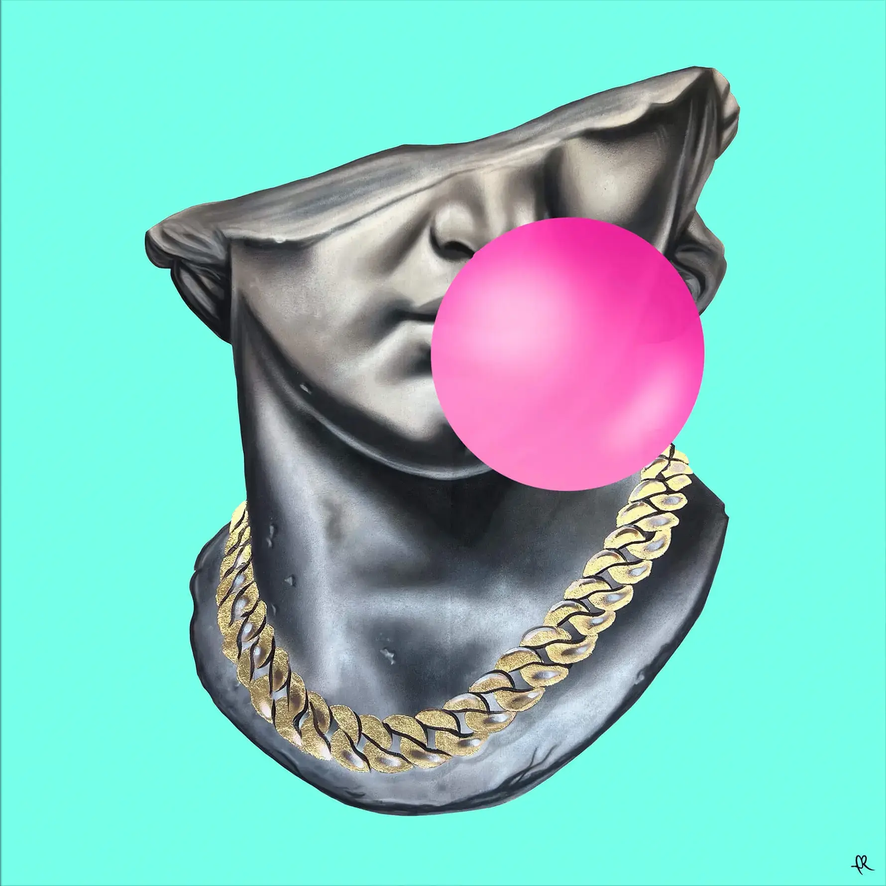 A surreal reinterpretation of the David statue, this artwork places the figure against a bold teal background. The marble bust sports a shiny gold chain and a playful pink bubblegum bubble, creating a juxtaposition of old-world elegance and modern pop art culture. The bright color palette enhances its contemporary appeal.