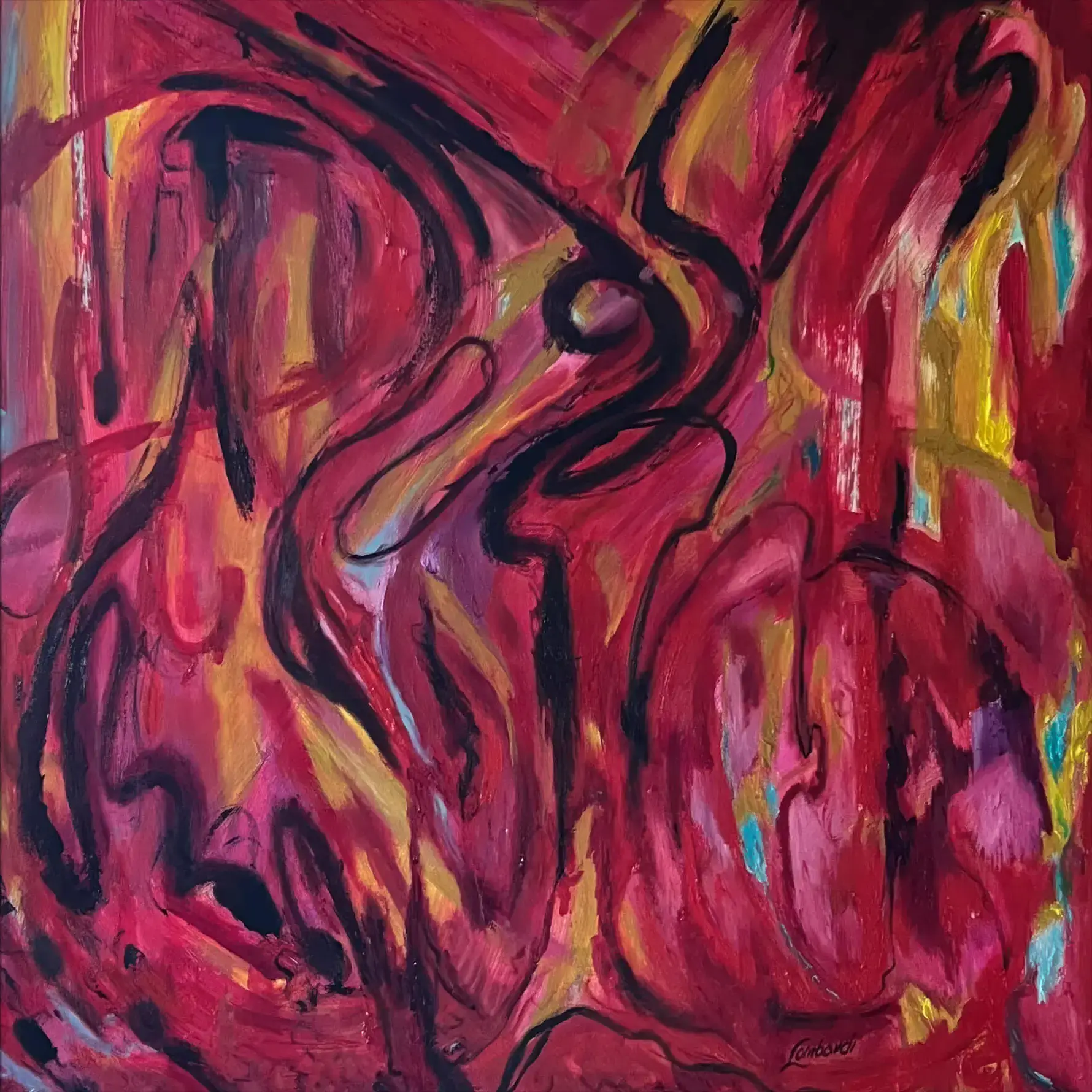 Deep reds and vibrant pinks twist and turn in this abstract creation by Bob Lombardi, suggesting a sense of fluidity and movement. Dark outlines meander through the painting, providing structure to the otherwise unrestrained forms.