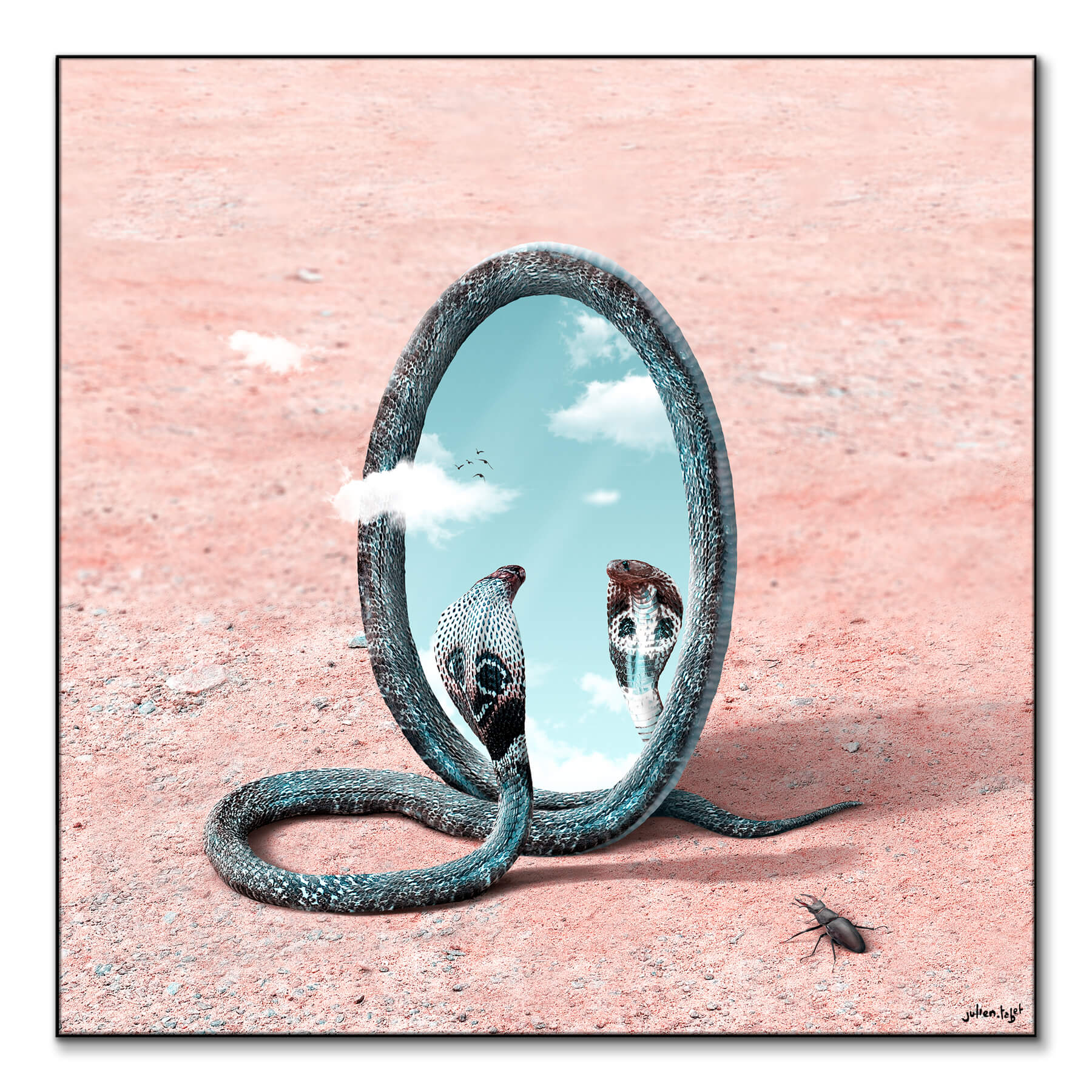As the snake gazes into its reflected image, the scene captures a unique introspection, a dialogue between reality and illusion crafted by Julien Tabet.