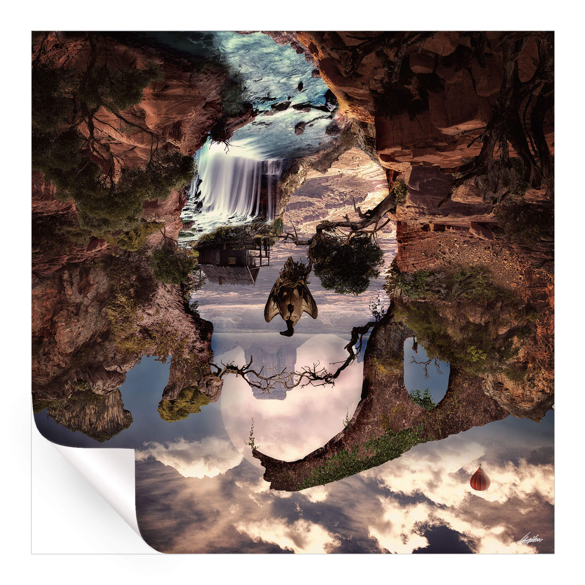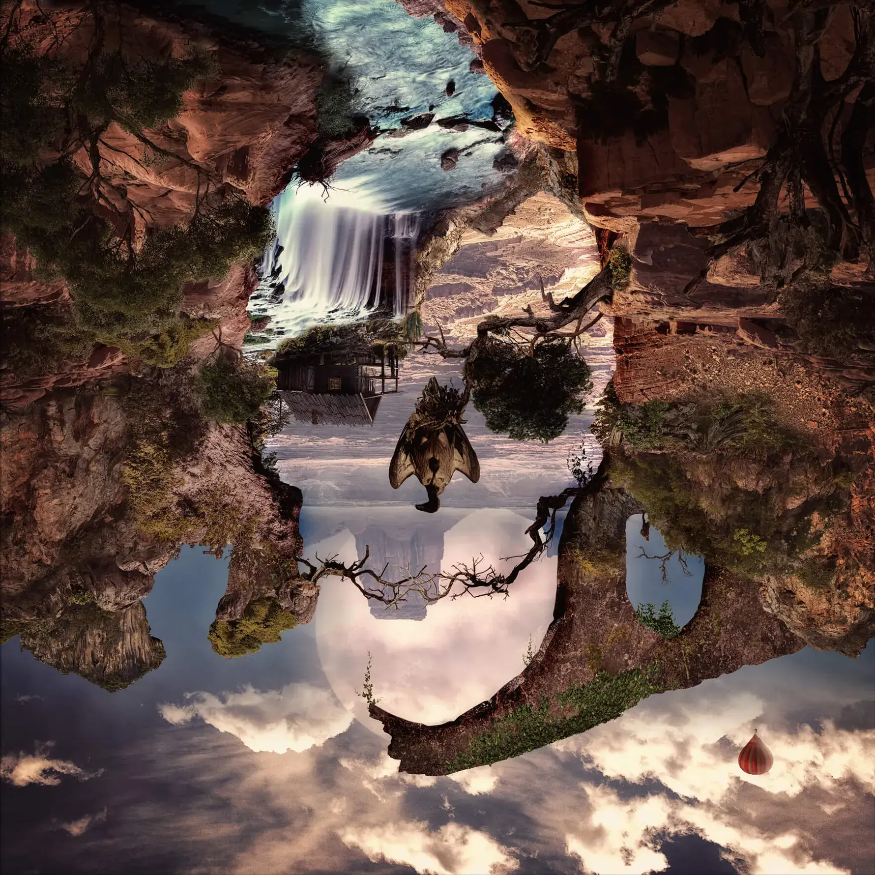 A skull emerges, sculpted by the stark contrasts of a desert landscape, where rugged cliffs form its hollows and a waterfall graces its face. Artist Ali Gulec captures the essence of survival, depicting a thriving oasis within the embrace of the wilderness.