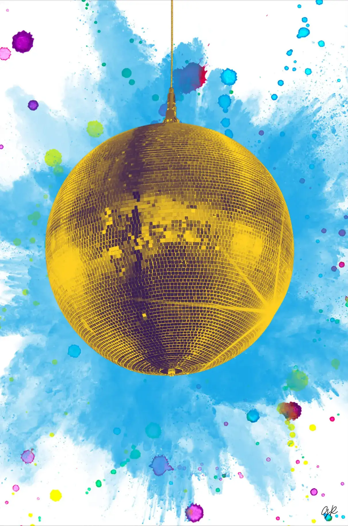 A dazzling golden disco ball hangs against a splashy, vibrant backdrop. The sphere’s intricate mosaic catches the light, suggesting a dance floor’s dynamism and energy. Around it, explosive watercolor bursts in blues, purples, and yellows create a celebratory atmosphere, as if the ball has set the surrounding colors into joyous motion.