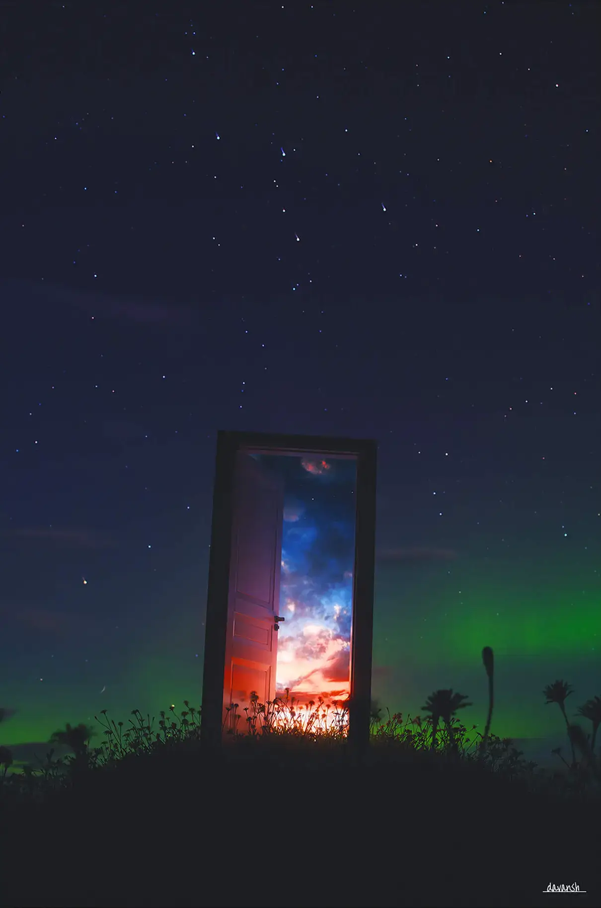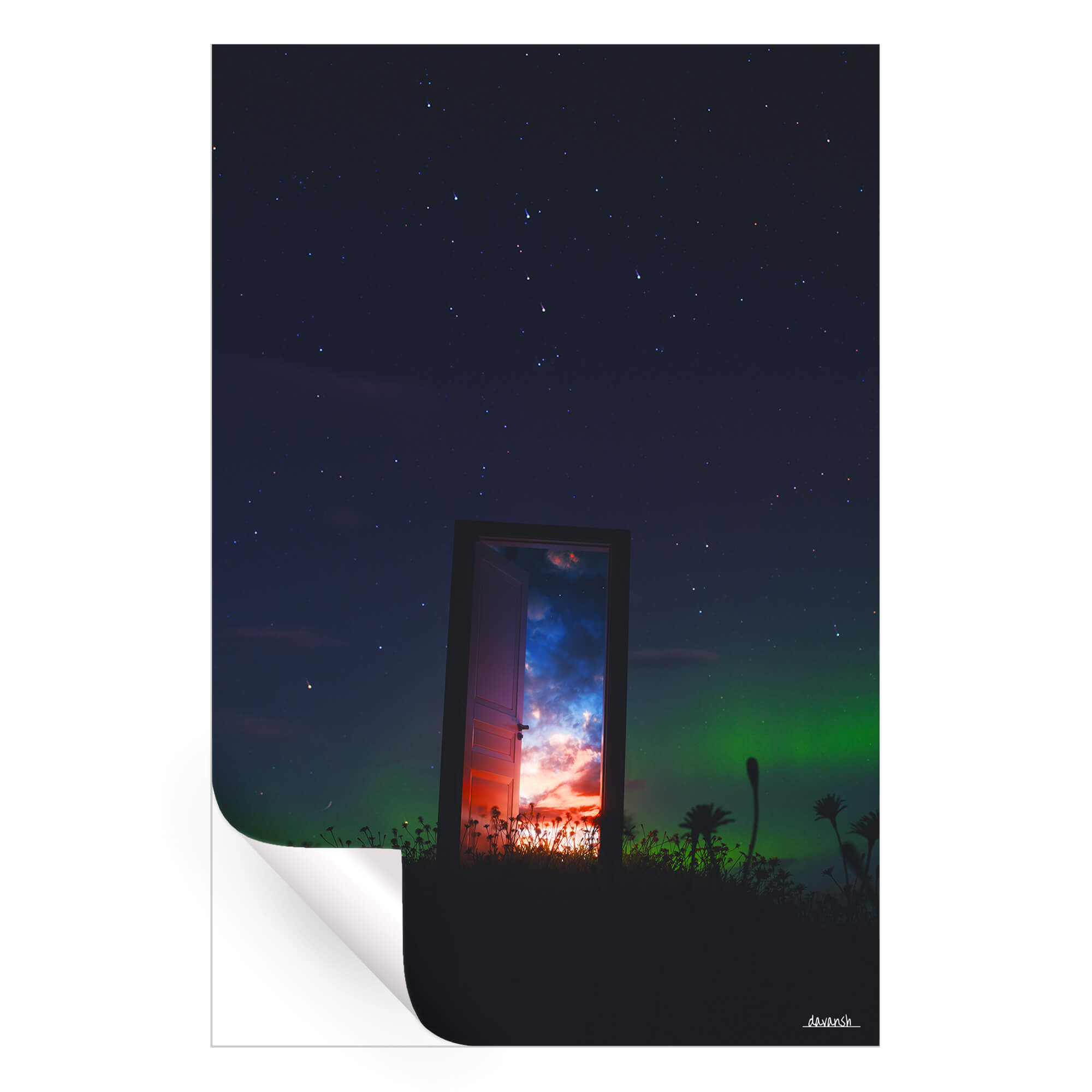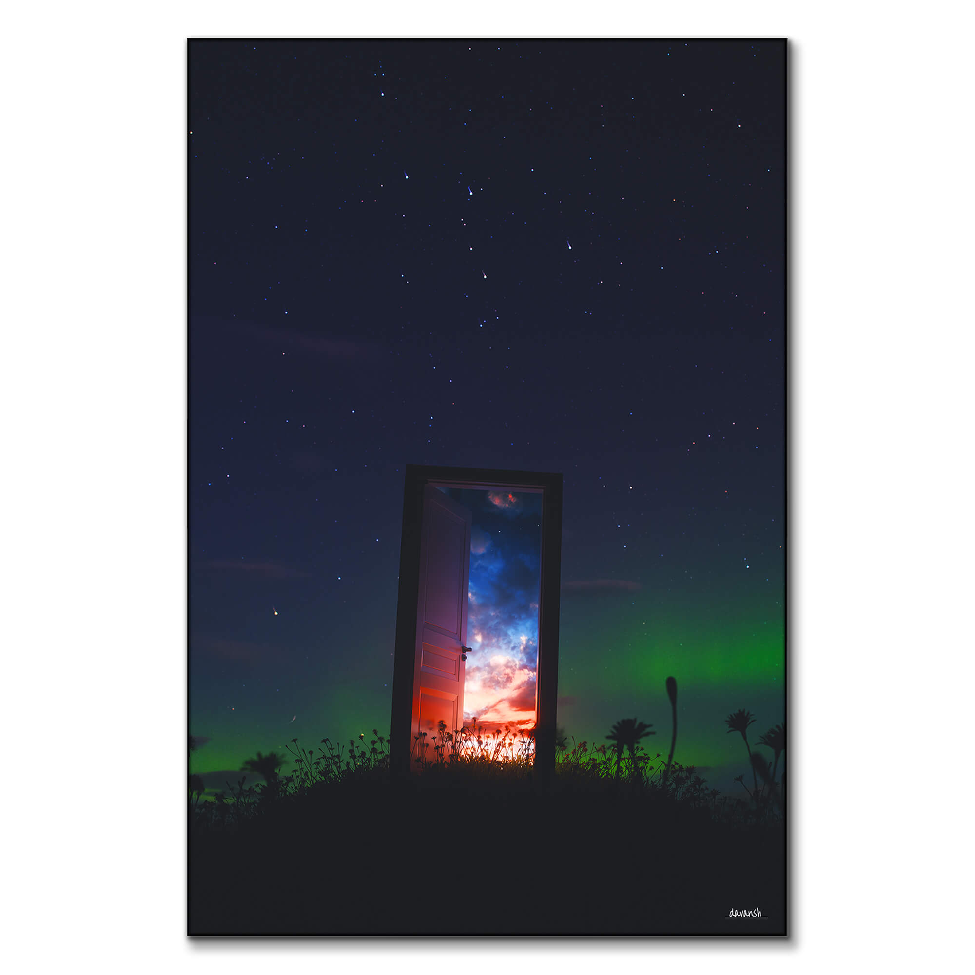Under a star-filled night sky, a single open door glows with light, revealing a radiant horizon beyond. The contrast between the dark landscape and the vibrant, colorful portal creates a surreal sense of wonder and possibility. The blending of cosmic blues and warm sunset tones makes the piece feel infinite—both grounded and otherworldly.