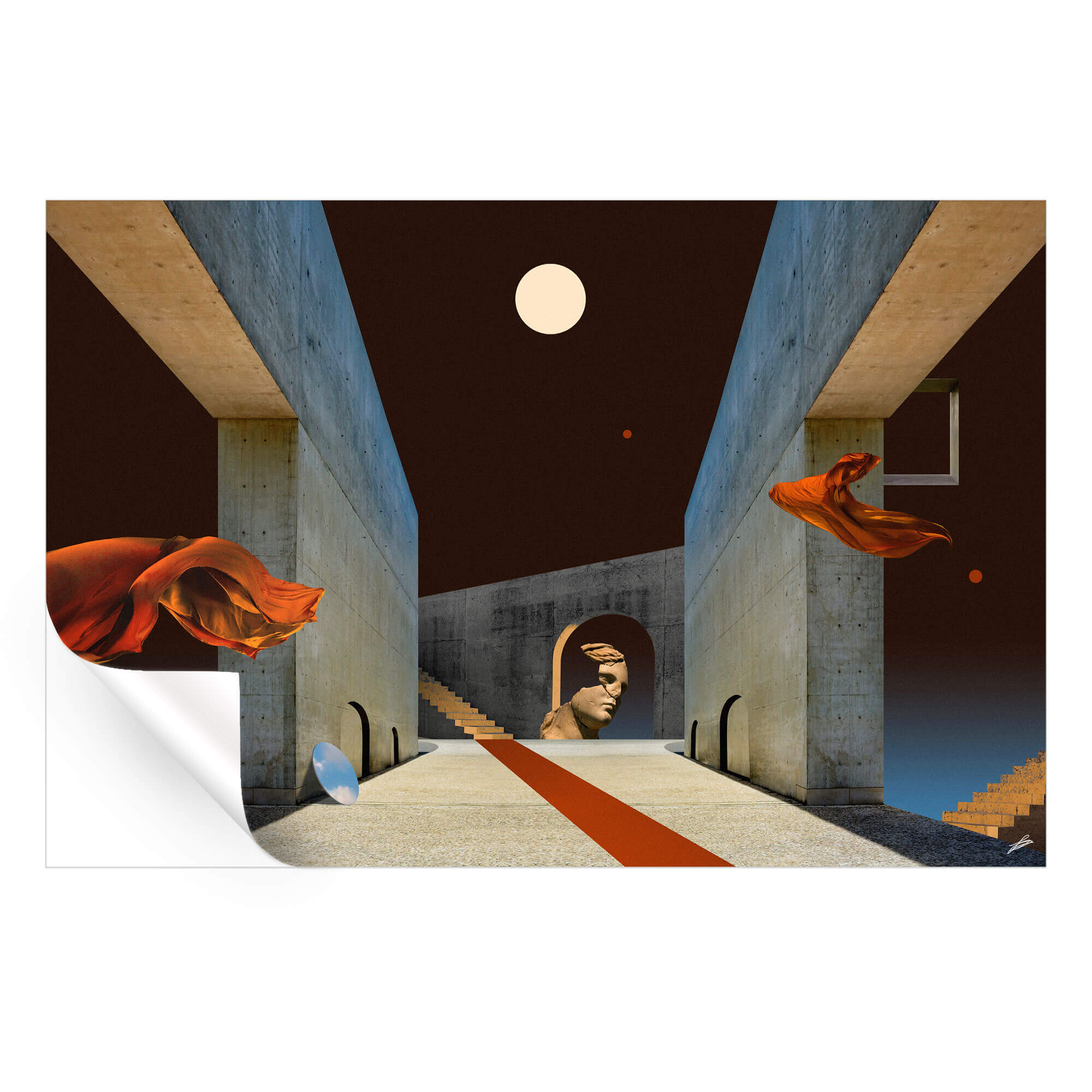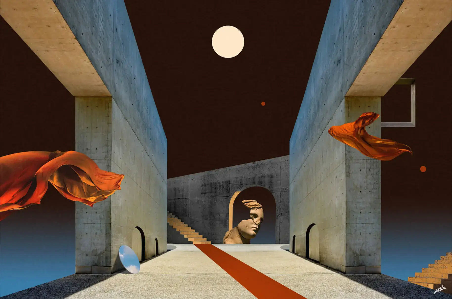 Architectural symmetry forms a corridor drawing the eye towards a classical sculpture head, with flowing orange fabrics adding a dynamic contrast to the concrete starkness. Surreal elements like celestial orbs and a sharp red line on the ground infuse the scene with a dreamlike quality and otherworldly serenity.