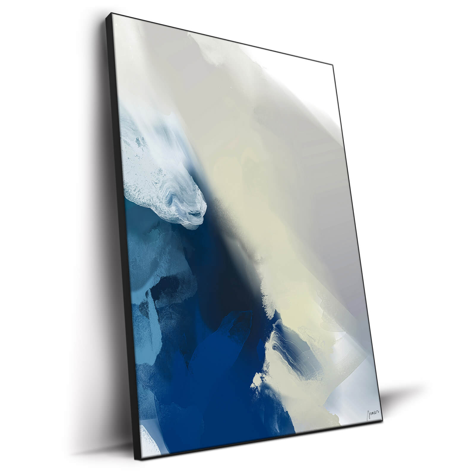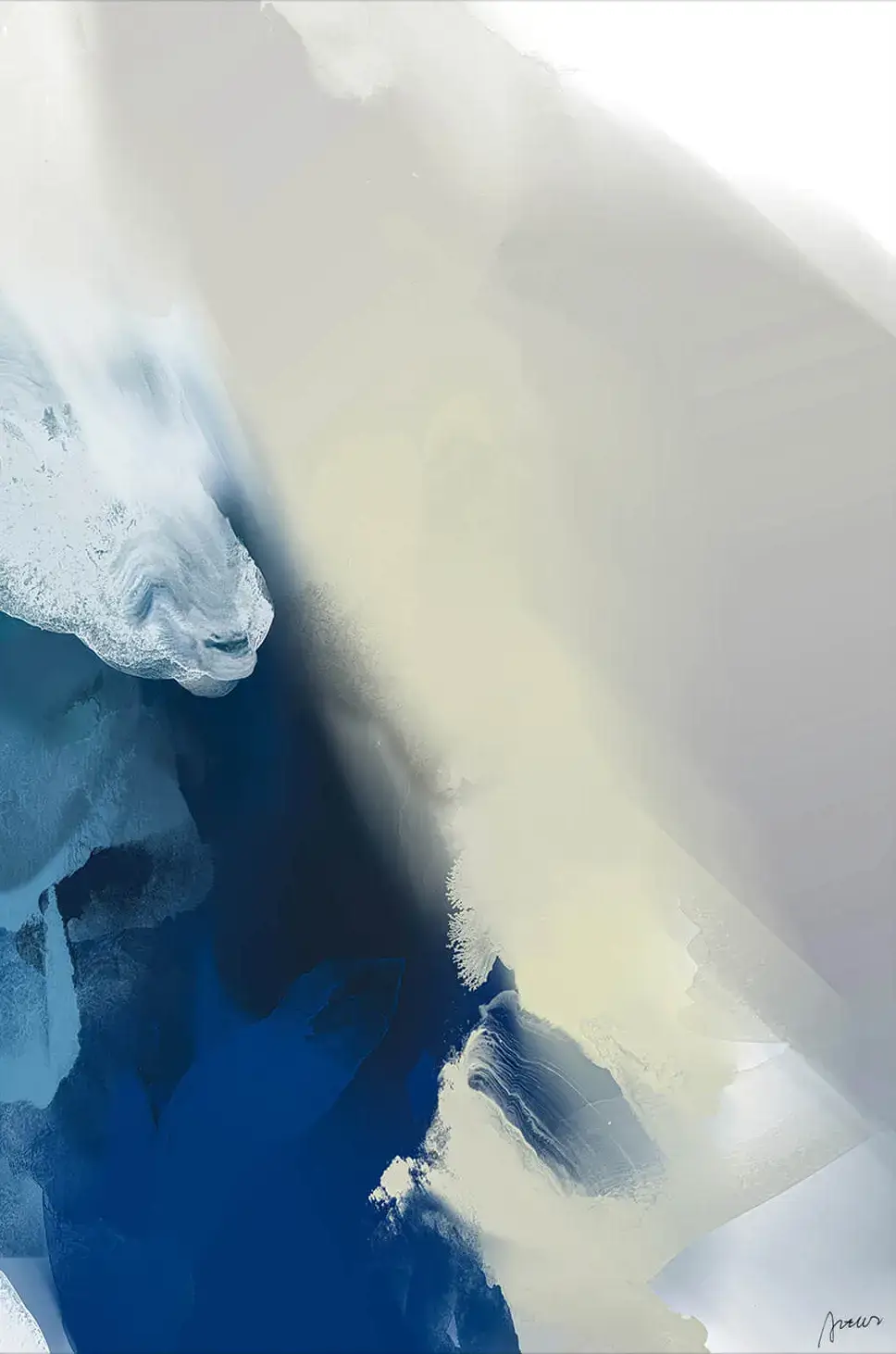 A spectrum of blues, from deep navy to the palest azure, sweeps across the artwork, giving way to a mist of white that dominates the upper region. The play between colors suggests an aerial view of a rugged coastline, the elements bleeding into each other with both force and grace.